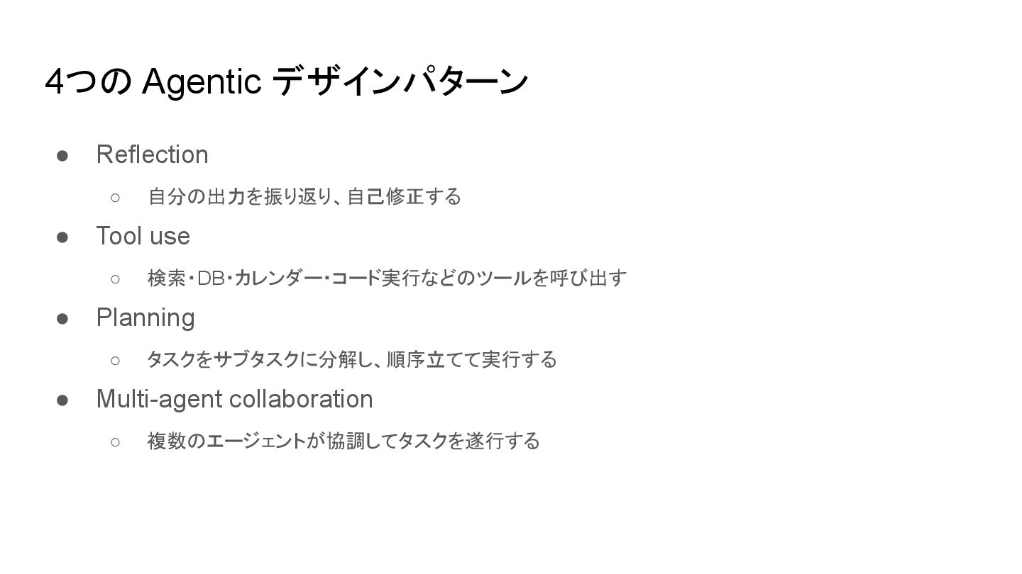 4つの Agentic デザインパターン • Reflection ◦ 自分の出力を振り返り、自己修正する • Tool use