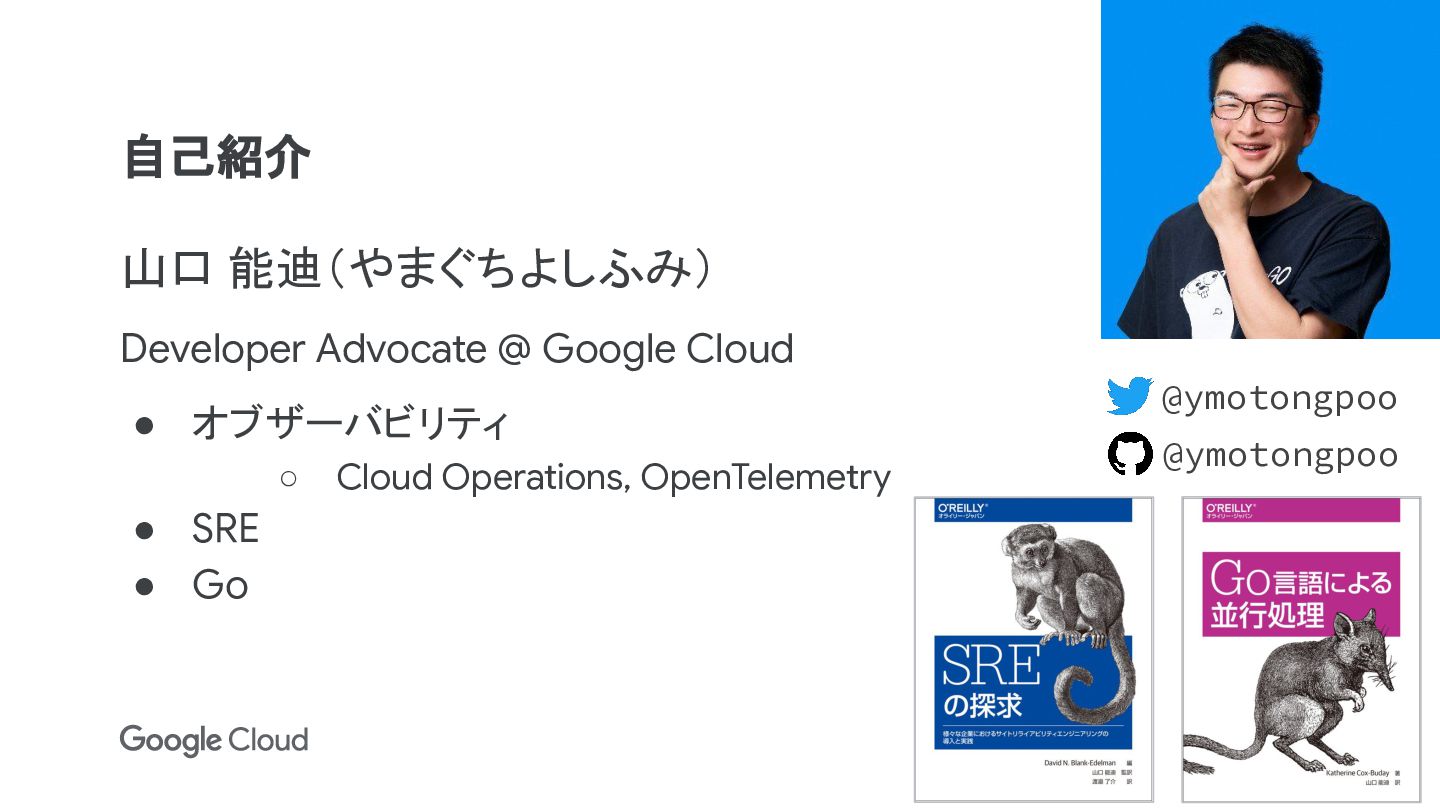 Cloud Operations, OpenTelemetry • SRE • Go 自己紹介 @ymotongpoo @ymotongpoo