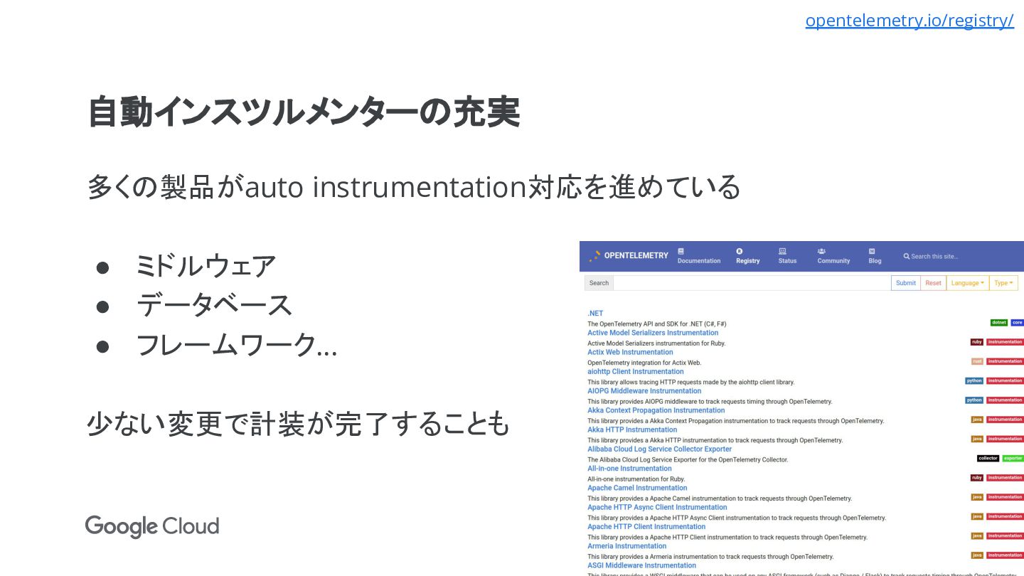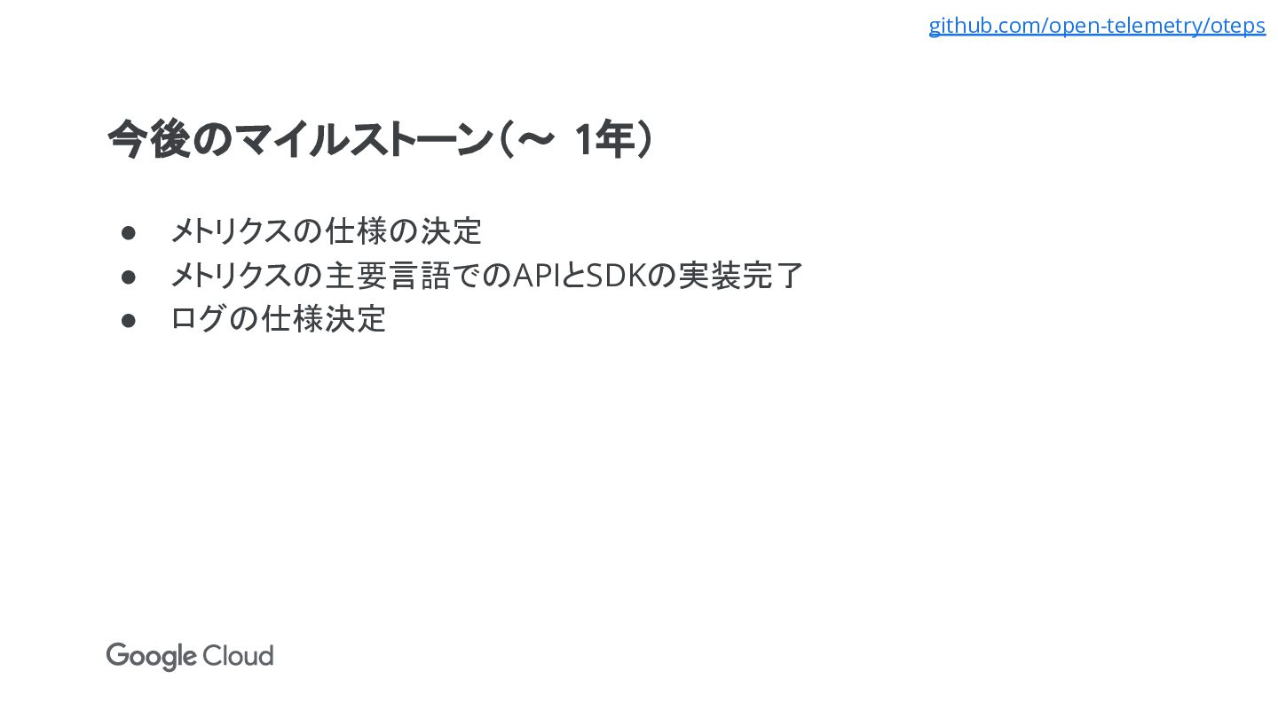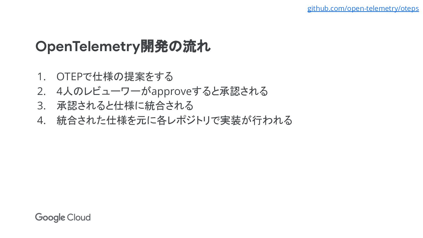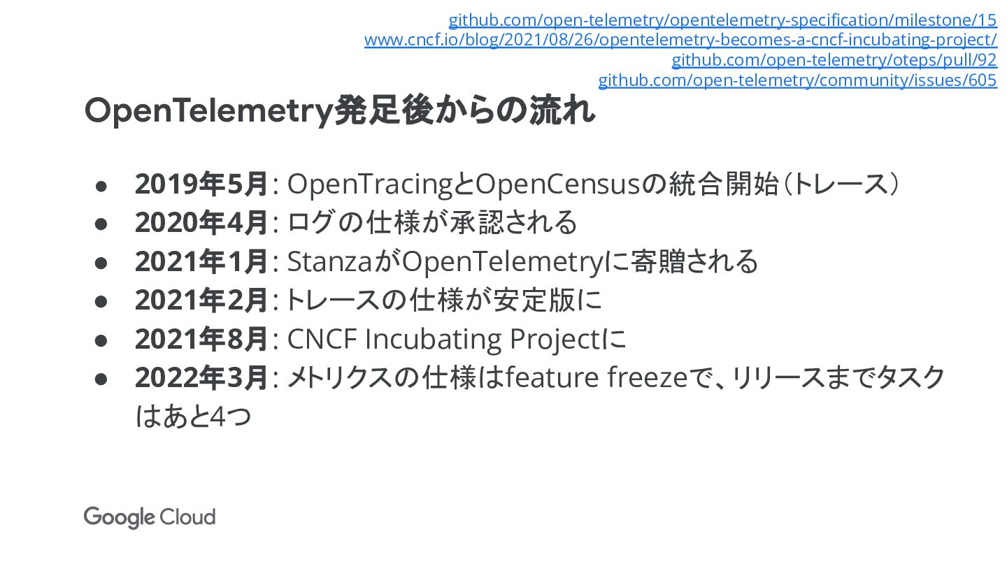 • 2021年2月: トレースの仕様が安定版に • 2021年8月: CNCF Incubating Projectに • 2022年3月: メトリクスの仕様はfeature freezeで、リリースまでタスク はあと4つ github.com/open-telemetry/opentelemetry-specification/milestone/15 www.cncf.io/blog/2021/08/26/opentelemetry-becomes-a-cncf-incubating-project/ github.com/open-telemetry/oteps/pull/92 github.com/open-telemetry/community/issues/605