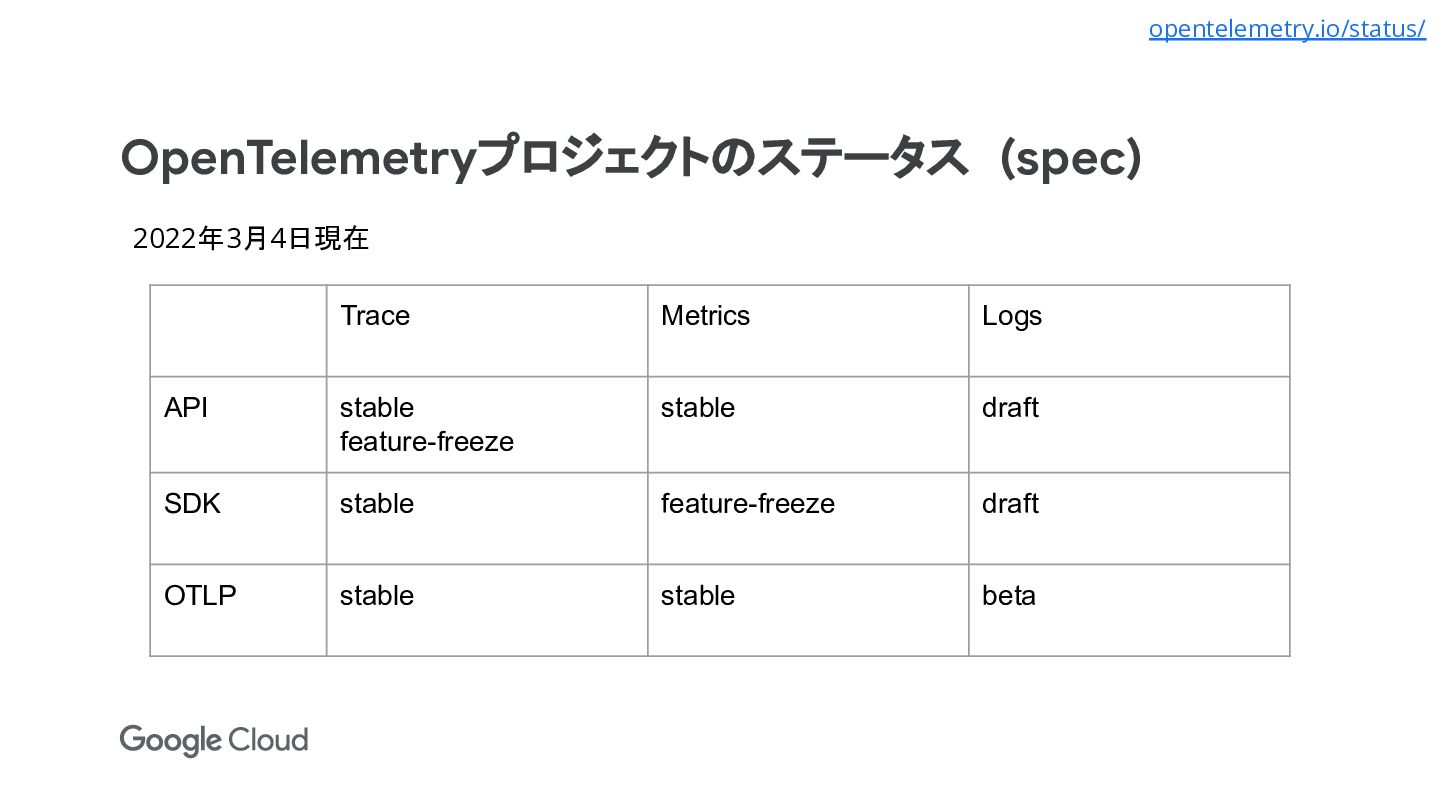 SDK stable feature-freeze draft OTLP stable stable beta 2022年3月4日現在 opentelemetry.io/status/