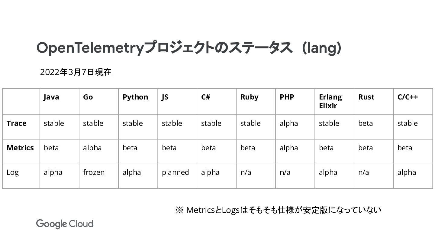 Erlang Elixir Rust C/C++ Trace stable stable stable stable stable stable alpha stable beta stable Metrics beta alpha beta beta beta beta alpha beta beta beta Log alpha frozen alpha planned alpha n/a n/a alpha n/a alpha ※ MetricsとLogsはそもそも仕様が安定版になっていない