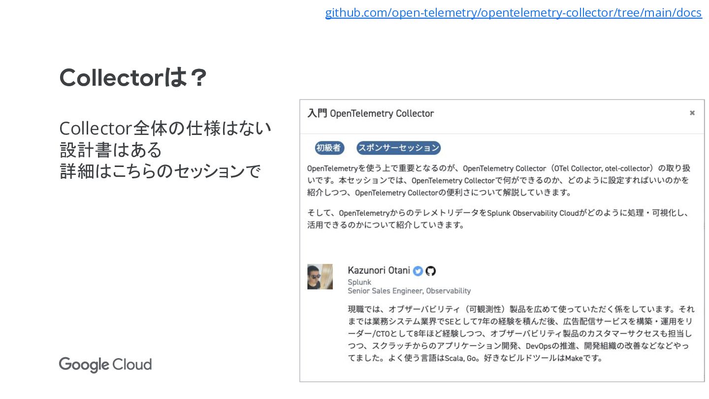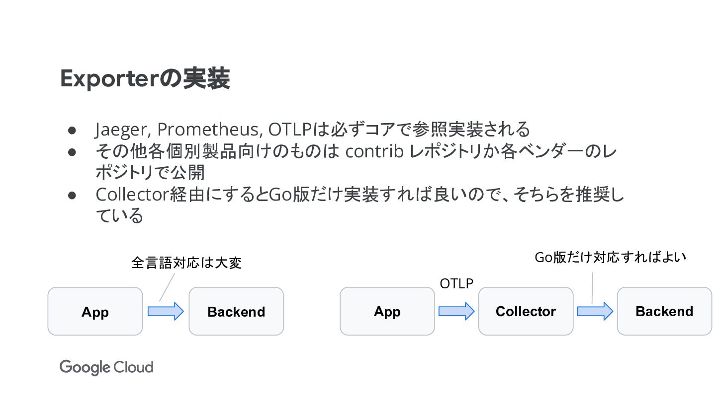 • Collector経由にするとGo版だけ実装すれば良いので、そちらを推奨し ている App Backend App Collector Backend OTLP 全言語対応は大変 Go版だけ対応すればよい