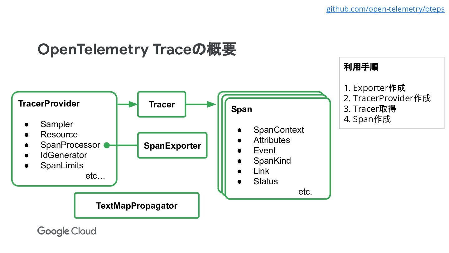 • IdGenerator • SpanLimits etc… Tracer SpanExporter Span • SpanContext • Attributes • Event • SpanKind • Link • Status etc. Span • SpanContext • Attributes • Event • SpanKind • Link • Status etc. Span • SpanContext • Attributes • Event • SpanKind • Link • Status etc. 利用手順 1. Exporter作成 2. TracerProvider作成 3. Tracer取得 4. Span作成 TextMapPropagator