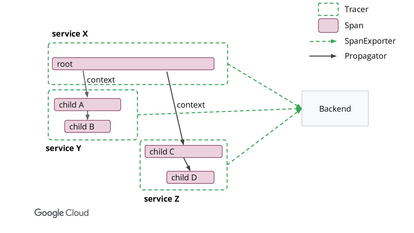 Y service X service Z context context Backend Tracer Span SpanExporter Propagator
