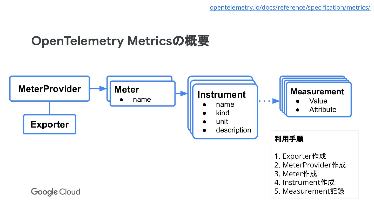 2. MeterProvider作成 3. Meter作成 4. Instrument作成 5. Measurement記録 Instrument • name • kind • unit • description Measurement • Value • Attribute Measurement • Value • Attribute Measurement • Value • Attribute Measurement • Value • Attribute Meter • name Instrument • name • kind • unit • description Instrument • name • kind • unit • description Exporter