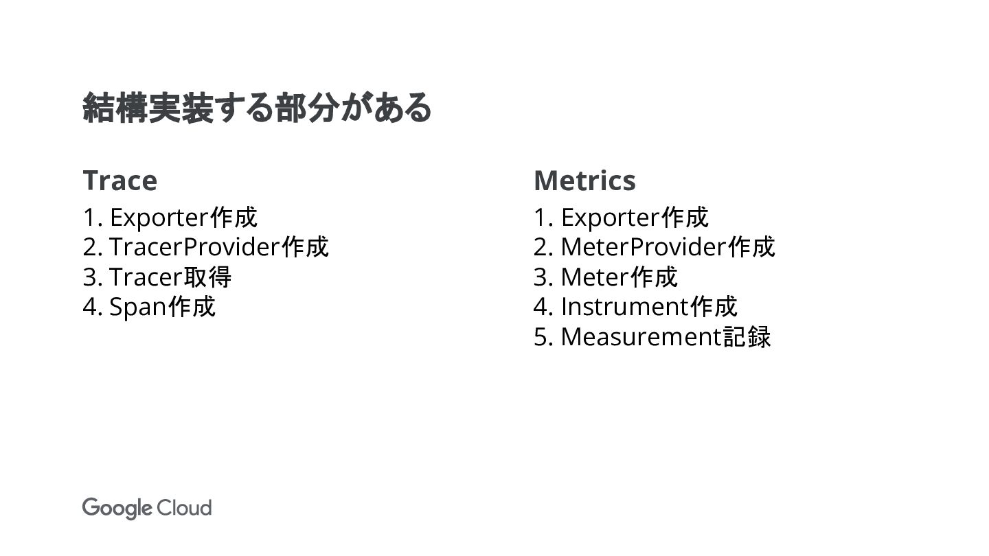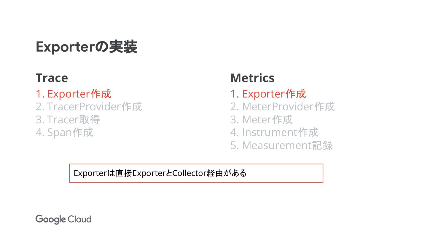 Metrics 1. Exporter作成 2. MeterProvider作成 3. Meter作成 4. Instrument作成 5. Measurement記録 Exporterは直接ExporterとCollector経由がある