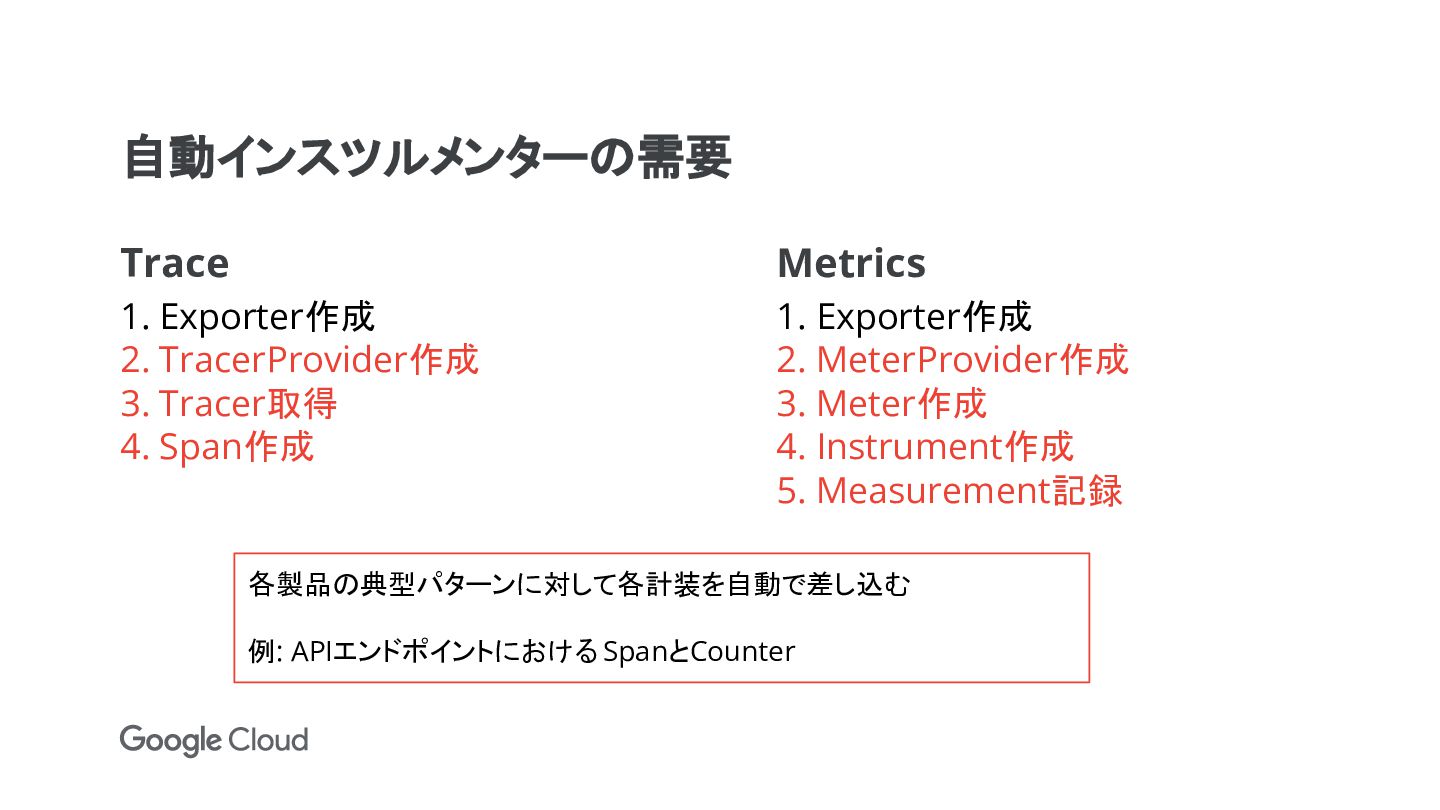 Metrics 1. Exporter作成 2. MeterProvider作成 3. Meter作成 4. Instrument作成 5. Measurement記録 各製品の典型パターンに対して各計装を自動で差し込む 例: APIエンドポイントにおける SpanとCounter