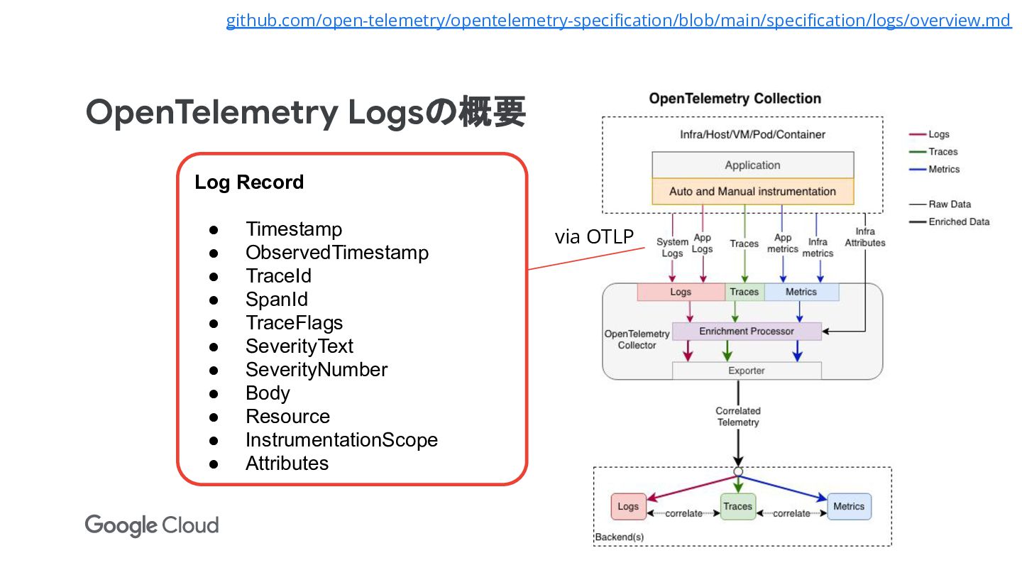 15. OpenTelemetry Logsの概要 github.com/open-telemetry/opentelemetry-specification/blob/main/specification/logs/overview.md Log Record • Timestamp • ObservedTimestamp •