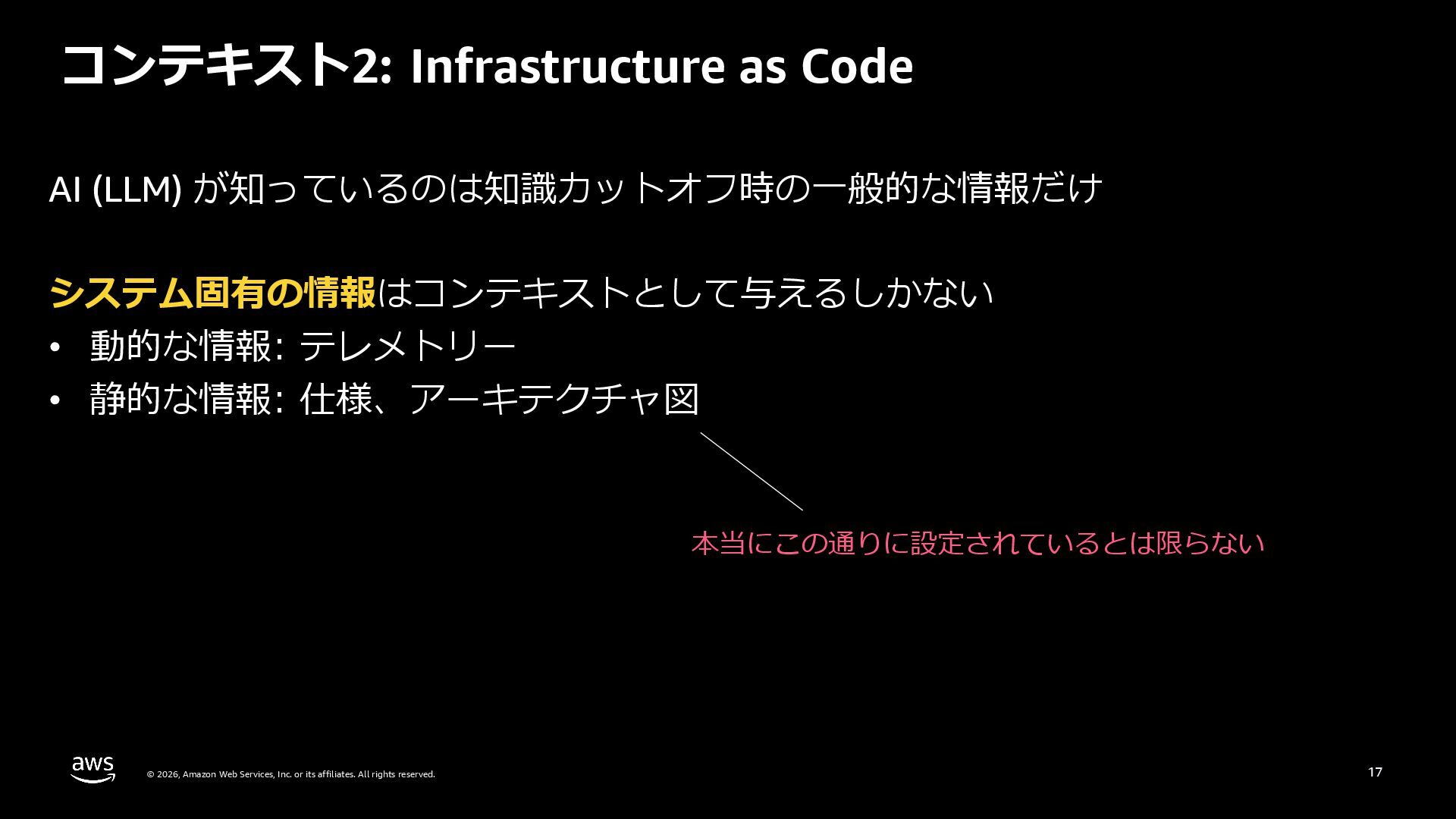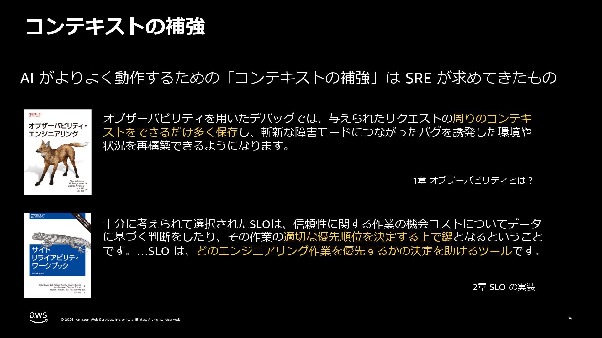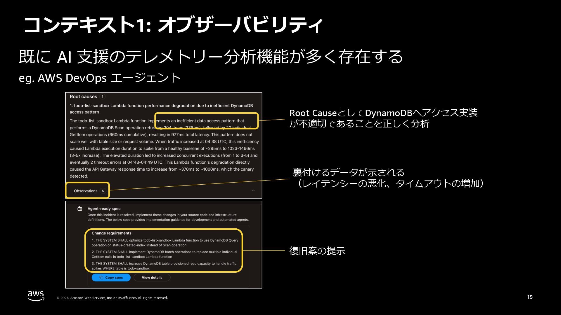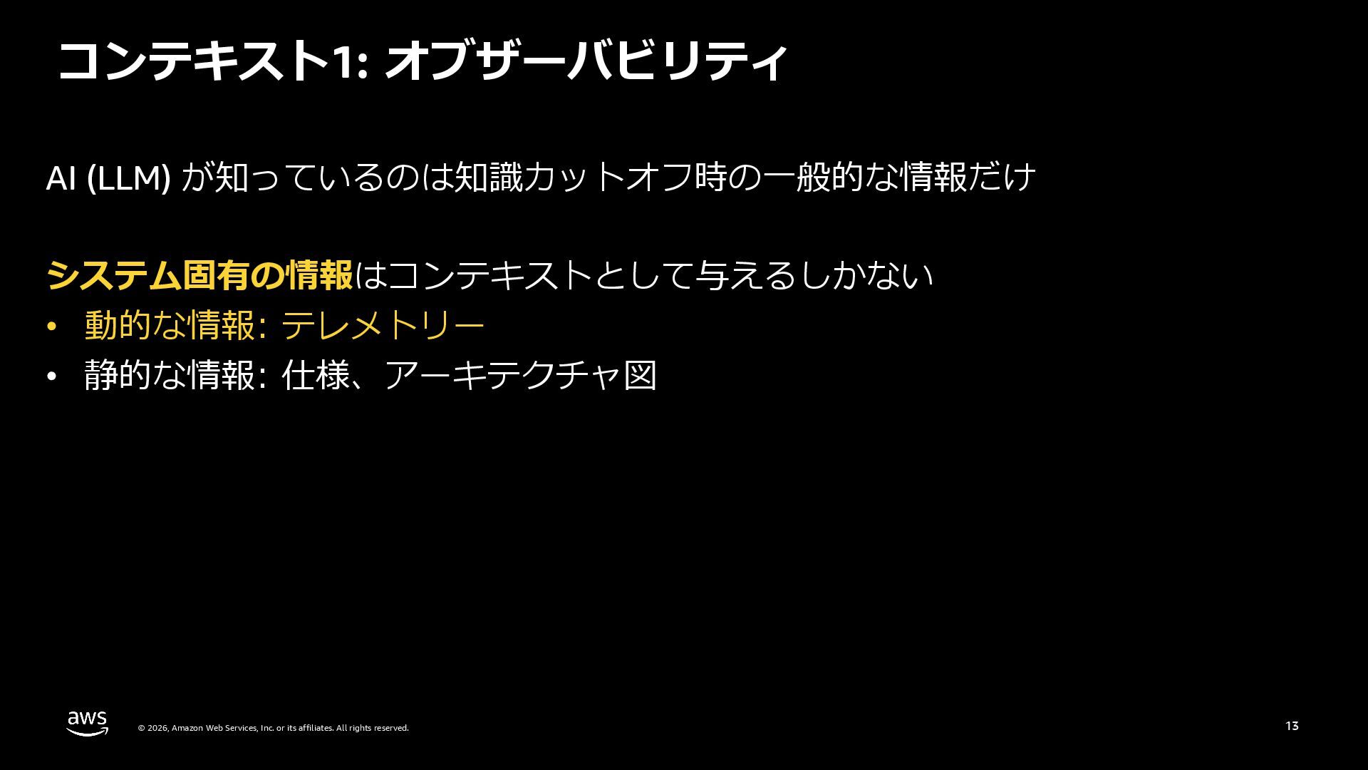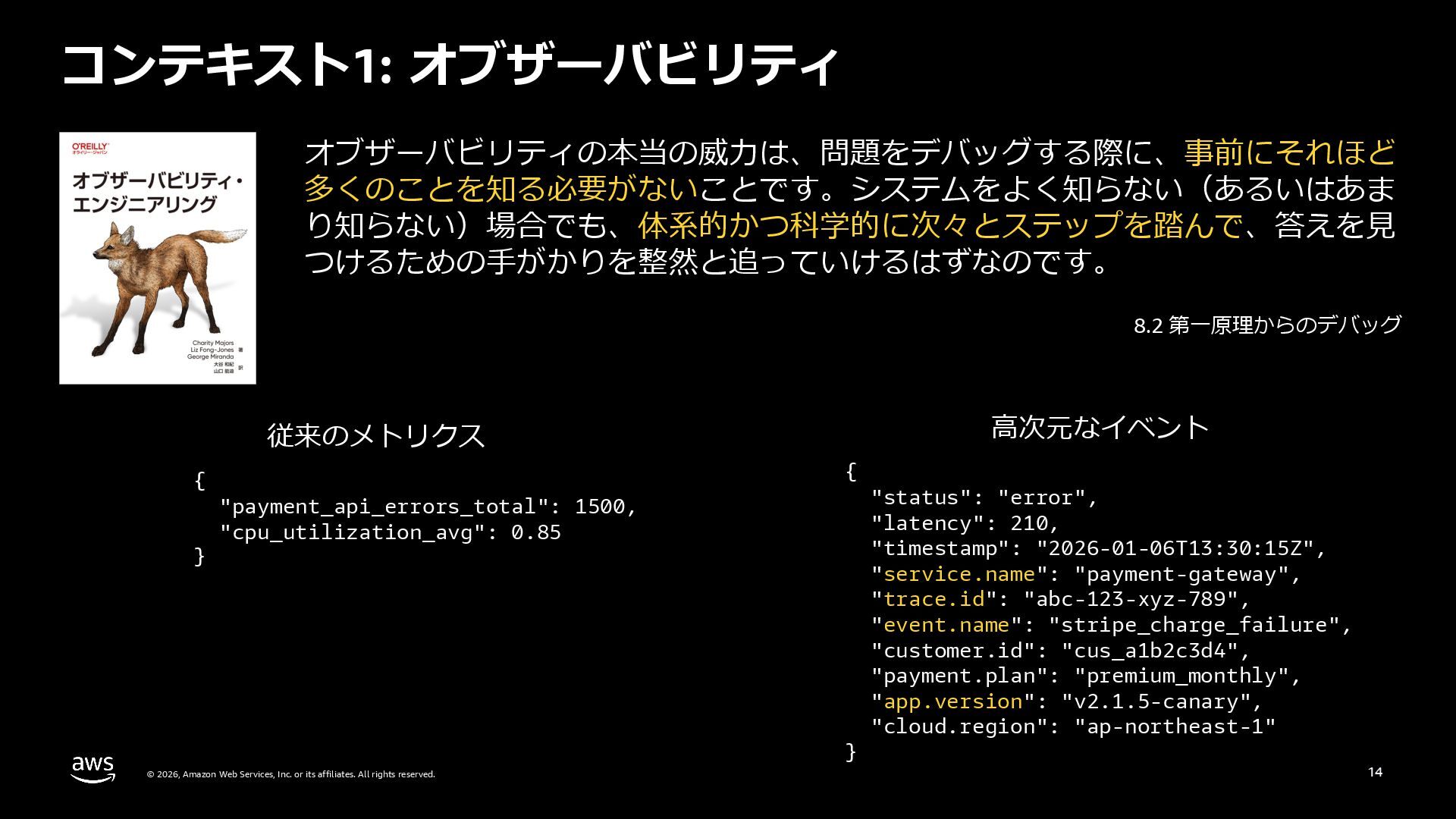 rights reserved. 14 コンテキスト1: オブザーバビリティ オブザーバビリティの本当の威⼒は、問題をデバッグする際に、事前にそれほど 多くのことを知る必要がないことです。システムをよく知らない(あるいはあま り知らない)場合でも、体系的かつ科学的に次々とステップを踏んで、答えを⾒ つけるための⼿がかりを整然と追っていけるはずなのです。 8.2 第⼀原理からのデバッグ 従来のメトリクス { "payment_api_errors_total": 1500, "cpu_utilization_avg": 0.85 } ⾼次元なイベント { "status": "error", "latency": 210, "timestamp": "2026-01-06T13:30:15Z", "service.name": "payment-gateway", "trace.id": "abc-123-xyz-789", "event.name": "stripe_charge_failure", "customer.id": "cus_a1b2c3d4", "payment.plan": "premium_monthly", "app.version": "v2.1.5-canary", "cloud.region": "ap-northeast-1" }
