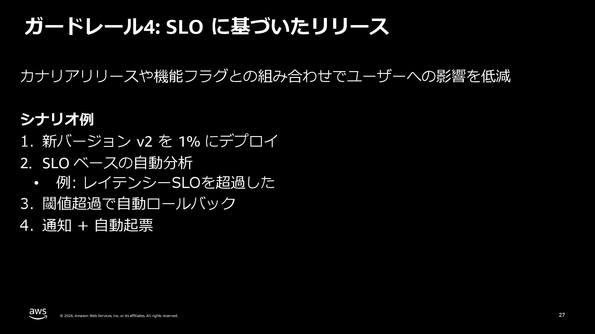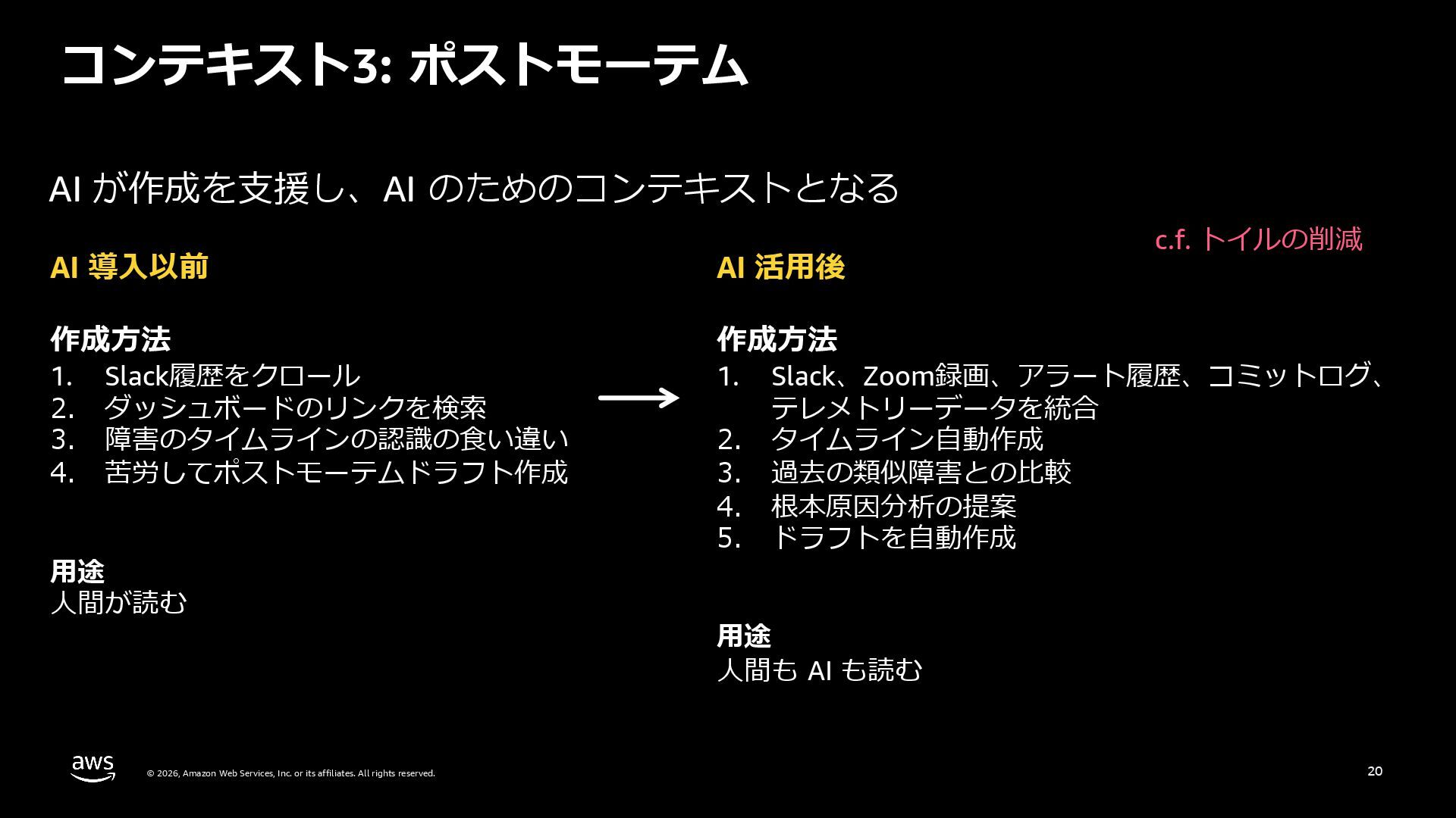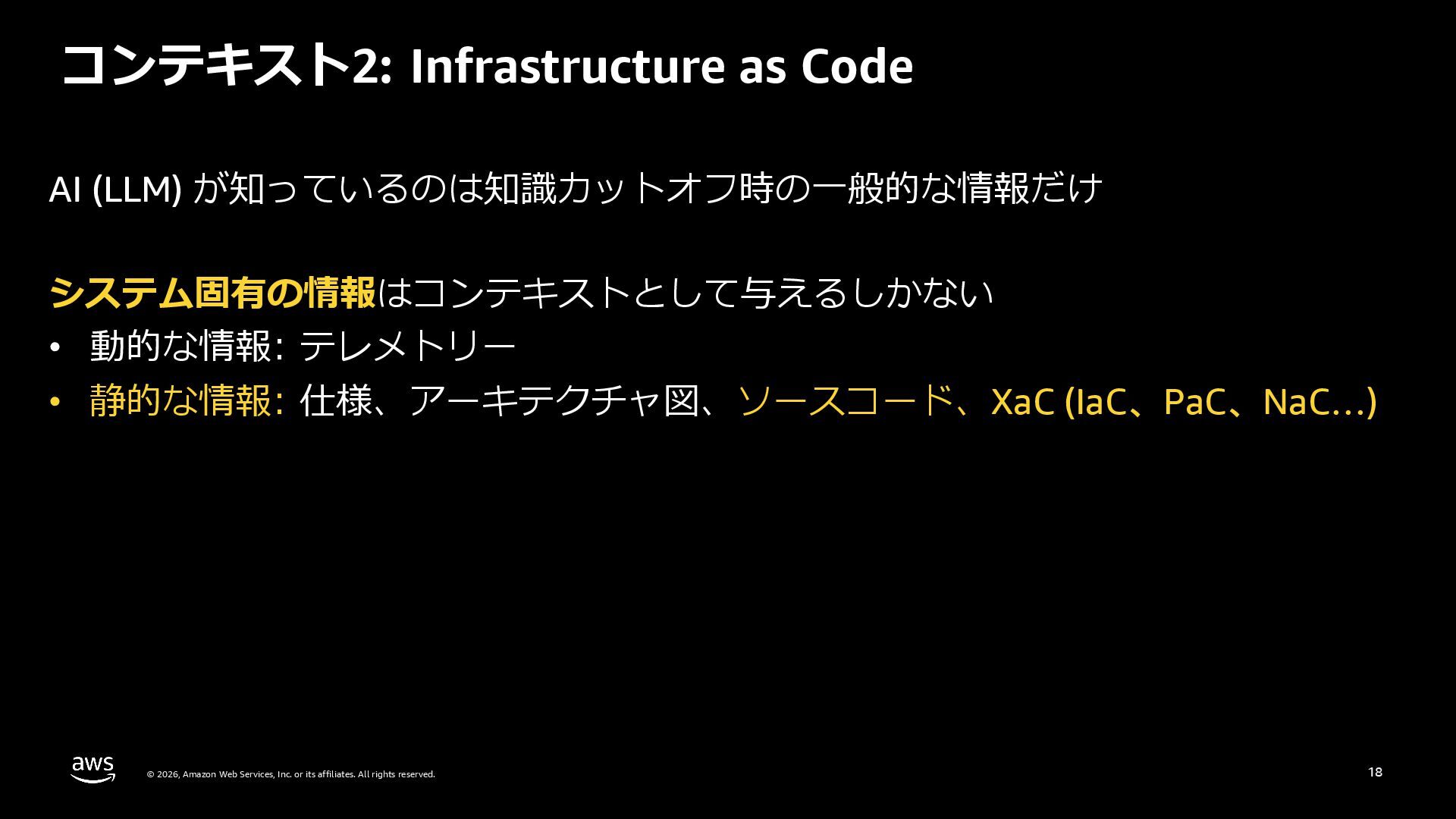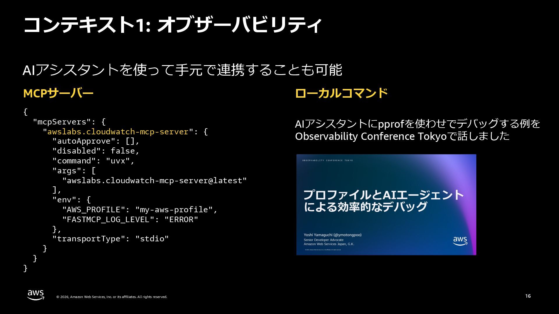 rights reserved. 14 コンテキスト1: オブザーバビリティ オブザーバビリティの本当の威⼒は、問題をデバッグする際に、事前にそれほど 多くのことを知る必要がないことです。システムをよく知らない(あるいはあま り知らない)場合でも、体系的かつ科学的に次々とステップを踏んで、答えを⾒ つけるための⼿がかりを整然と追っていけるはずなのです。 8.2 第⼀原理からのデバッグ 従来のメトリクス { "payment_api_errors_total": 1500, "cpu_utilization_avg": 0.85 } ⾼次元なイベント { "status": "error", "latency": 210, "timestamp": "2026-01-06T13:30:15Z", "service.name": "payment-gateway", "trace.id": "abc-123-xyz-789", "event.name": "stripe_charge_failure", "customer.id": "cus_a1b2c3d4", "payment.plan": "premium_monthly", "app.version": "v2.1.5-canary", "cloud.region": "ap-northeast-1" }