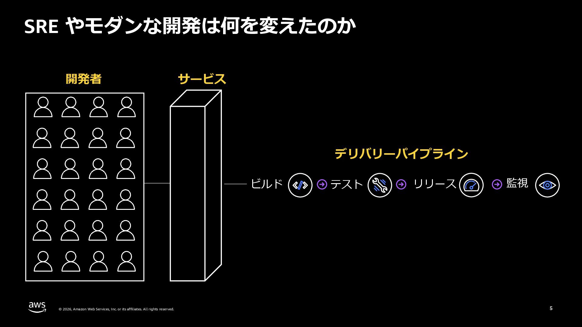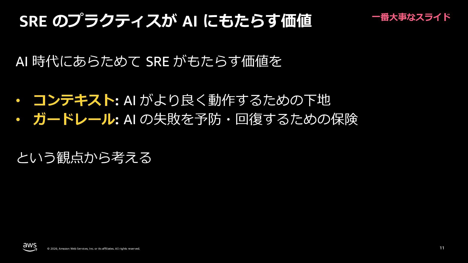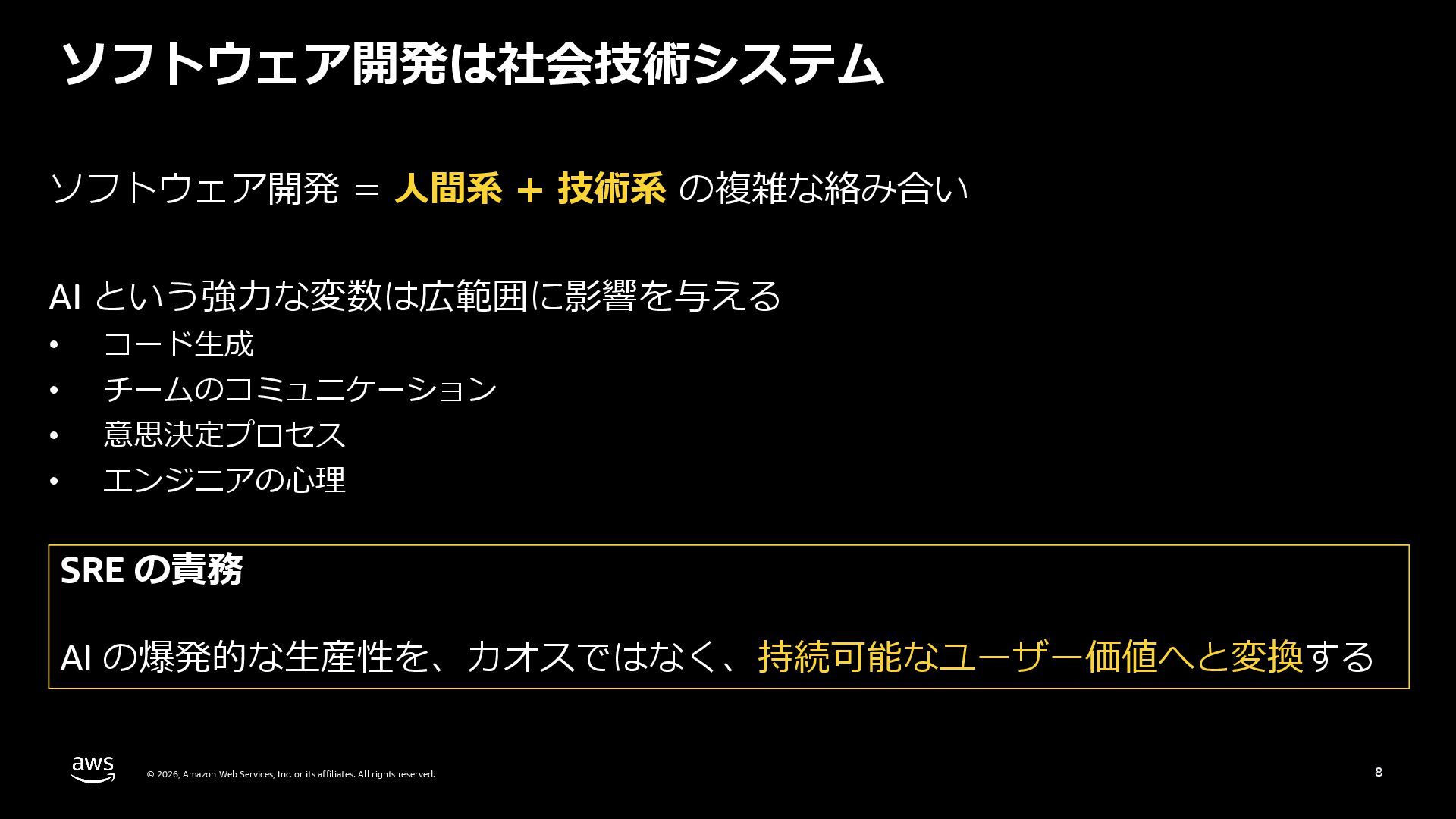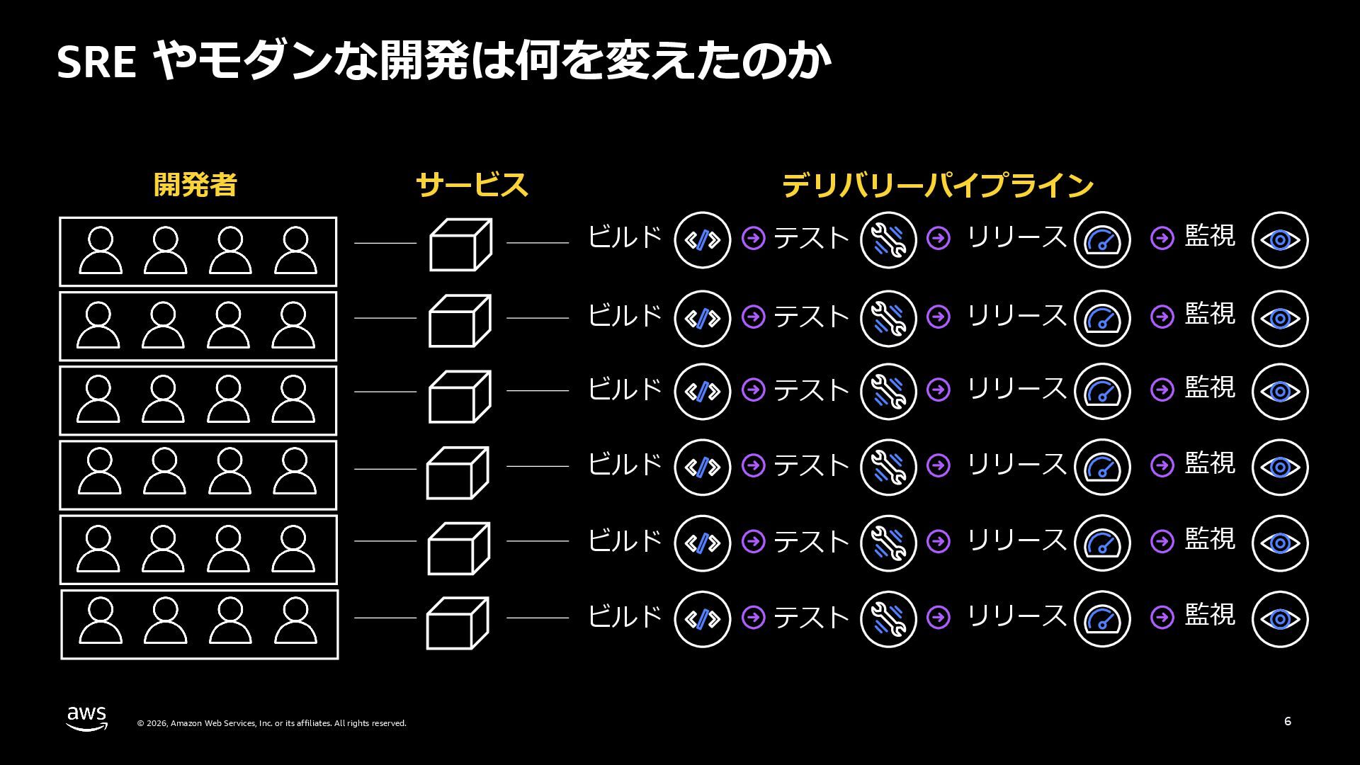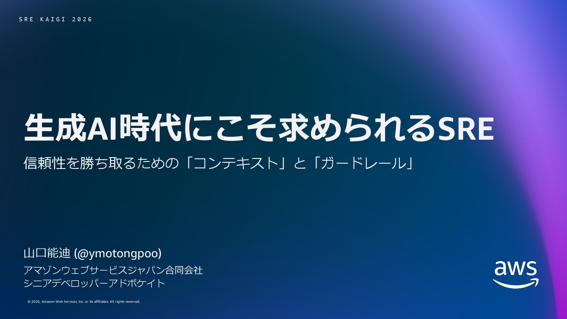 rights reserved. 14 コンテキスト1: オブザーバビリティ オブザーバビリティの本当の威⼒は、問題をデバッグする際に、事前にそれほど 多くのことを知る必要がないことです。システムをよく知らない(あるいはあま り知らない)場合でも、体系的かつ科学的に次々とステップを踏んで、答えを⾒ つけるための⼿がかりを整然と追っていけるはずなのです。 8.2 第⼀原理からのデバッグ 従来のメトリクス { "payment_api_errors_total": 1500, "cpu_utilization_avg": 0.85 } ⾼次元なイベント { "status": "error", "latency": 210, "timestamp": "2026-01-06T13:30:15Z", "service.name": "payment-gateway", "trace.id": "abc-123-xyz-789", "event.name": "stripe_charge_failure", "customer.id": "cus_a1b2c3d4", "payment.plan": "premium_monthly", "app.version": "v2.1.5-canary", "cloud.region": "ap-northeast-1" }