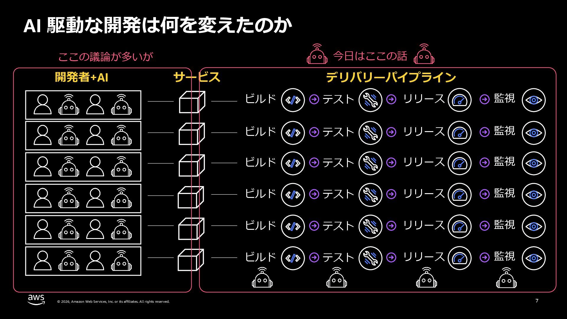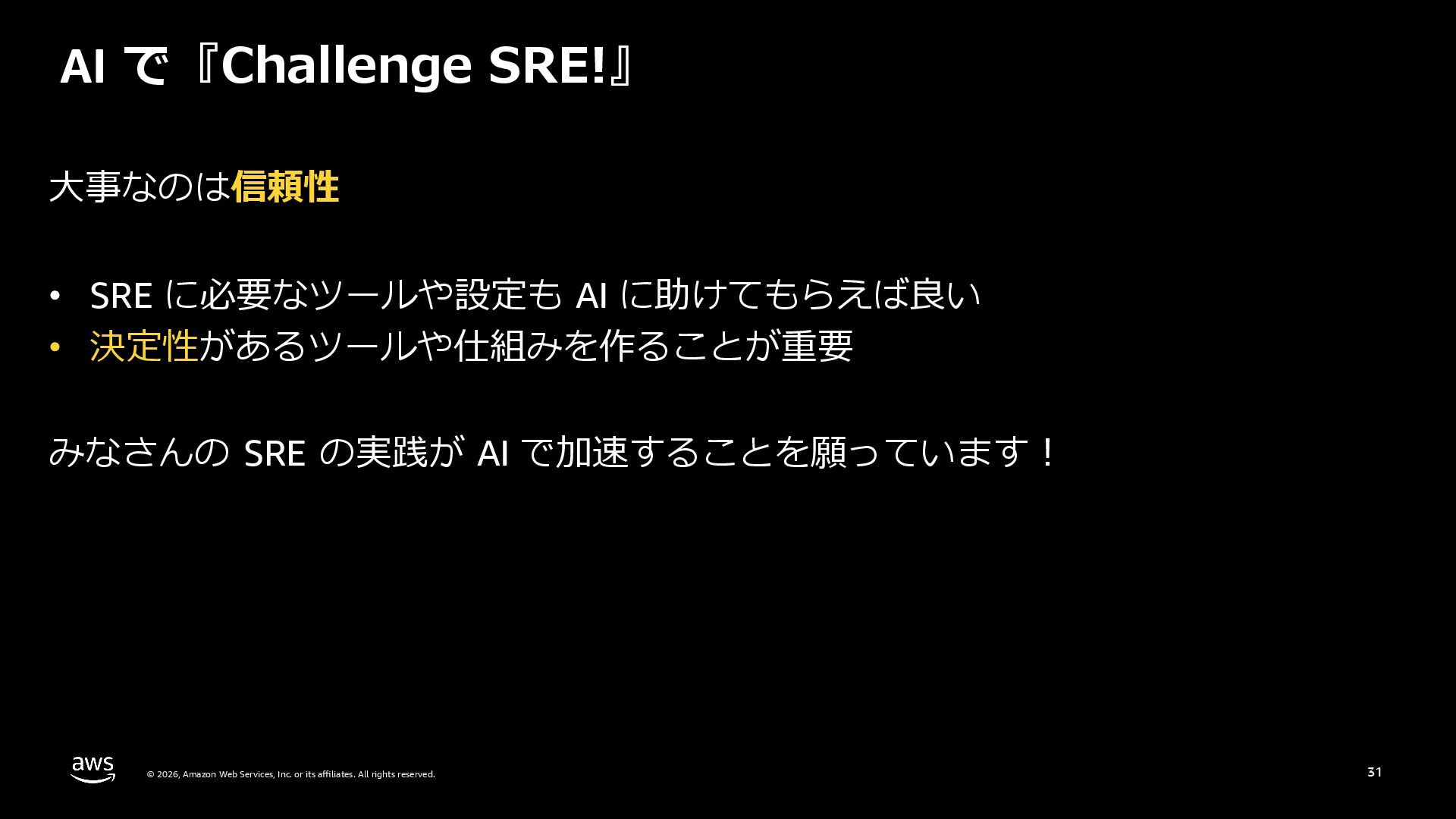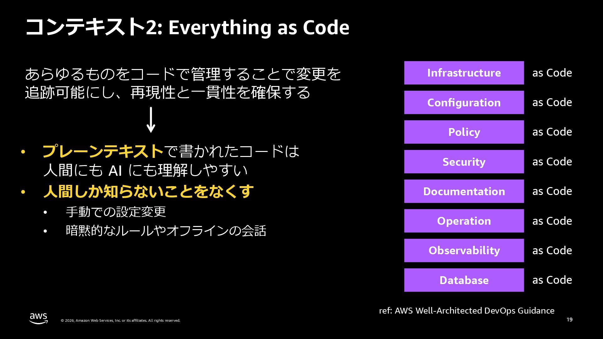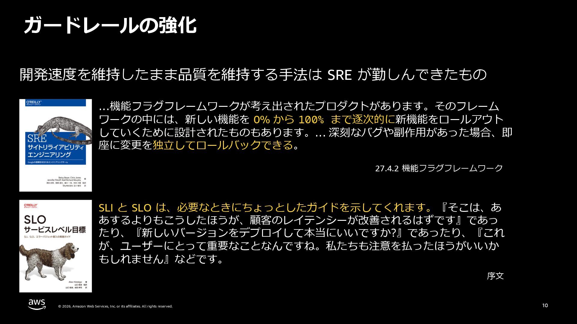 rights reserved. 14 コンテキスト1: オブザーバビリティ オブザーバビリティの本当の威⼒は、問題をデバッグする際に、事前にそれほど 多くのことを知る必要がないことです。システムをよく知らない(あるいはあま り知らない)場合でも、体系的かつ科学的に次々とステップを踏んで、答えを⾒ つけるための⼿がかりを整然と追っていけるはずなのです。 8.2 第⼀原理からのデバッグ 従来のメトリクス { "payment_api_errors_total": 1500, "cpu_utilization_avg": 0.85 } ⾼次元なイベント { "status": "error", "latency": 210, "timestamp": "2026-01-06T13:30:15Z", "service.name": "payment-gateway", "trace.id": "abc-123-xyz-789", "event.name": "stripe_charge_failure", "customer.id": "cus_a1b2c3d4", "payment.plan": "premium_monthly", "app.version": "v2.1.5-canary", "cloud.region": "ap-northeast-1" }
