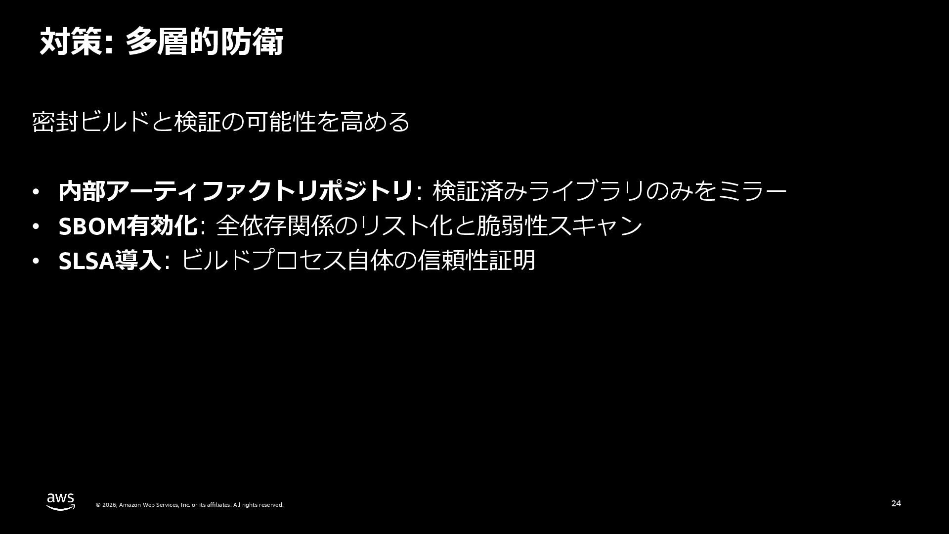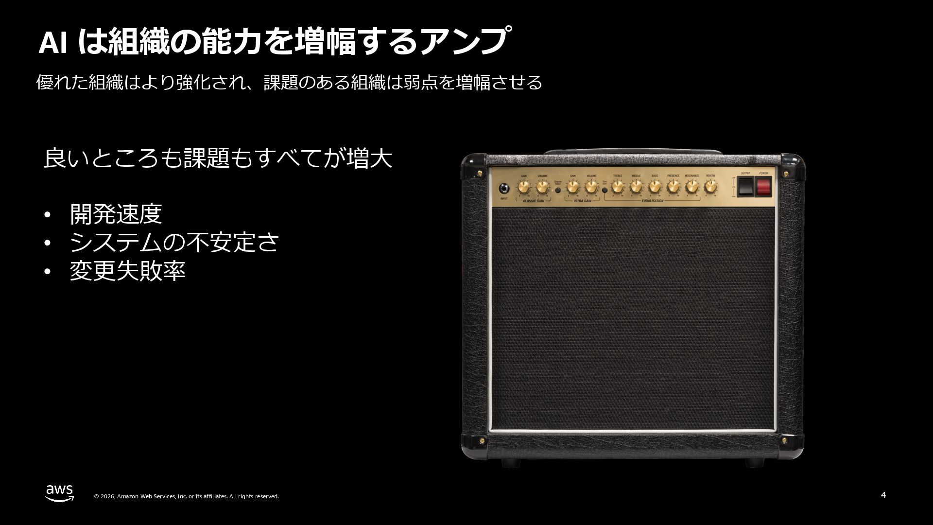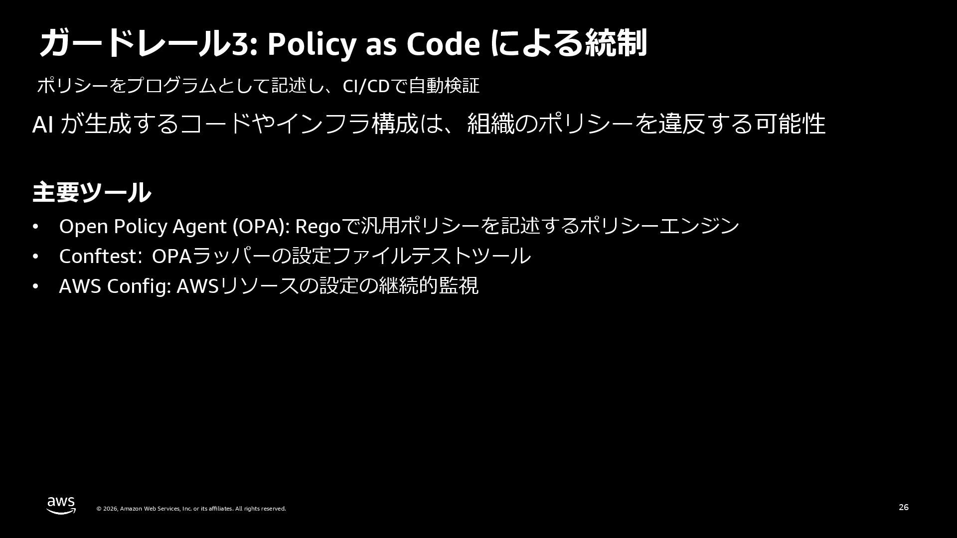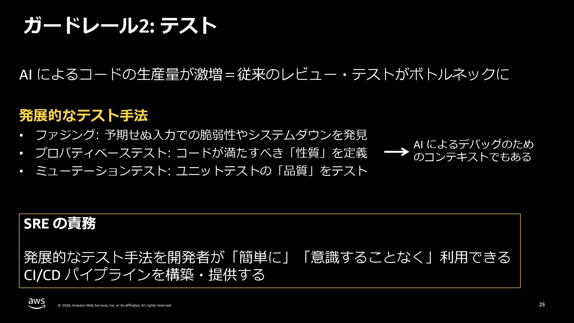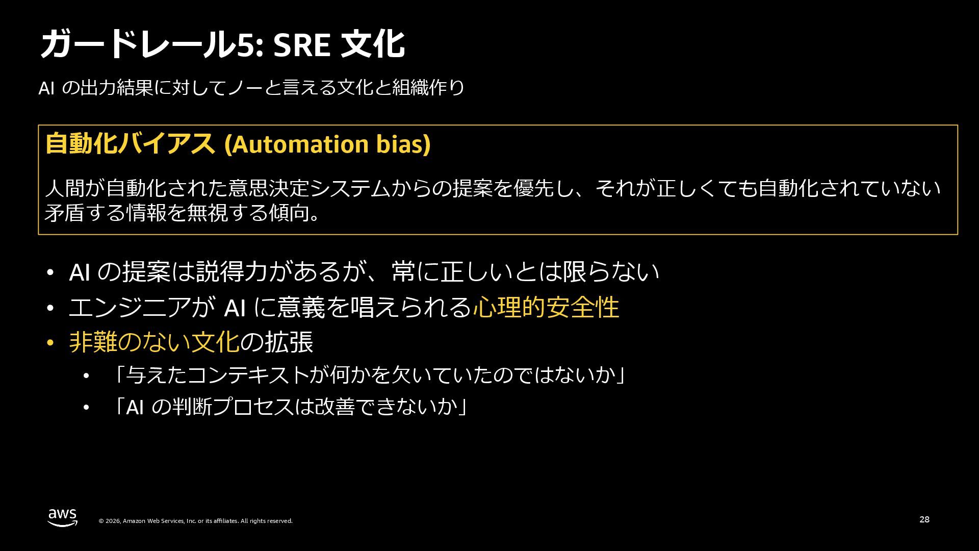 rights reserved. 14 コンテキスト1: オブザーバビリティ オブザーバビリティの本当の威⼒は、問題をデバッグする際に、事前にそれほど 多くのことを知る必要がないことです。システムをよく知らない(あるいはあま り知らない)場合でも、体系的かつ科学的に次々とステップを踏んで、答えを⾒ つけるための⼿がかりを整然と追っていけるはずなのです。 8.2 第⼀原理からのデバッグ 従来のメトリクス { "payment_api_errors_total": 1500, "cpu_utilization_avg": 0.85 } ⾼次元なイベント { "status": "error", "latency": 210, "timestamp": "2026-01-06T13:30:15Z", "service.name": "payment-gateway", "trace.id": "abc-123-xyz-789", "event.name": "stripe_charge_failure", "customer.id": "cus_a1b2c3d4", "payment.plan": "premium_monthly", "app.version": "v2.1.5-canary", "cloud.region": "ap-northeast-1" }