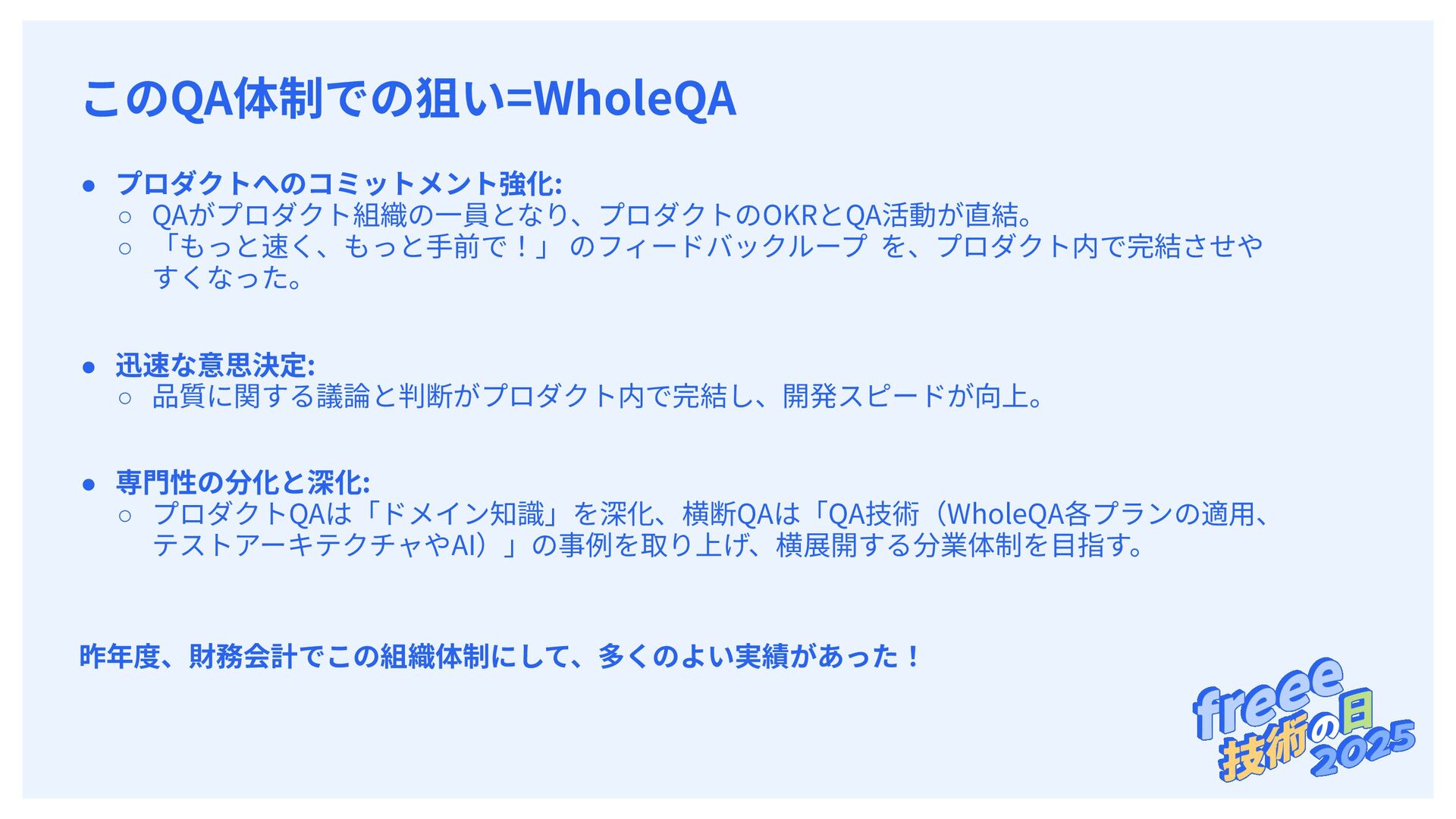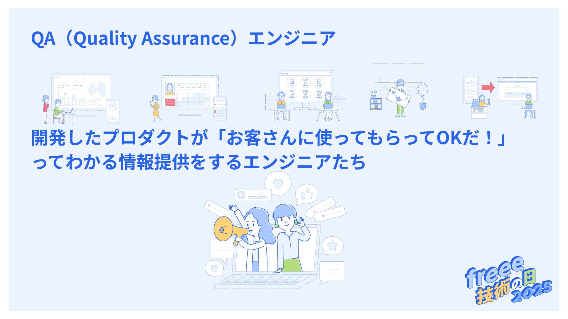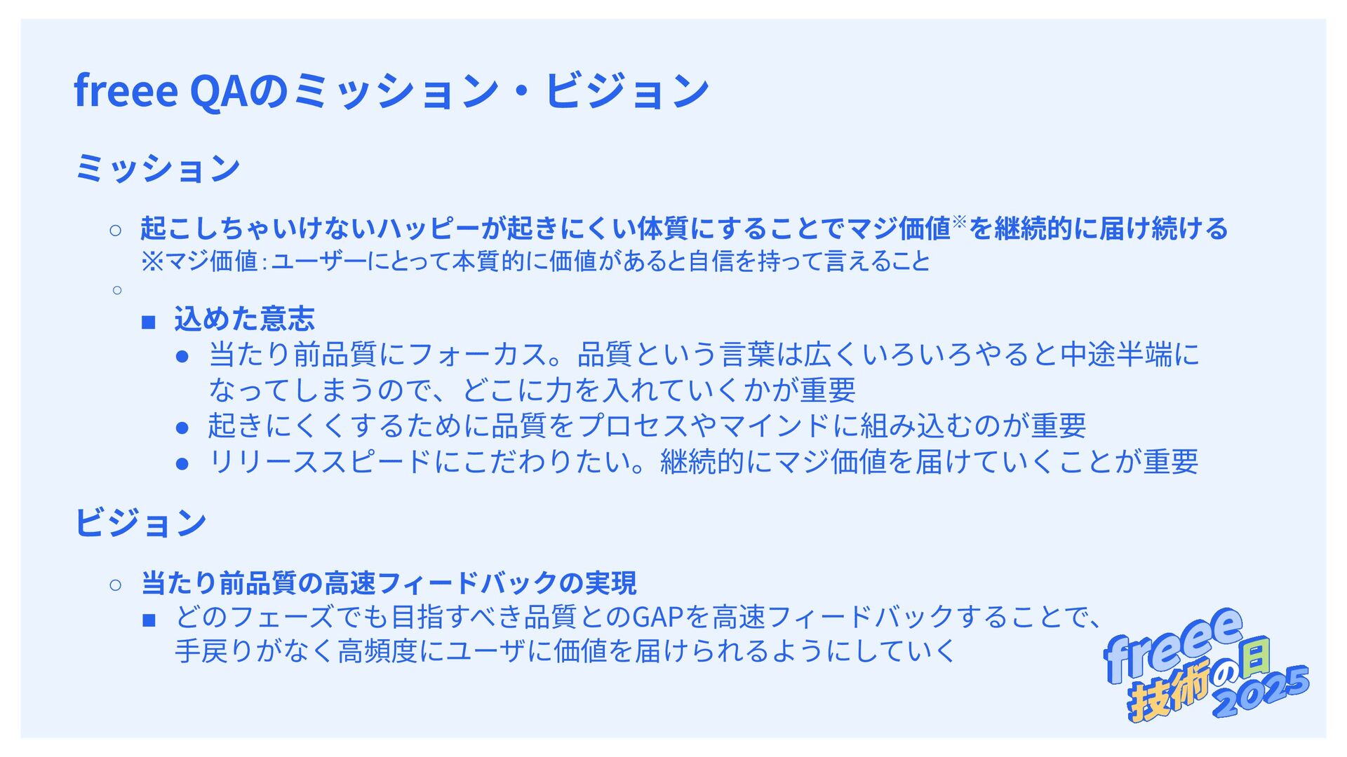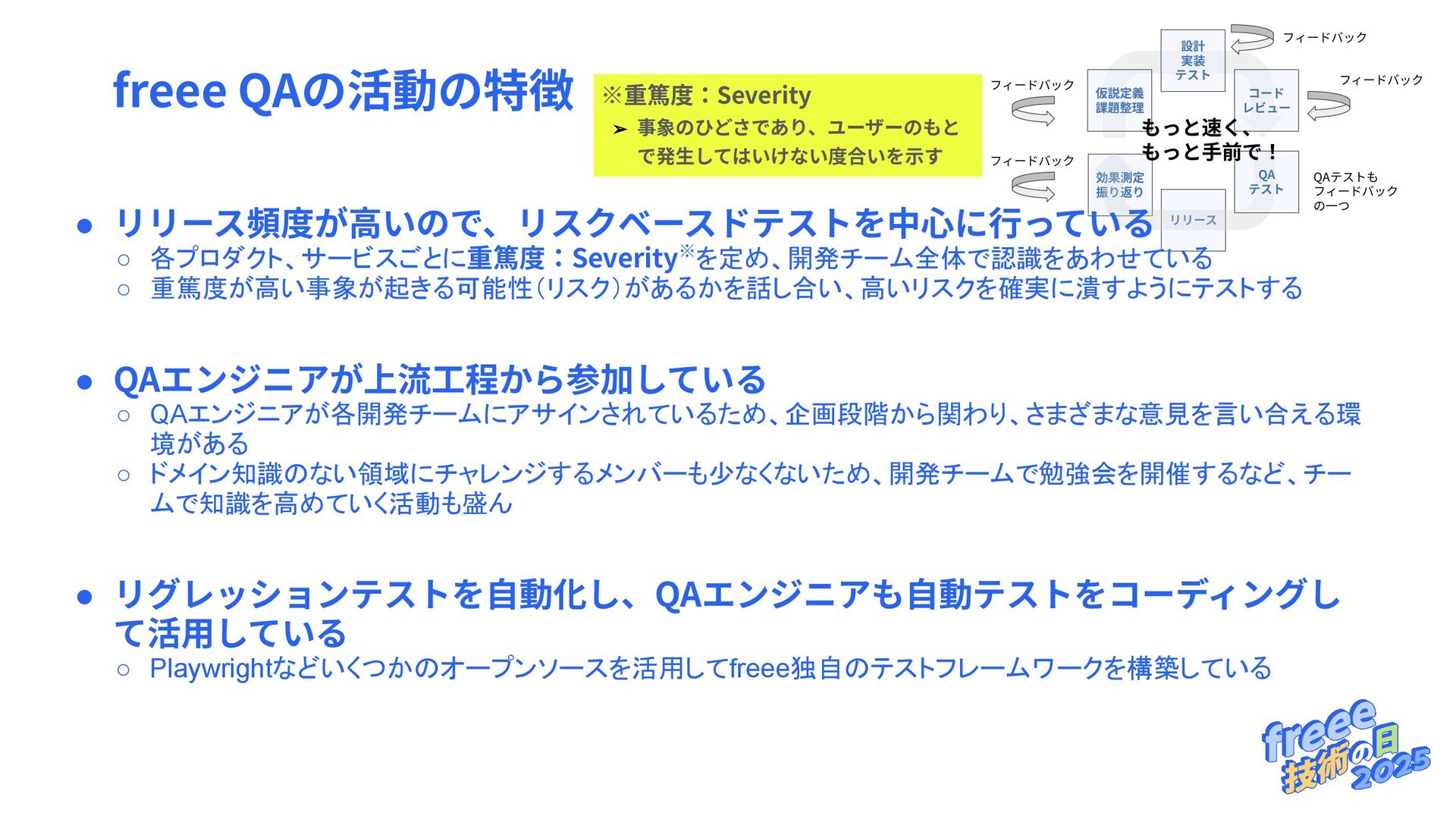 QA テスト フィードバック フィードバック フィードバック フィードバック QAテストも フィードバック の⼀つ もっと速く、 もっと⼿前で! freee QAの活動の特徴 ※重篤度:Severity ➢ 事象のひどさであり、ユーザーのもと で発⽣してはいけない度合いを⽰す • リリース頻度が⾼いので、リスクベースドテストを中⼼に⾏っている ◦ 各プロダクト、サービスごとに重篤度:Severity※を定め、開発チーム全体で認識をあわせている ◦ 重篤度が高い事象が起きる可能性(リスク)があるかを話し合い、高いリスクを確実に潰すようにテストする • QAエンジニアが上流⼯程から参加している ◦ QAエンジニアが各開発チームにアサインされているため、企画段階から関わり、さまざまな意見を言い合える環 境がある ◦ ドメイン知識のない領域にチャレンジするメンバーも少なくないため、開発チームで勉強会を開催するなど、チー ムで知識を高めていく活動も盛ん • リグレッションテストを⾃動化し、QAエンジニアも⾃動テストをコーディングし て活⽤している ◦ Playwrightなどいくつかのオープンソースを活用してfreee独自のテストフレームワークを構築している