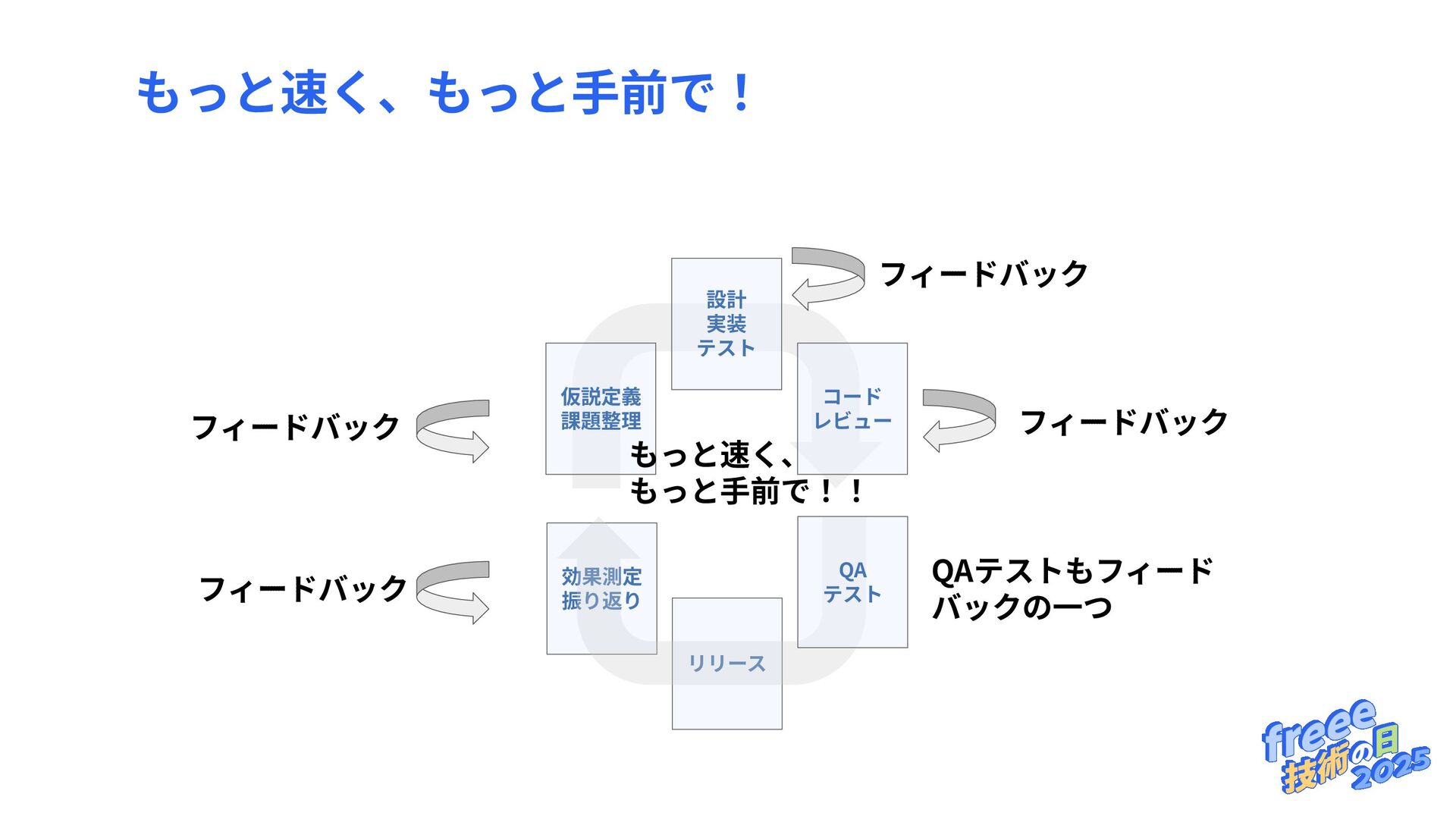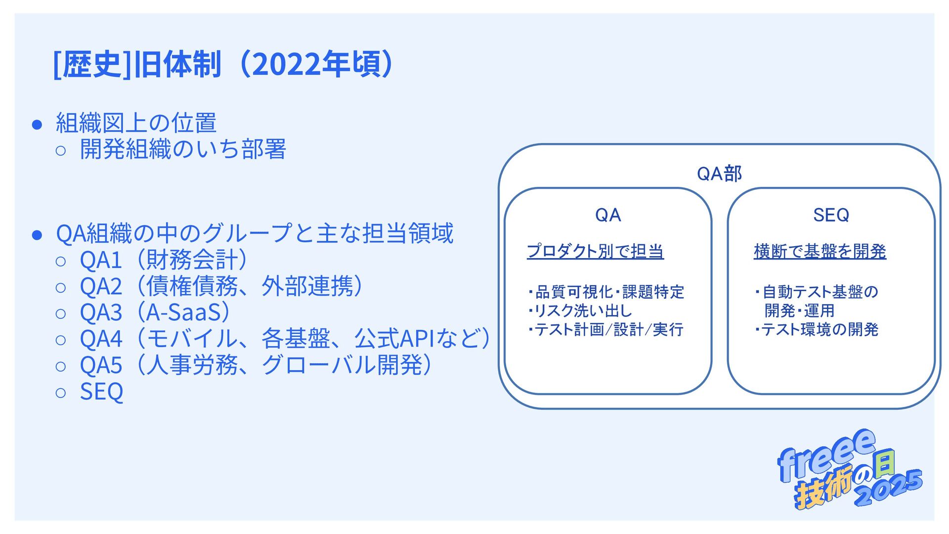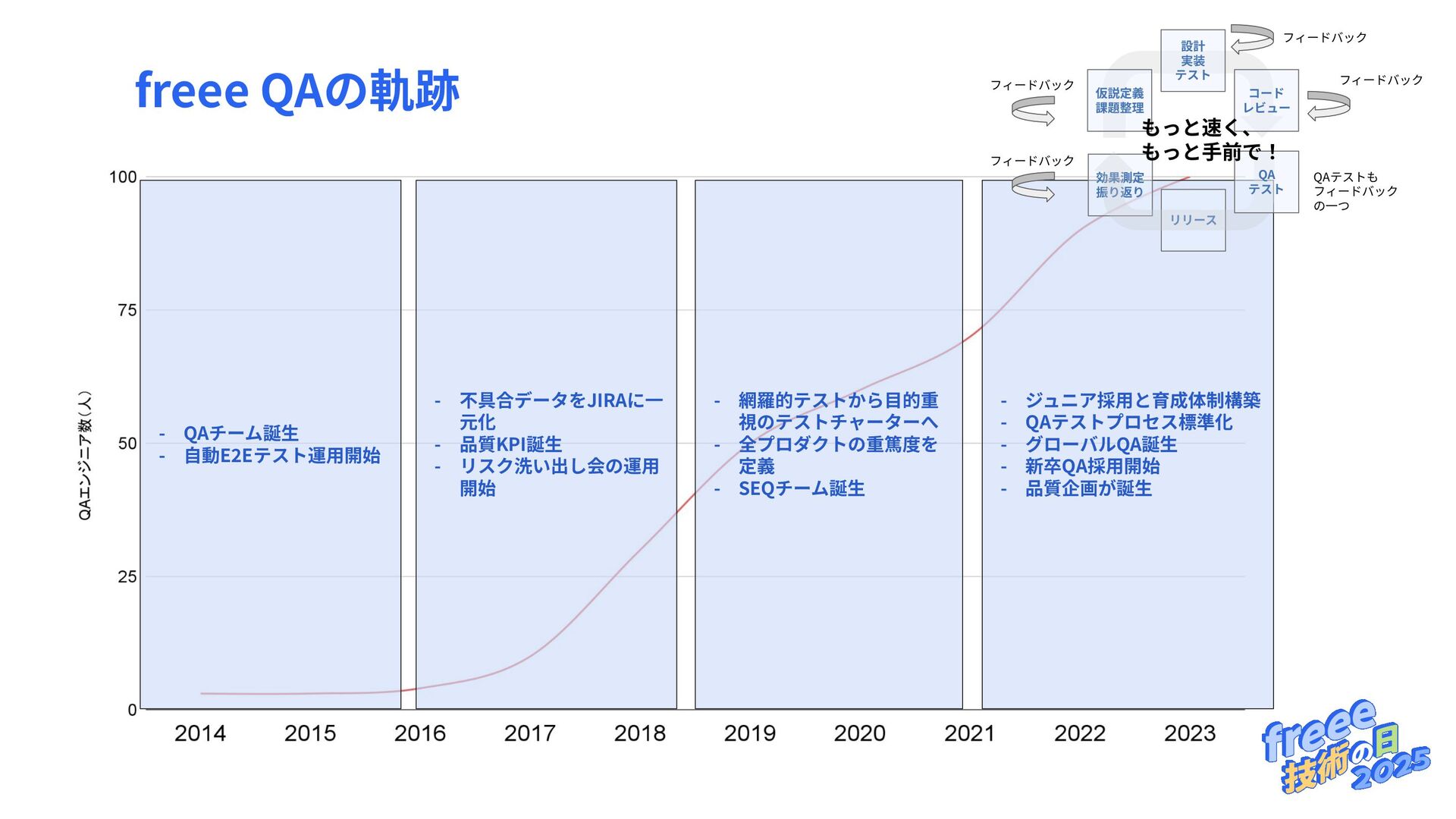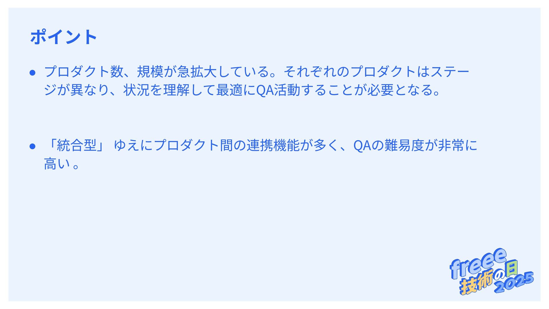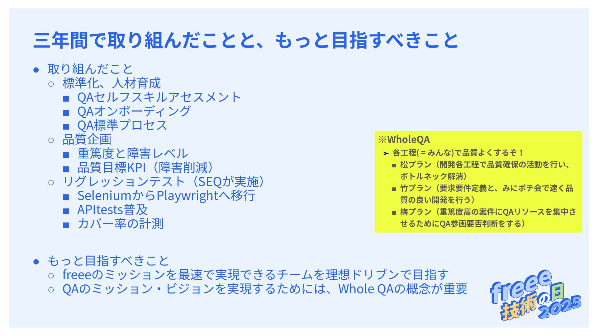 QA テスト フィードバック フィードバック フィードバック フィードバック QAテストも フィードバック の⼀つ もっと速く、 もっと⼿前で! freee QAの活動の特徴 ※重篤度:Severity ➢ 事象のひどさであり、ユーザーのもと で発⽣してはいけない度合いを⽰す • リリース頻度が⾼いので、リスクベースドテストを中⼼に⾏っている ◦ 各プロダクト、サービスごとに重篤度:Severity※を定め、開発チーム全体で認識をあわせている ◦ 重篤度が高い事象が起きる可能性(リスク)があるかを話し合い、高いリスクを確実に潰すようにテストする • QAエンジニアが上流⼯程から参加している ◦ QAエンジニアが各開発チームにアサインされているため、企画段階から関わり、さまざまな意見を言い合える環 境がある ◦ ドメイン知識のない領域にチャレンジするメンバーも少なくないため、開発チームで勉強会を開催するなど、チー ムで知識を高めていく活動も盛ん • リグレッションテストを⾃動化し、QAエンジニアも⾃動テストをコーディングし て活⽤している ◦ Playwrightなどいくつかのオープンソースを活用してfreee独自のテストフレームワークを構築している