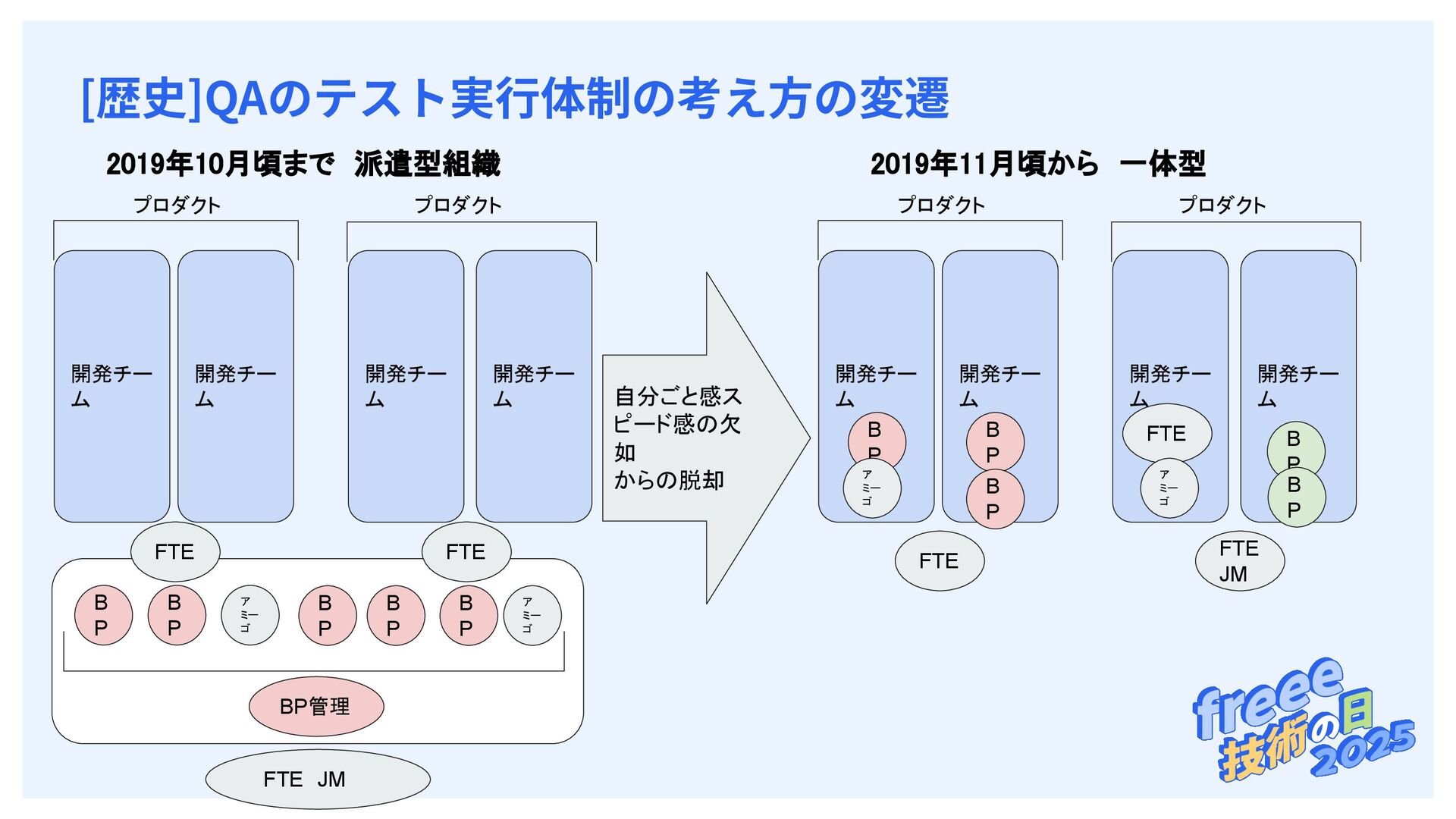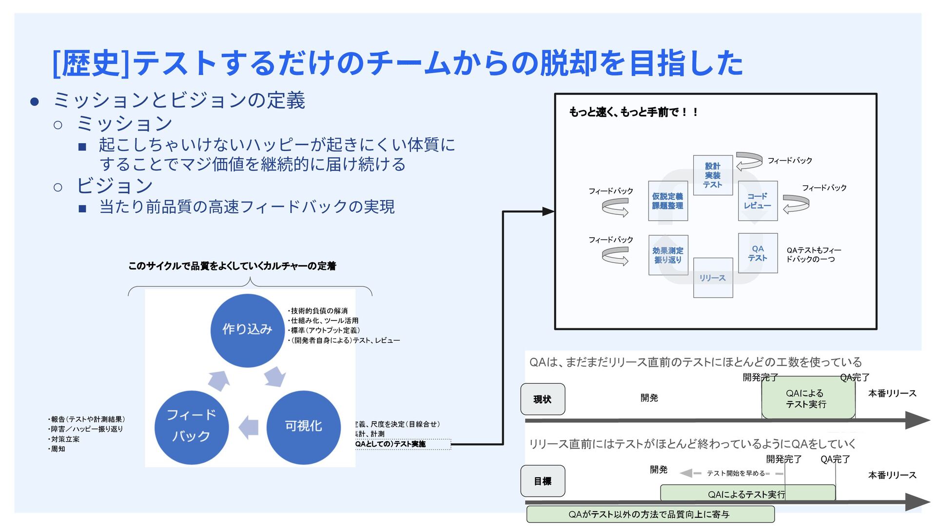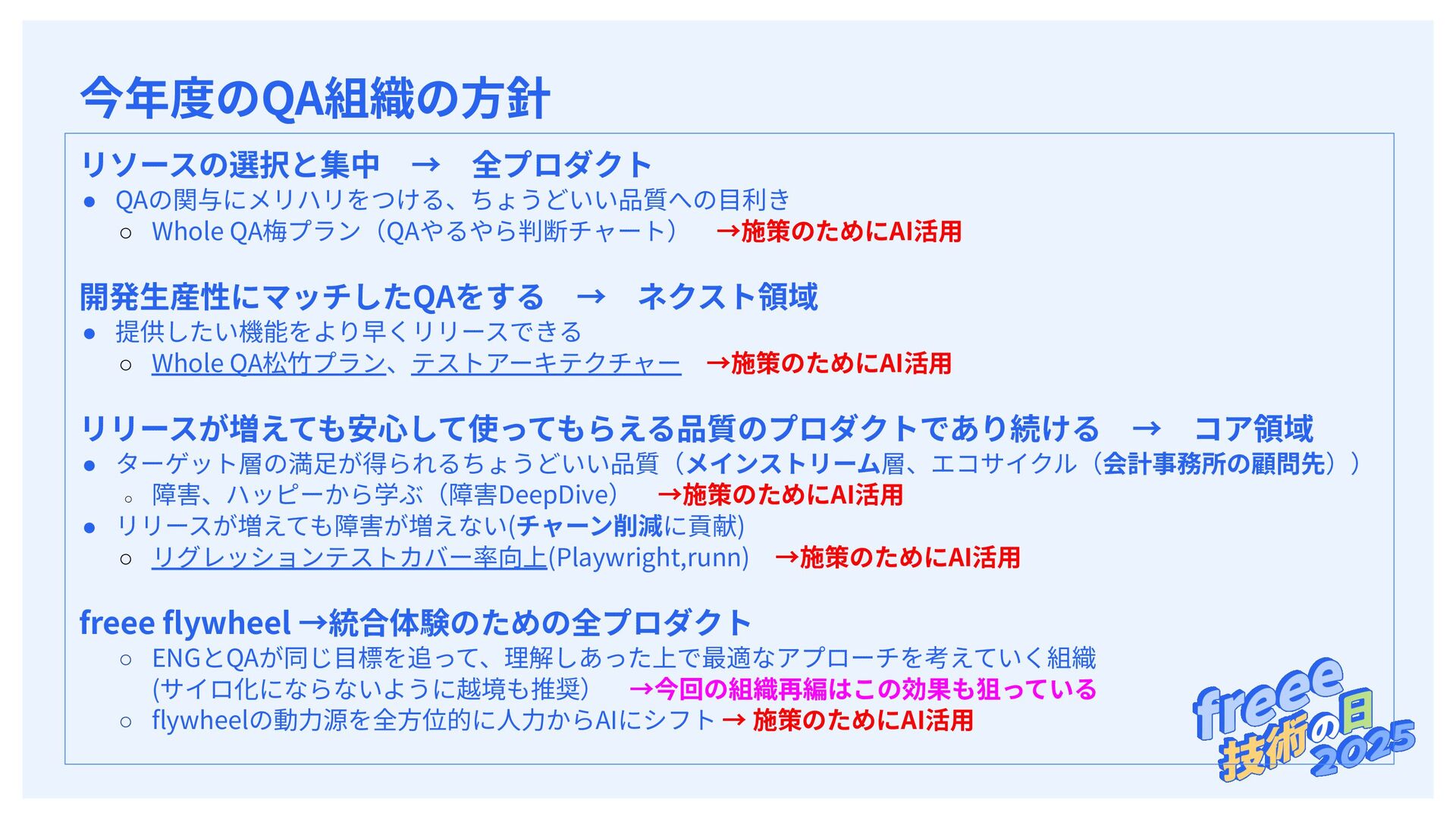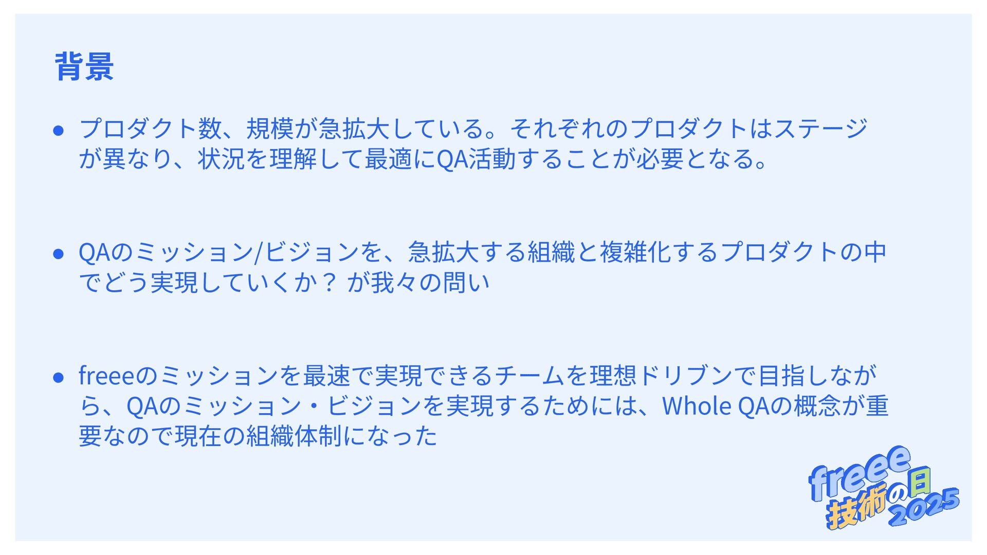 QA テスト フィードバック フィードバック フィードバック フィードバック QAテストも フィードバック の⼀つ もっと速く、 もっと⼿前で! freee QAの活動の特徴 ※重篤度:Severity ➢ 事象のひどさであり、ユーザーのもと で発⽣してはいけない度合いを⽰す • リリース頻度が⾼いので、リスクベースドテストを中⼼に⾏っている ◦ 各プロダクト、サービスごとに重篤度:Severity※を定め、開発チーム全体で認識をあわせている ◦ 重篤度が高い事象が起きる可能性(リスク)があるかを話し合い、高いリスクを確実に潰すようにテストする • QAエンジニアが上流⼯程から参加している ◦ QAエンジニアが各開発チームにアサインされているため、企画段階から関わり、さまざまな意見を言い合える環 境がある ◦ ドメイン知識のない領域にチャレンジするメンバーも少なくないため、開発チームで勉強会を開催するなど、チー ムで知識を高めていく活動も盛ん • リグレッションテストを⾃動化し、QAエンジニアも⾃動テストをコーディングし て活⽤している ◦ Playwrightなどいくつかのオープンソースを活用してfreee独自のテストフレームワークを構築している