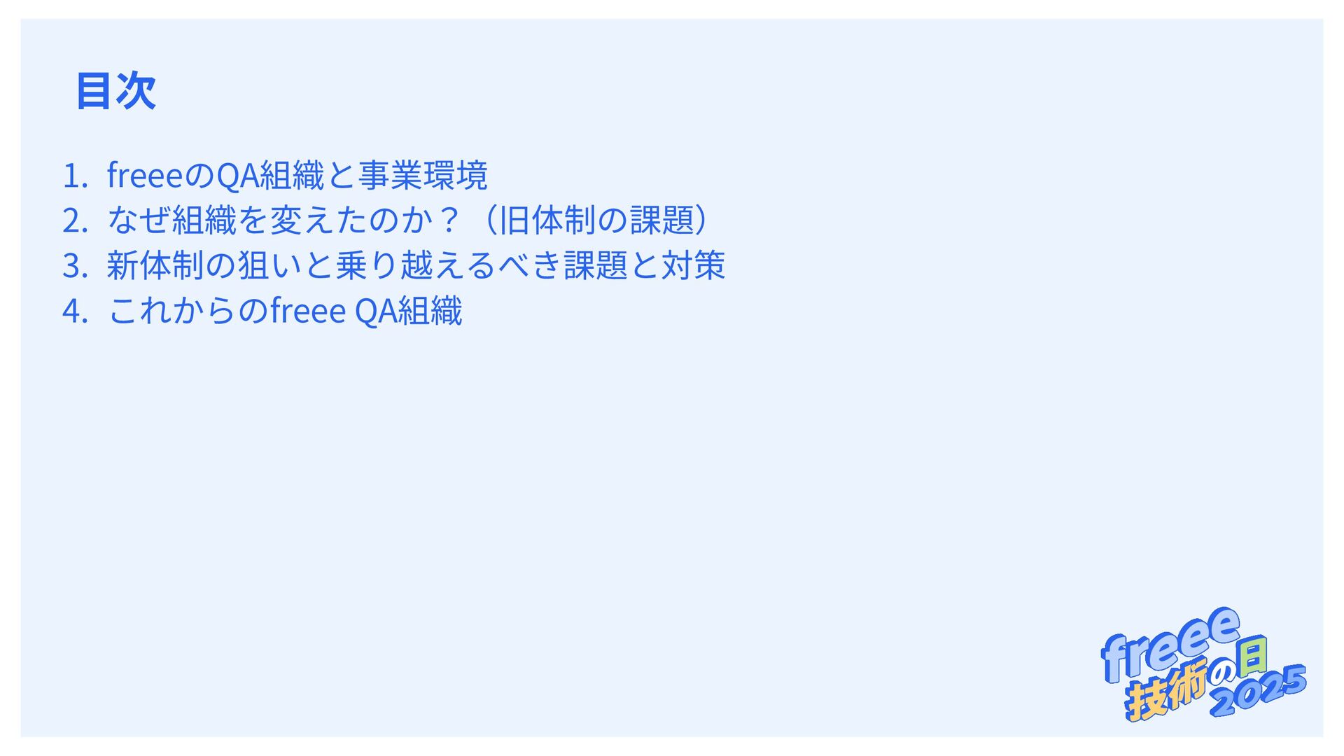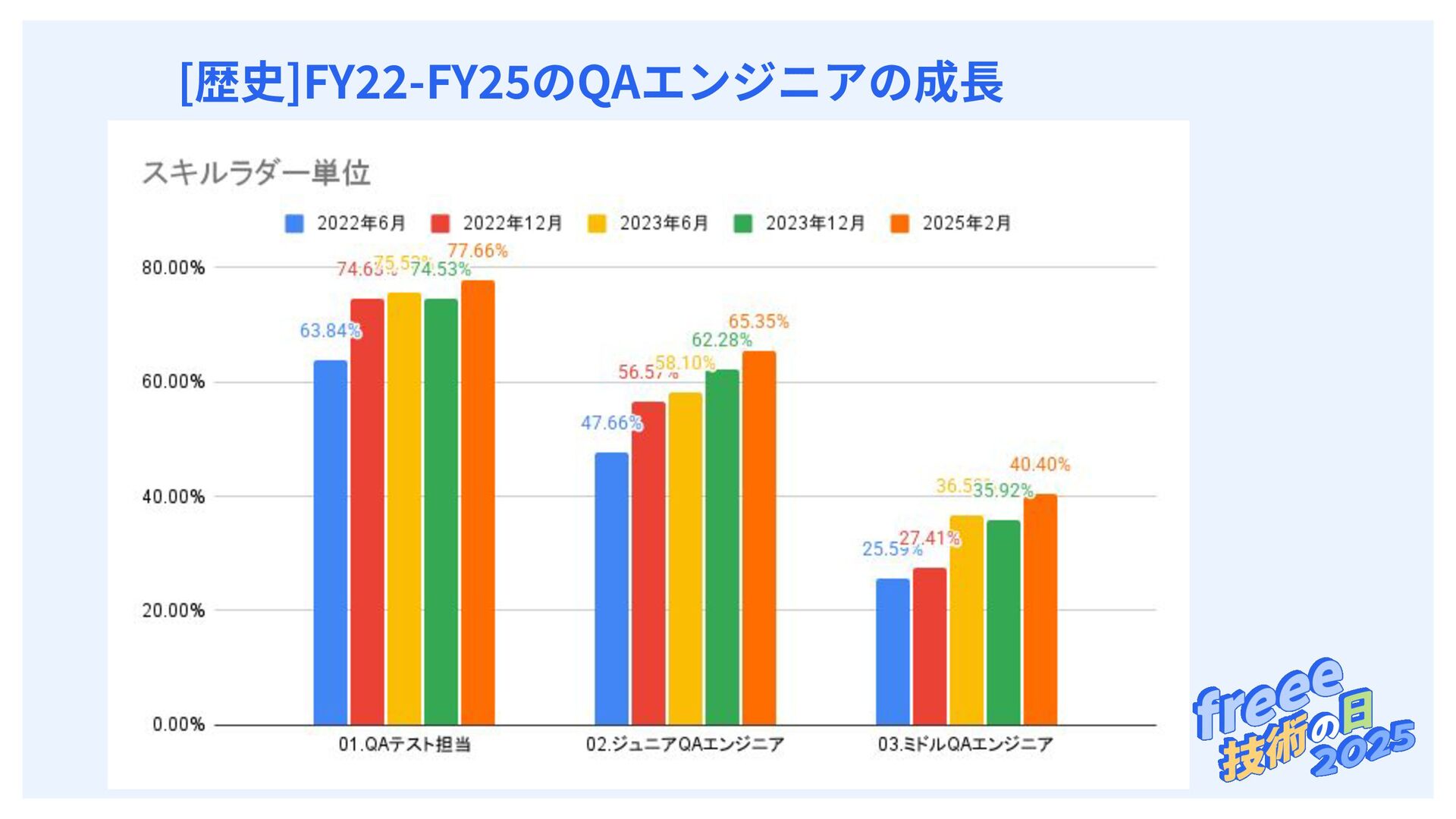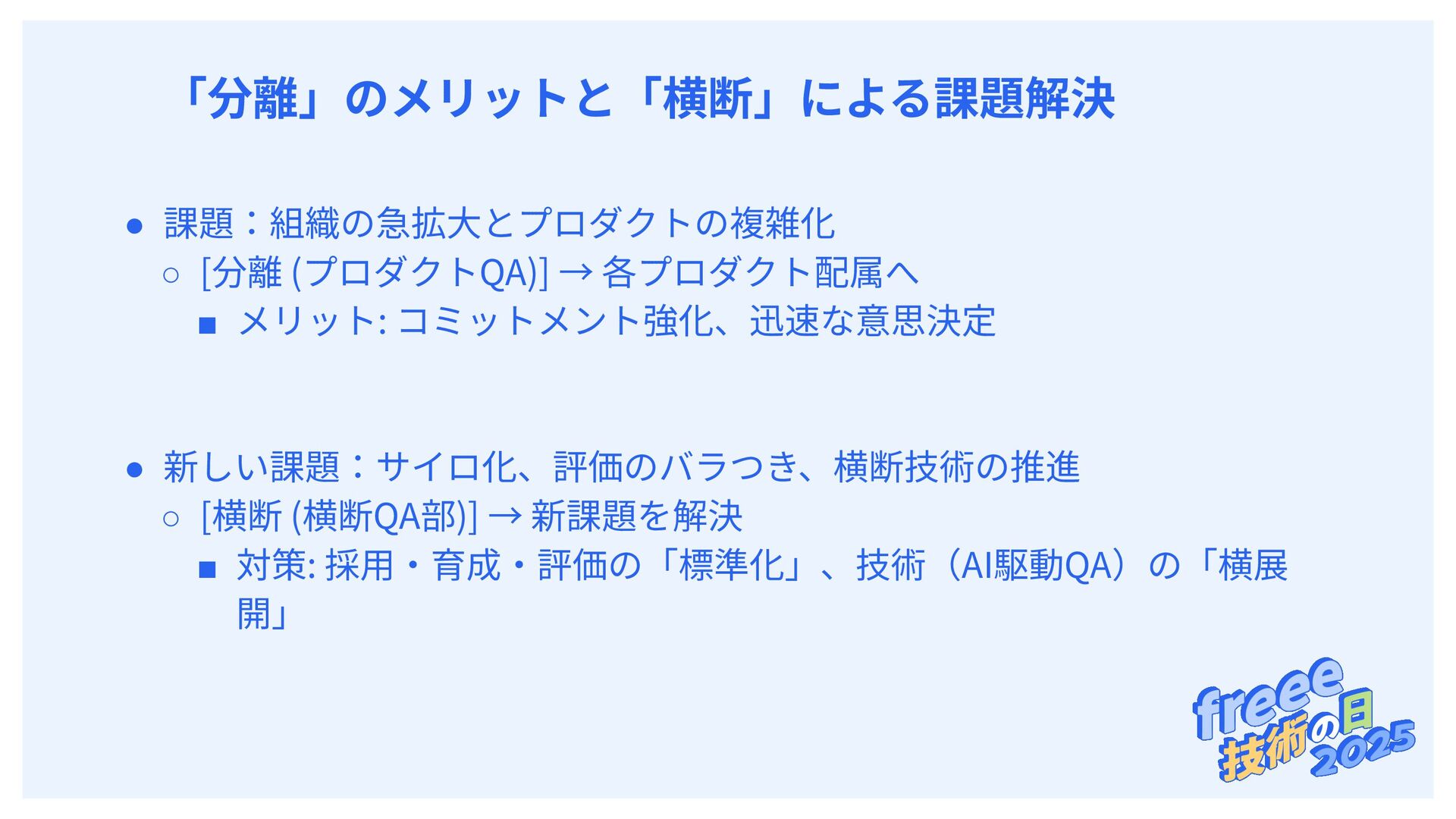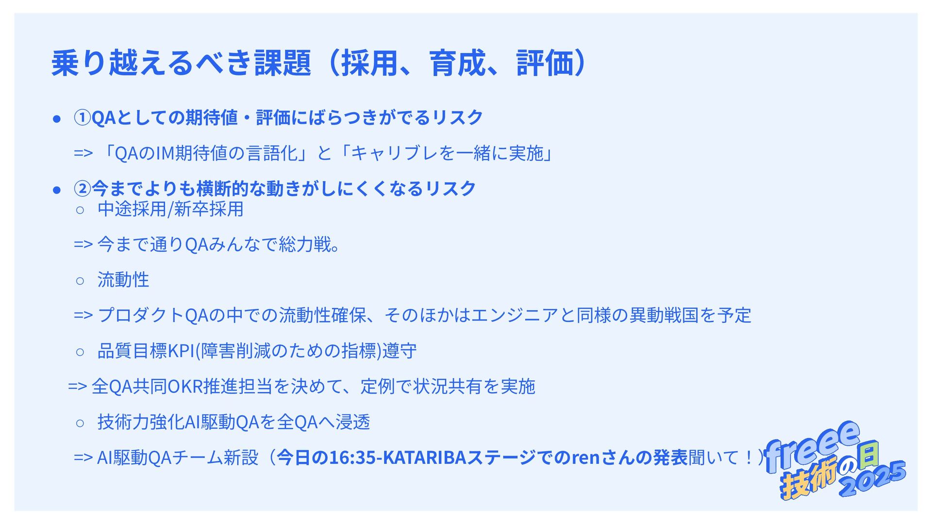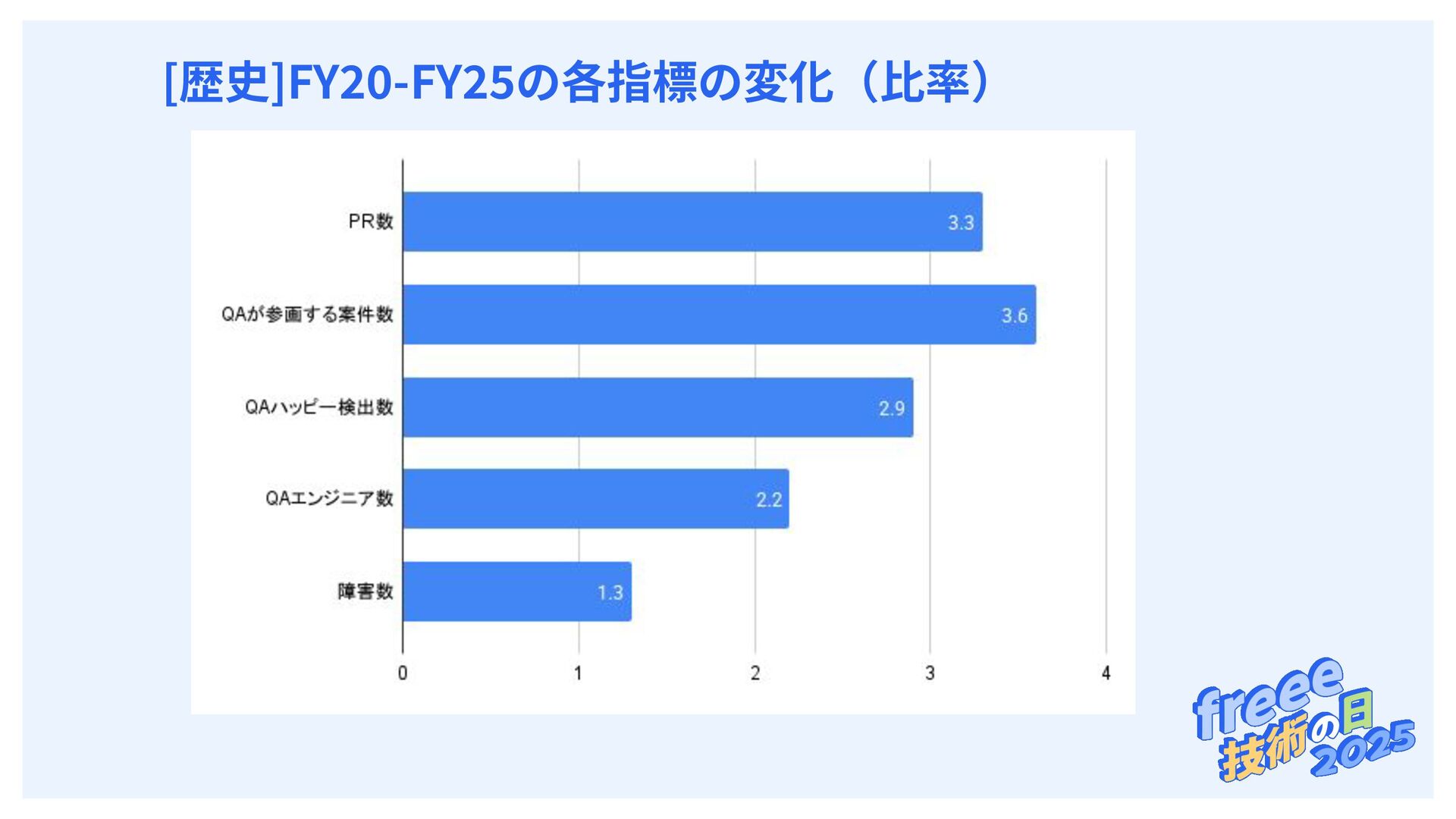 QA テスト フィードバック フィードバック フィードバック フィードバック QAテストも フィードバック の⼀つ もっと速く、 もっと⼿前で! freee QAの活動の特徴 ※重篤度:Severity ➢ 事象のひどさであり、ユーザーのもと で発⽣してはいけない度合いを⽰す • リリース頻度が⾼いので、リスクベースドテストを中⼼に⾏っている ◦ 各プロダクト、サービスごとに重篤度:Severity※を定め、開発チーム全体で認識をあわせている ◦ 重篤度が高い事象が起きる可能性(リスク)があるかを話し合い、高いリスクを確実に潰すようにテストする • QAエンジニアが上流⼯程から参加している ◦ QAエンジニアが各開発チームにアサインされているため、企画段階から関わり、さまざまな意見を言い合える環 境がある ◦ ドメイン知識のない領域にチャレンジするメンバーも少なくないため、開発チームで勉強会を開催するなど、チー ムで知識を高めていく活動も盛ん • リグレッションテストを⾃動化し、QAエンジニアも⾃動テストをコーディングし て活⽤している ◦ Playwrightなどいくつかのオープンソースを活用してfreee独自のテストフレームワークを構築している