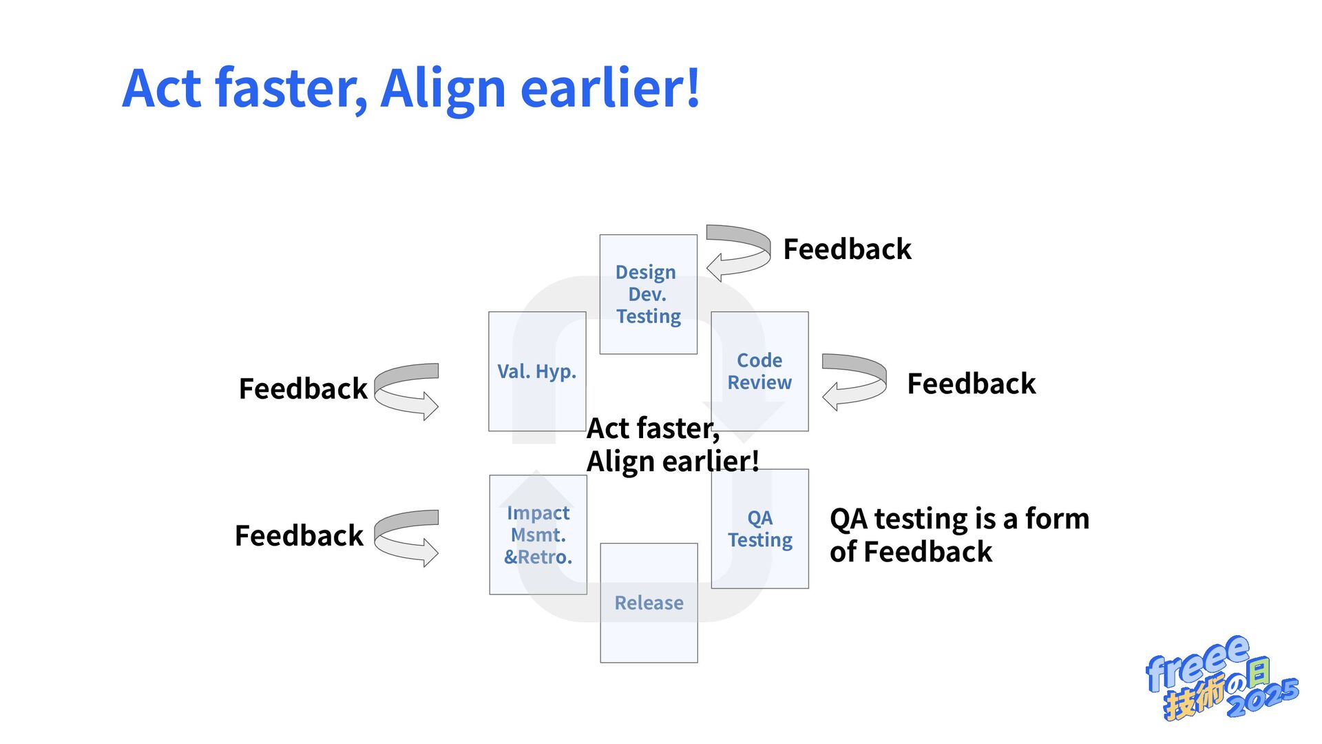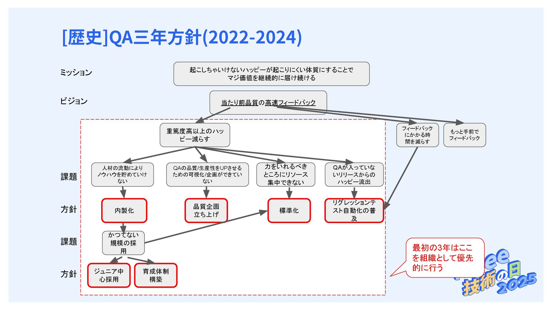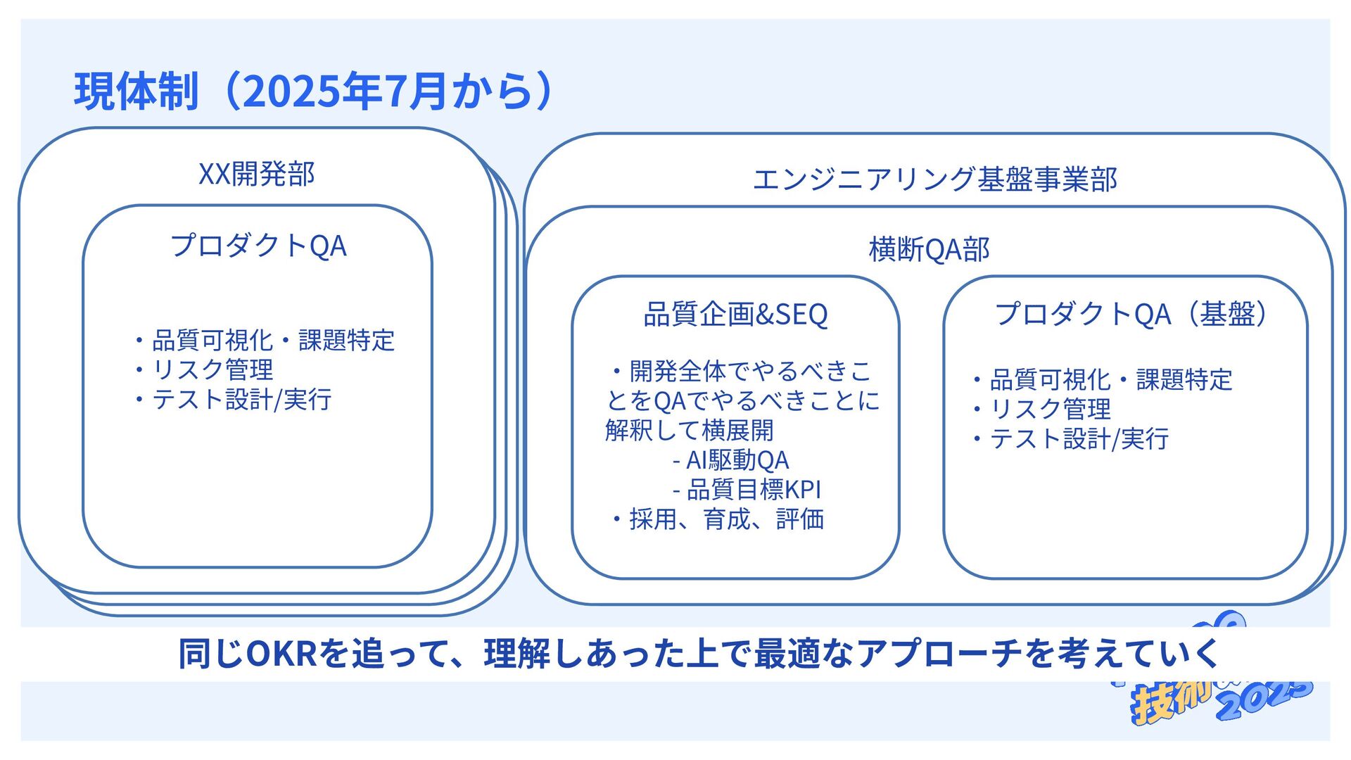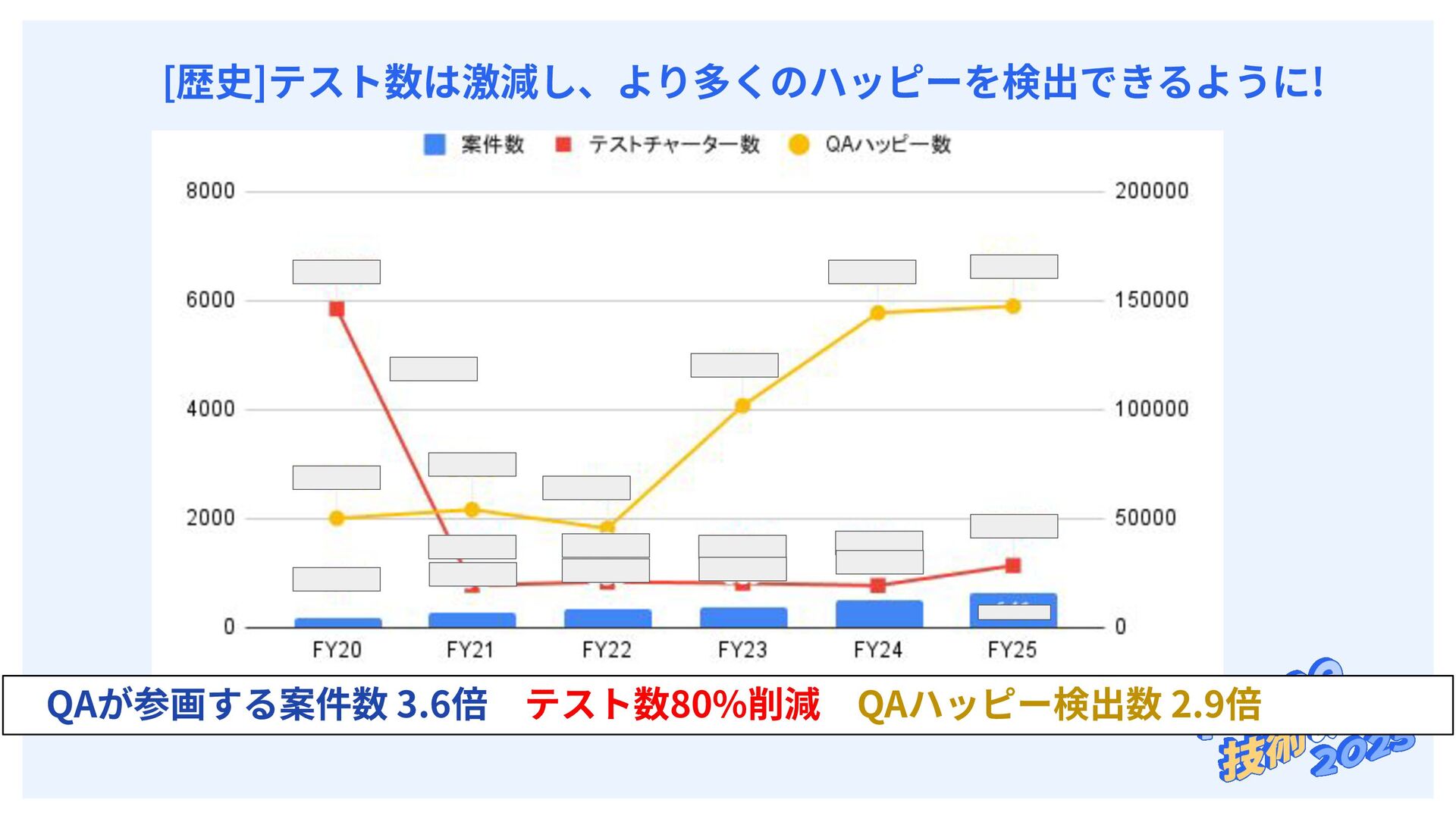 QA テスト フィードバック フィードバック フィードバック フィードバック QAテストも フィードバック の⼀つ もっと速く、 もっと⼿前で! freee QAの活動の特徴 ※重篤度:Severity ➢ 事象のひどさであり、ユーザーのもと で発⽣してはいけない度合いを⽰す • リリース頻度が⾼いので、リスクベースドテストを中⼼に⾏っている ◦ 各プロダクト、サービスごとに重篤度:Severity※を定め、開発チーム全体で認識をあわせている ◦ 重篤度が高い事象が起きる可能性(リスク)があるかを話し合い、高いリスクを確実に潰すようにテストする • QAエンジニアが上流⼯程から参加している ◦ QAエンジニアが各開発チームにアサインされているため、企画段階から関わり、さまざまな意見を言い合える環 境がある ◦ ドメイン知識のない領域にチャレンジするメンバーも少なくないため、開発チームで勉強会を開催するなど、チー ムで知識を高めていく活動も盛ん • リグレッションテストを⾃動化し、QAエンジニアも⾃動テストをコーディングし て活⽤している ◦ Playwrightなどいくつかのオープンソースを活用してfreee独自のテストフレームワークを構築している