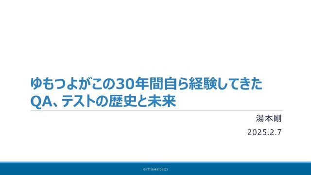 (ゆもつよ) q経歴 1991年 ⼯作機器メーカーで経理部に所属し、⽣産管理システムの受⼊テストに従事 1995年 メーカー系列ソフトハウスにてテストリーダーとしてアプリ開発に従事 財務会計のパッケージソフト、プリンタ、スキャナ、製造業受託開発(在庫管理、⽣産管理など)、顧客向けプロダクト 販売Webサイト構築など 2003年 ソフトウェアテストコンサルタントとなりテストプロセス改善コンサル、テストツール導⼊⽀援、テスト教育に従事 2010年 外資系ITソフトウェア部⾨にて、テスト管理、⾃動テスト、性能テストツールのプリセールスに従事 2014年 上記の外資系ITサービス部⾨にて、デリバリー案件のテストマネジメント、QA組織⽴ち上げのコンサル&デリバリーに従事 2017年 外資系損保 ソリューションデリバリー部テスティング課 課⻑(合併によるシステム統合のテストマネージャー兼務) 2019年 SaaS型クラウドサービス QAエンジニアに従事 q現在(2025年2⽉) 株式会社ytte Lab 代表取締役/コンサルタント フリー株式会社 QAマネージャー NPO法⼈ ASTER︓ソフトウェアテスト技術振興協会 理事、JSTQB(認定ソフトウェアテスト技術者資格制度)技術委員 ISO/IEC JTC1/SC7 WG26 エキスパート(ISO29119︓テストプロセス標準の策定) q著書 §書籍(6冊)︓ ビジネス主導のテストプロセス改善、現場の仕事がバリバリ進むテスト⼿法、ソフトウェアテストの基礎、 JSTQBソフトウェアテスト教科書、基本から学ぶソフトウェアテスト、ソフトウェアテスト293の鉄則 §学術論⽂︓ 「データ共有タスク間の順序組合せテストケース抽出⼿法」電気学会 論⽂誌C Vol. 137 No. 7 §国際学会︓ A Test Analysis Method for Black Box Testing Using AUT and Fault Knowledge など多数 §雑誌、ネット記事︓ ⽇経ITProなど多数