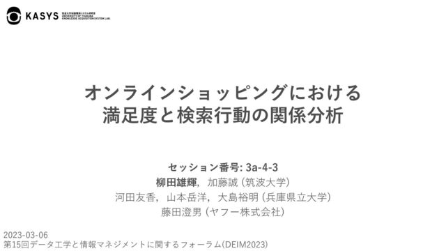 柳田雄輝, 加藤誠, 河田友香, 山本岳洋, 大島裕明, 藤田澄男. オンラインショッピングにおける満足度と検索行動の関係分析. 第15回データ工学と情報マネジメントに関するフォーラム(DEIM 2023). オンライン&岐阜県岐阜市, Mar. 2023.