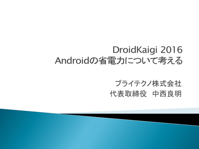 DroidKaigi 2016 1日目の発表スライドです。 Androidの省電力の歴史をふまえつつ、Android 6.0で導入されたDozeやApp Standby、5.0で導入されたJob Schedulerについて説明します。