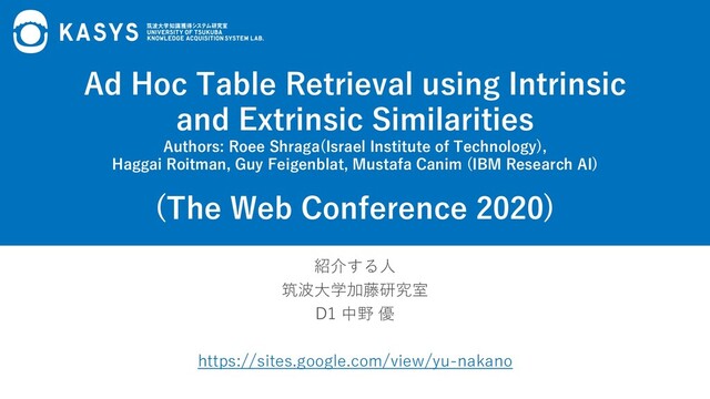 Roee Shraga(Israel Institute of Technology), Haggai Roitman, Guy Feigenblat, Mustafa Canim (IBM Research AI) (The Web Conference 2020) 紹介する⼈ 筑波⼤学加藤研究室 D1 中野 優 https://sites.google.com/view/yu-nakano