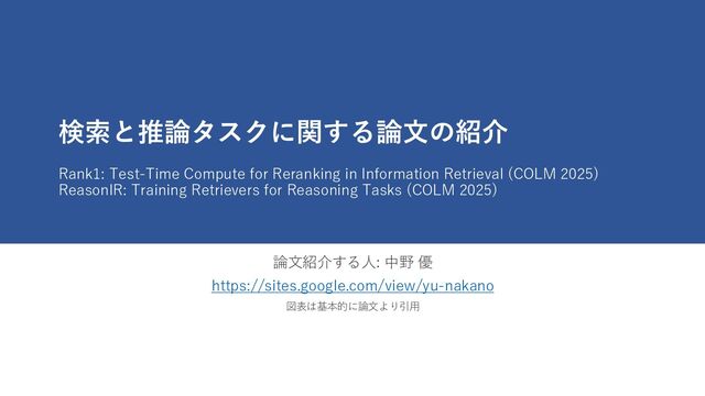 紹介した論文 Rank1: Test-Time Compute for Reranking in Information Retrieval (COLM 2025) ReasonIR: Training Retrievers for Reasoning Tasks (COLM 2025)