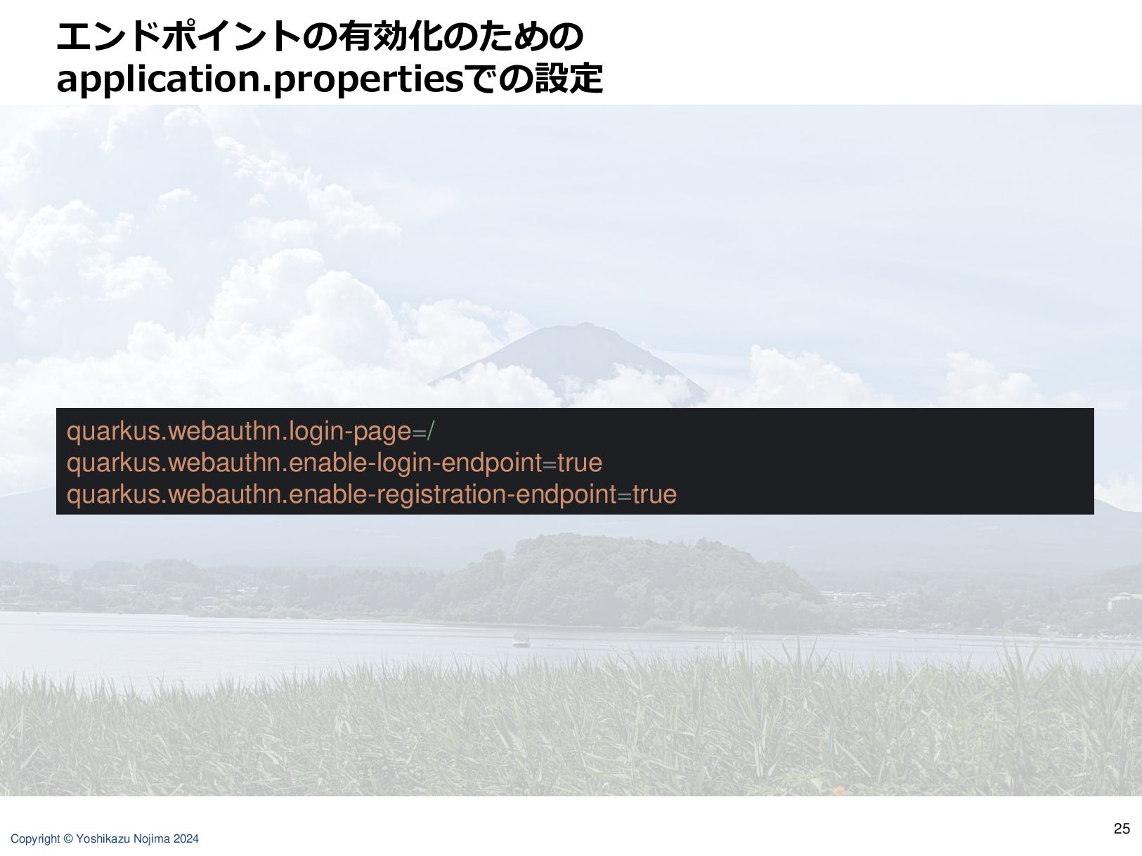 23. Copyright © Yoshikazu Nojima 2024 リファレンス • Quarkus公式のquickstartプロジェクト • https://github.com/quarkusio/quarkus-quickstarts/tree/main/security-webauthn-quickstart