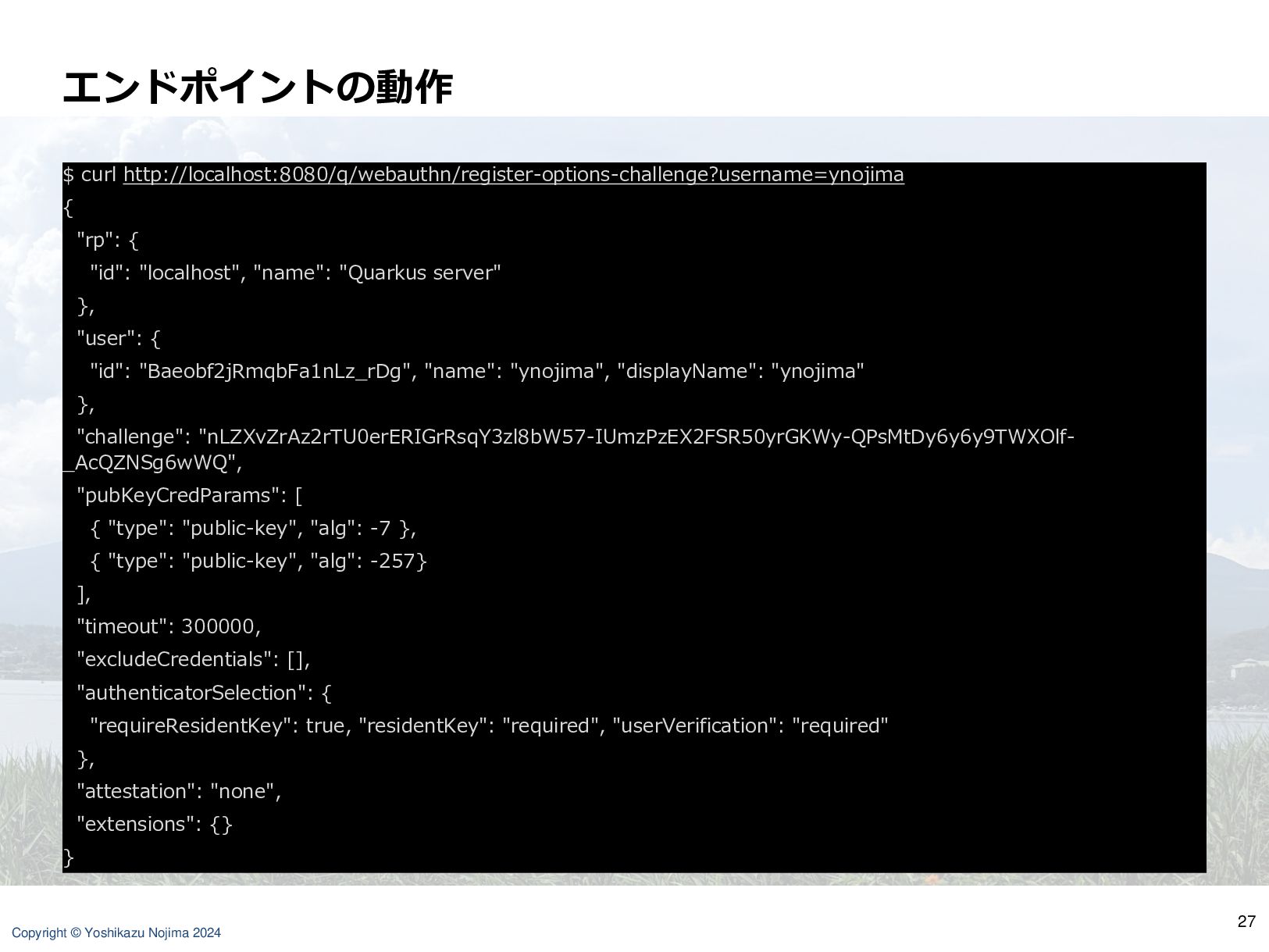 18. Copyright © Yoshikazu Nojima 2024 エンドポイントの動作 $ curl http://localhost:8080/q/webauthn/register-options-challenge?username=ynojima {