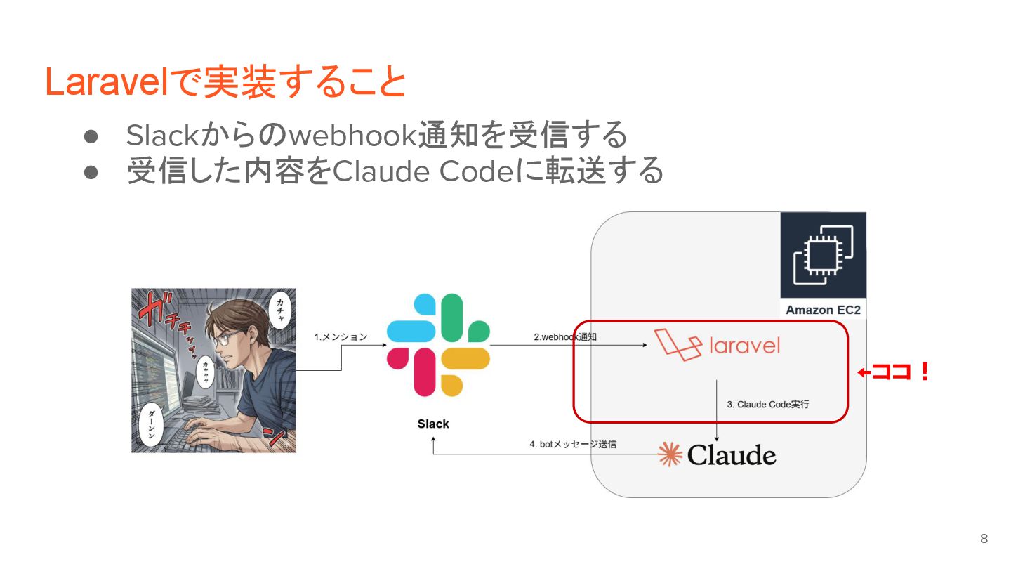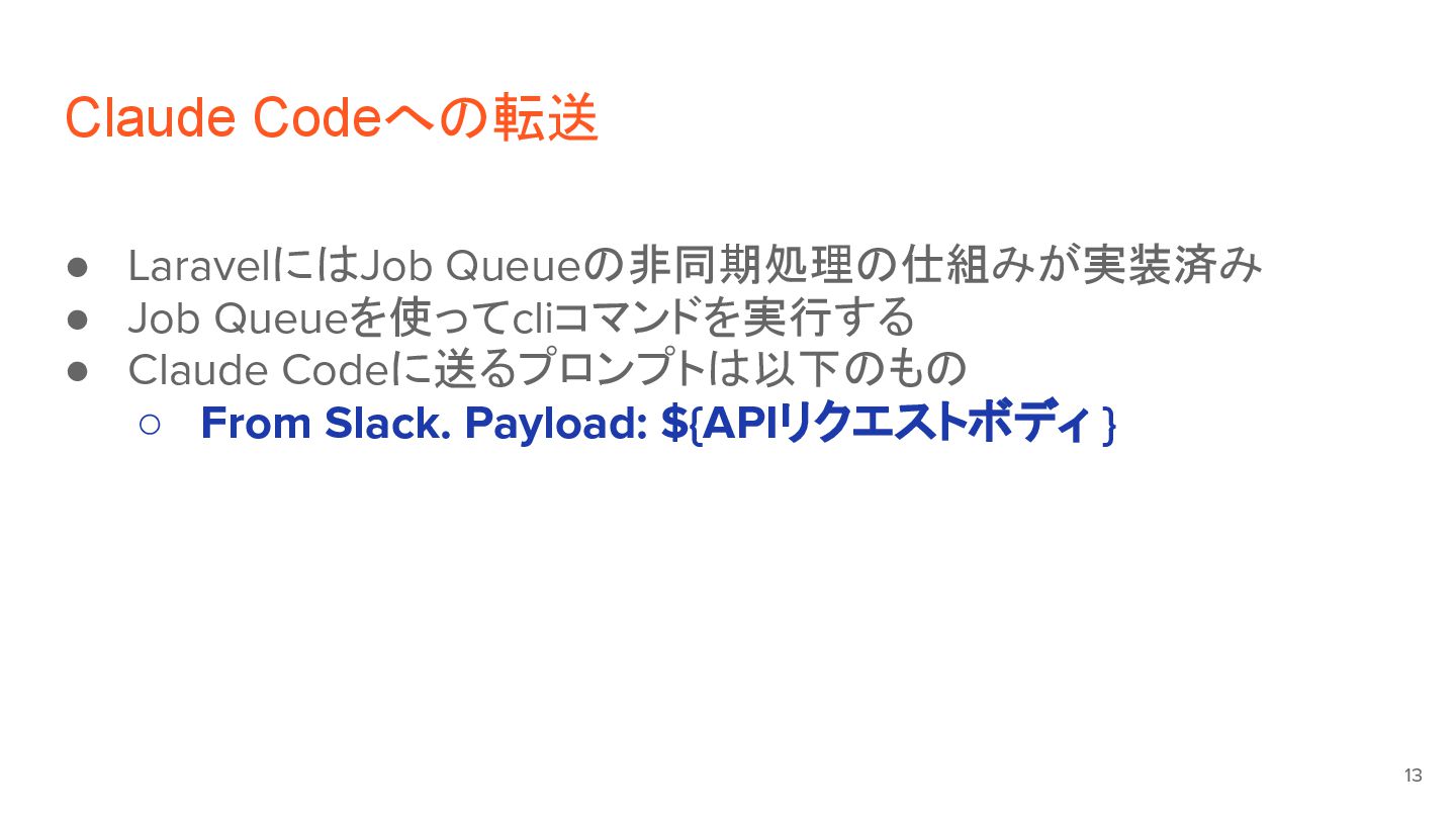 1. Claude Codeへの転送 13 • LaravelにはJob Queueの非同期処理の仕組みが実装済み • Job Queueを使ってcliコマンドを実行する •
