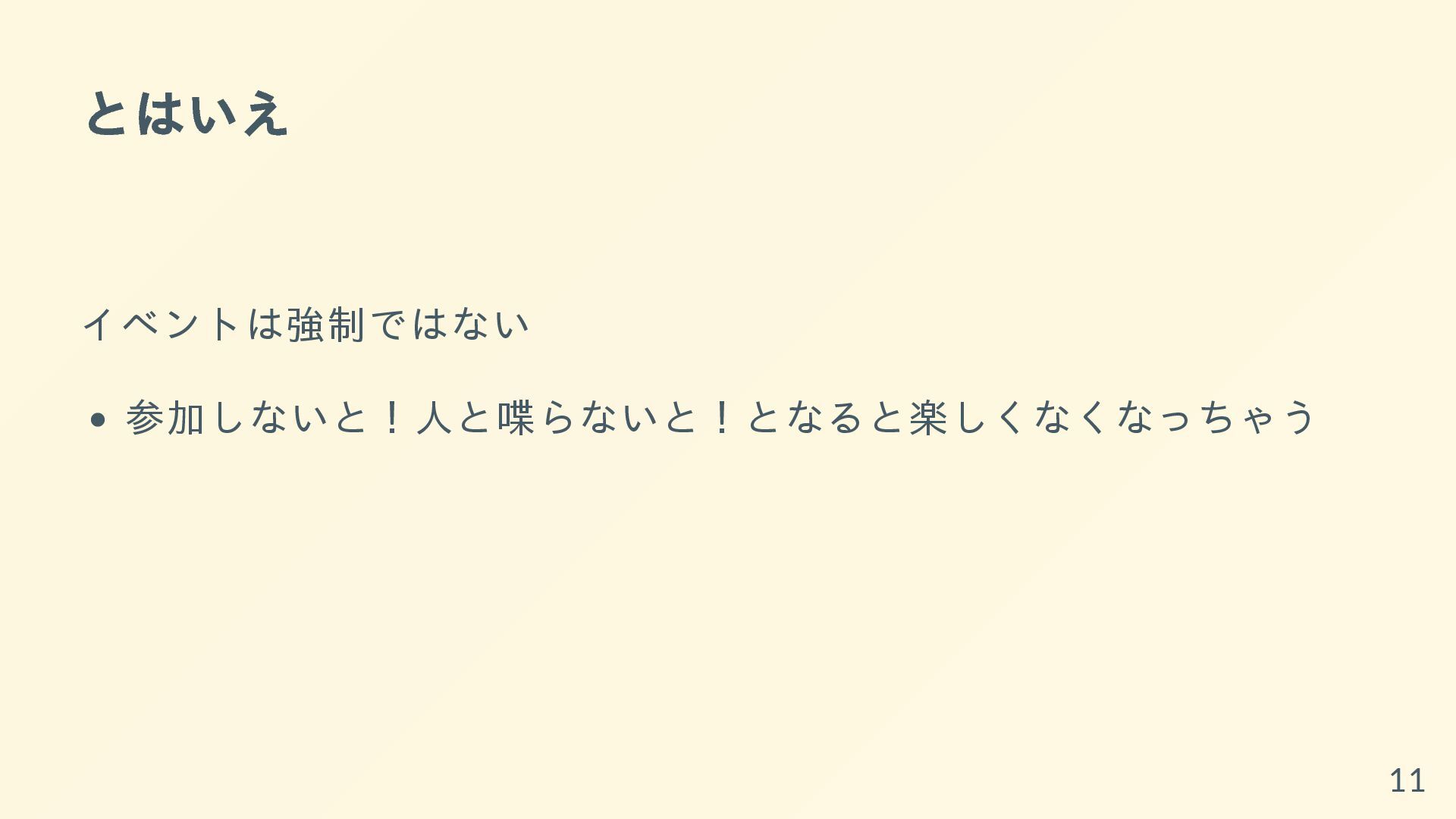 とはいえ イベントは強制ではない 参加しないと!人と喋らないと!となると楽しくなくなっちゃう 11