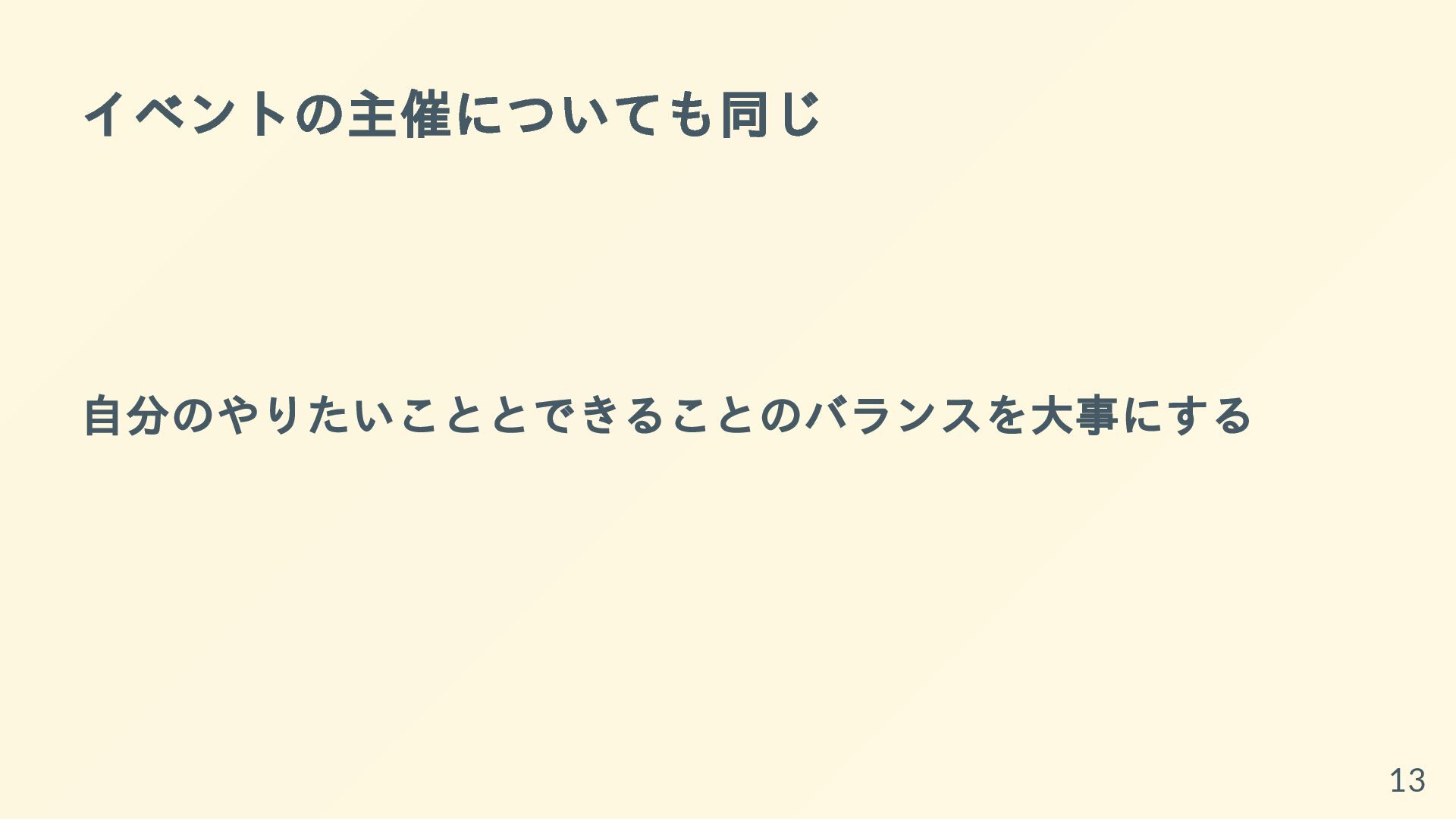 イベントの主催についても同じ 自分のやりたいこととできることのバランスを大事にする 13