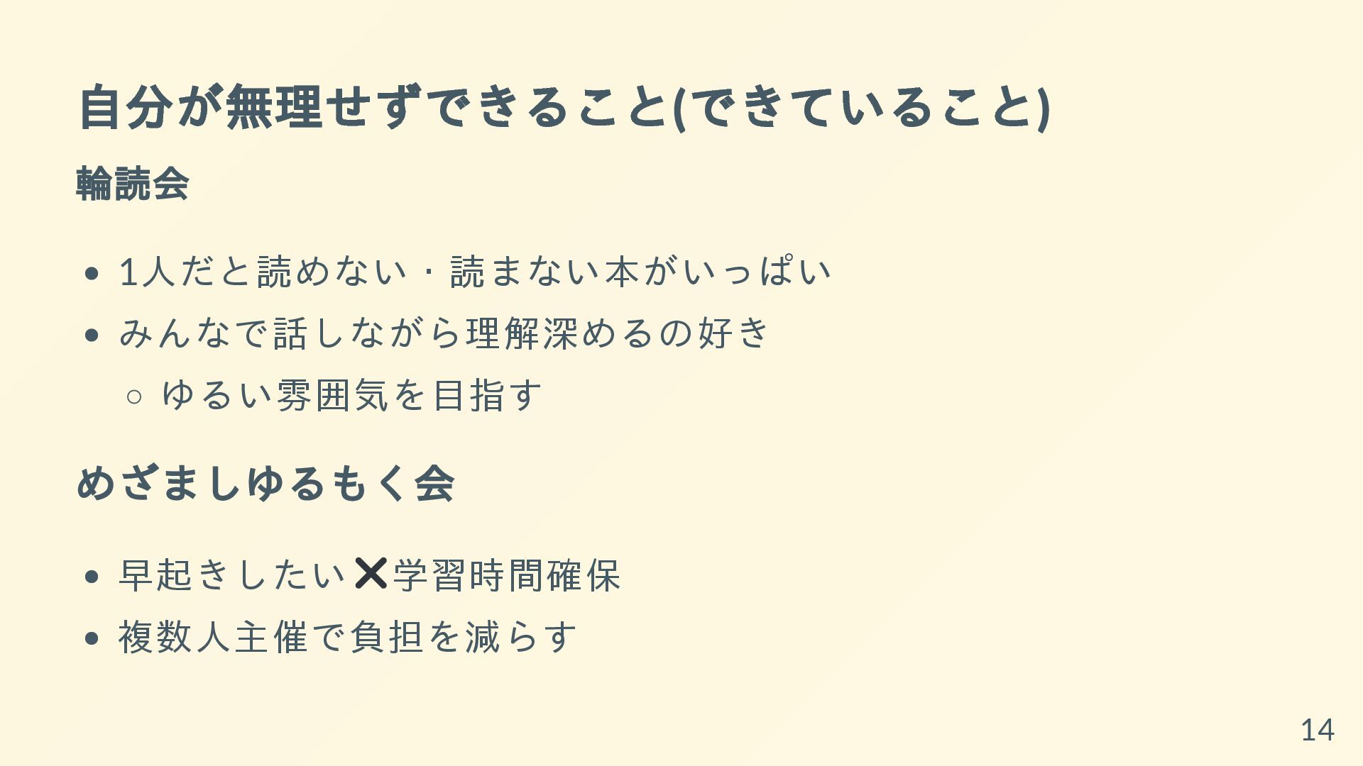 自分が無理せずできること( できていること) 輪読会 1人だと読めない・読まない本がいっぱい みんなで話しながら理解深めるの好き ゆるい雰囲気を目指す めざましゆるもく会 早起きしたい 学習時間確保 複数人主催で負担を減らす