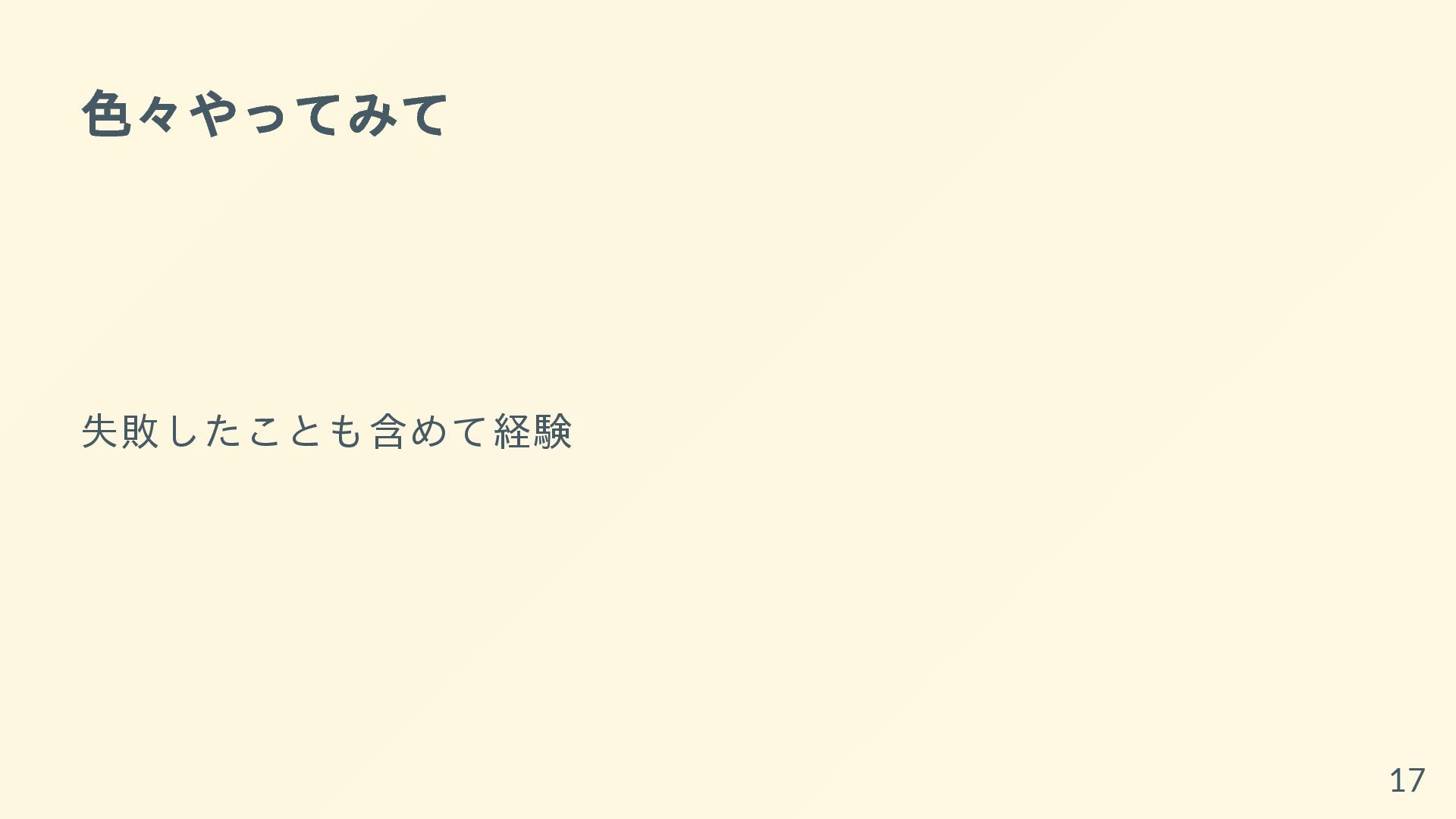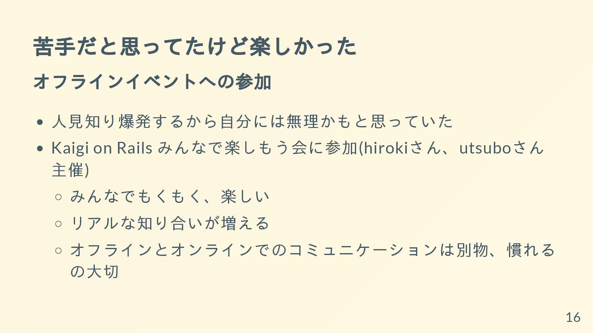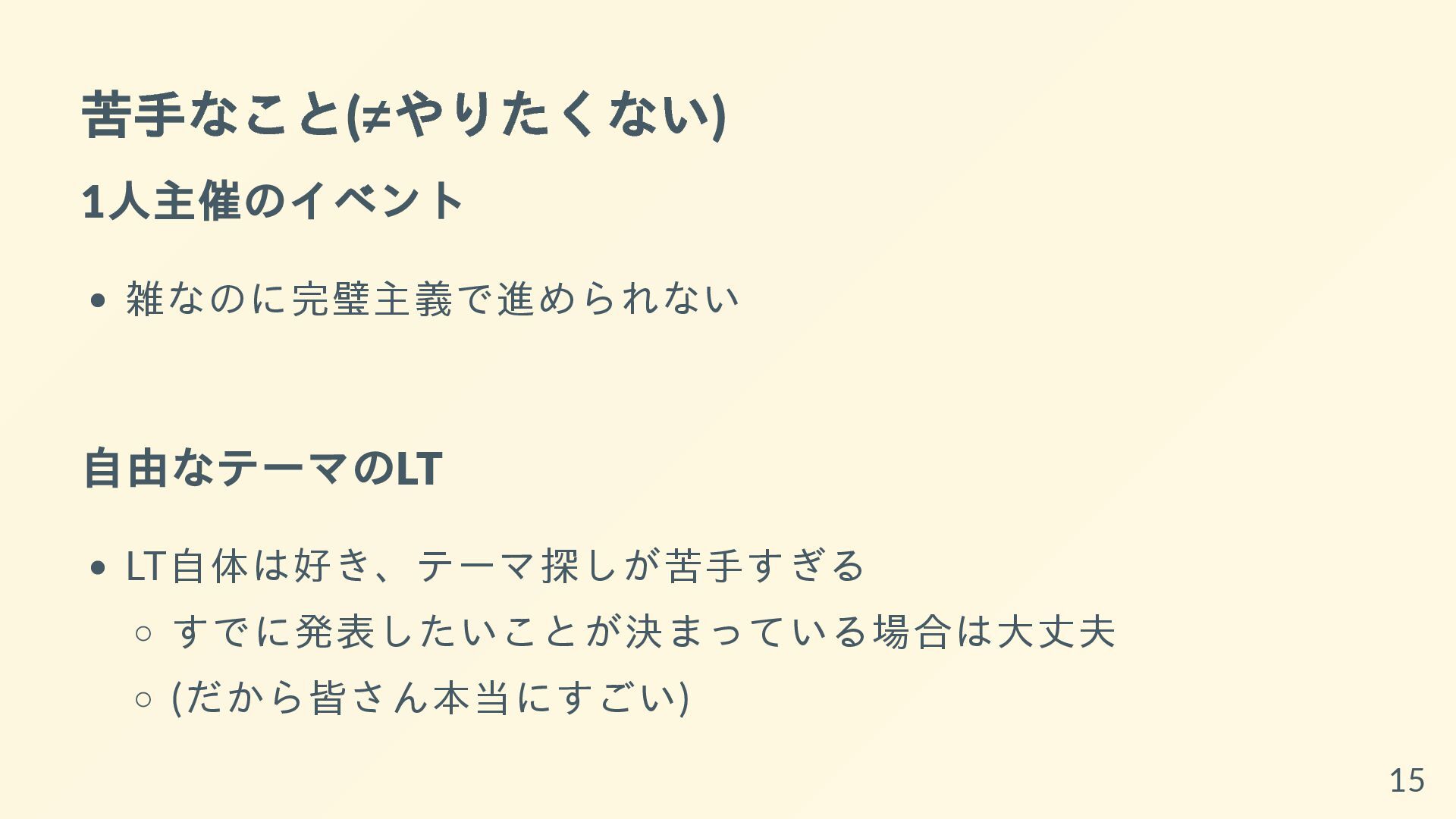 苦手なこと(≠ やりたくない) 1 人主催のイベント 雑なのに完璧主義で進められない 自由なテーマのLT LT自体は好き、テーマ探しが苦手すぎる すでに発表したいことが決まっている場合は大丈夫 (だから皆さん本当にすごい) 15