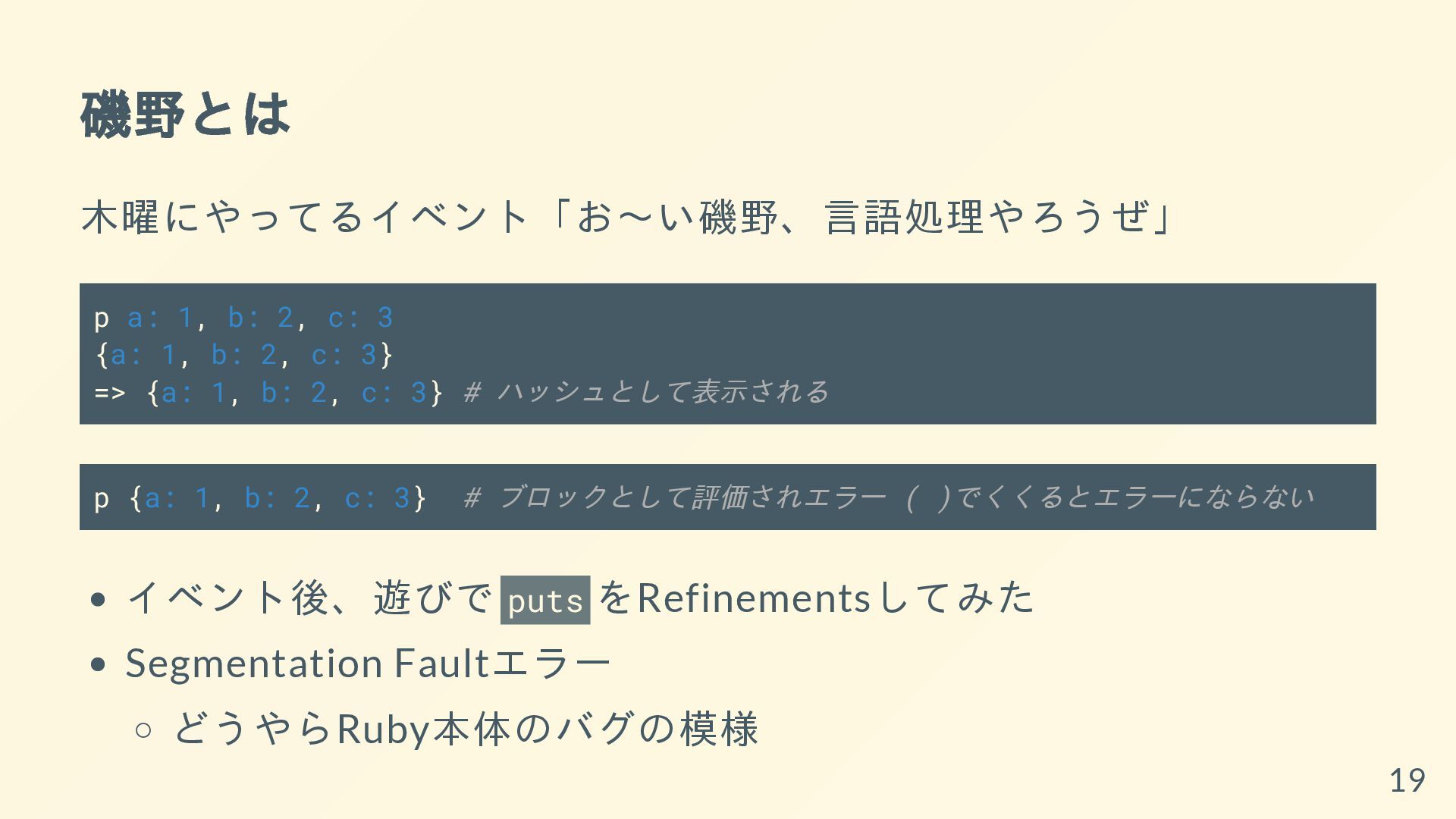 1, b: 2, c: 3} => {a: 1, b: 2, c: 3} # ハッシュとして表示される p {a: 1, b: 2, c: 3} # ブロックとして評価されエラー ( )でくくるとエラーにならない イベント後、遊びで puts をRefinementsしてみた Segmentation Faultエラー どうやらRuby本体のバグの模様 19