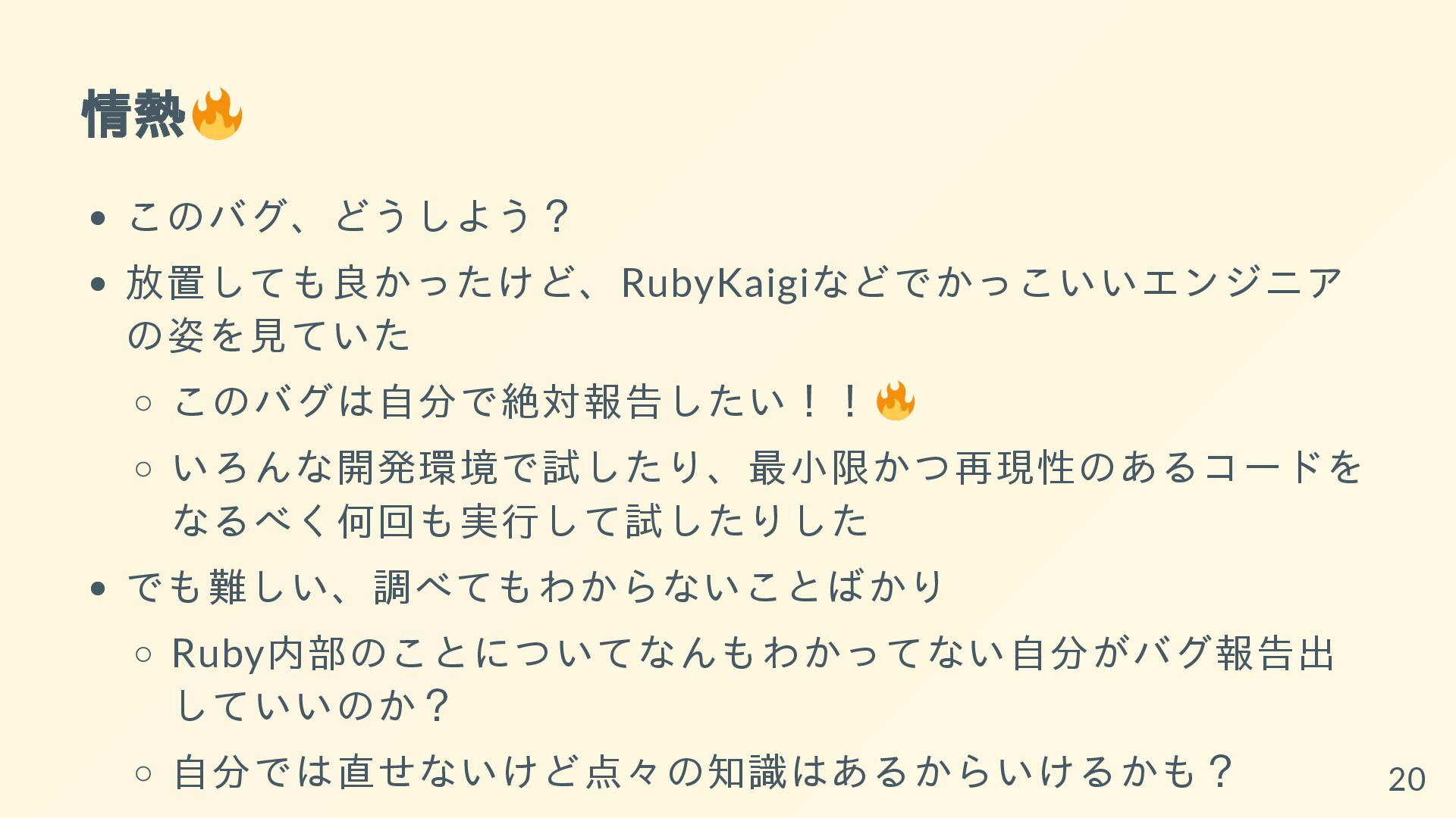 情熱 このバグ、どうしよう? 放置しても良かったけど、RubyKaigiなどでかっこいいエンジニア の姿を見ていた このバグは自分で絶対報告したい!! いろんな開発環境で試したり、最小限かつ再現性のあるコードを なるべく何回も実行して試したりした でも難しい、調べてもわからないことばかり Ruby内部のことについてなんもわかってない自分がバグ報告出 していいのか?