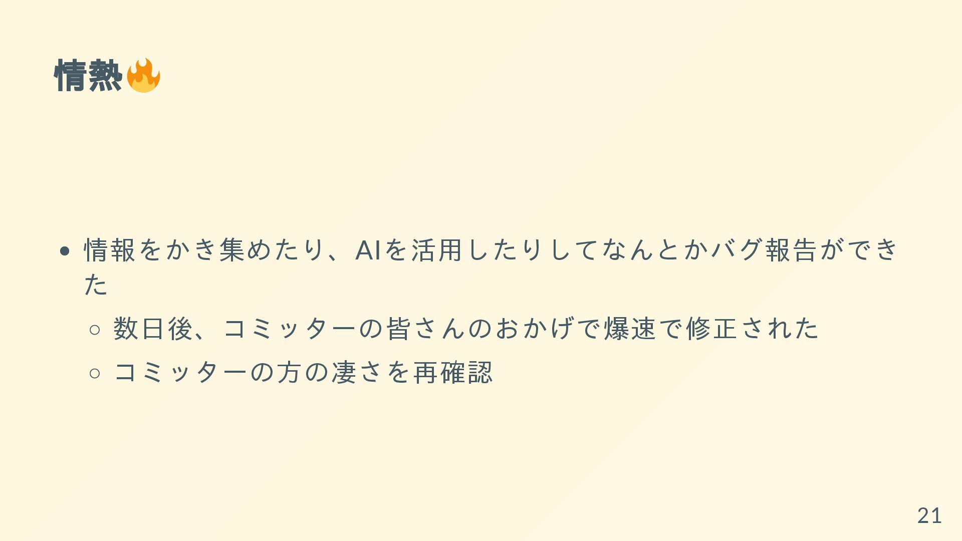 情熱 情報をかき集めたり、AIを活用したりしてなんとかバグ報告ができ た 数日後、コミッターの皆さんのおかげで爆速で修正された コミッターの方の凄さを再確認 21