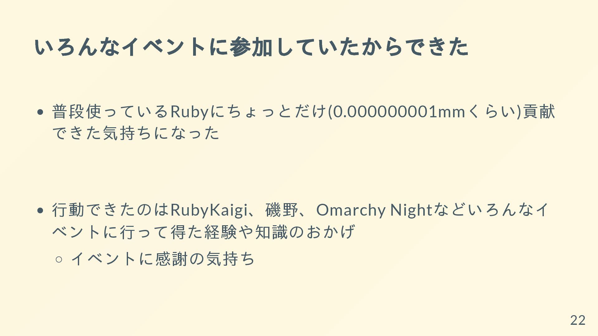 いろんなイベントに参加していたからできた 普段使っているRubyにちょっとだけ(0.000000001mmくらい)貢献 できた気持ちになった 行動できたのはRubyKaigi、磯野、Omarchy Nightなどいろんなイ ベントに行って得た経験や知識のおかげ イベントに感謝の気持ち 22