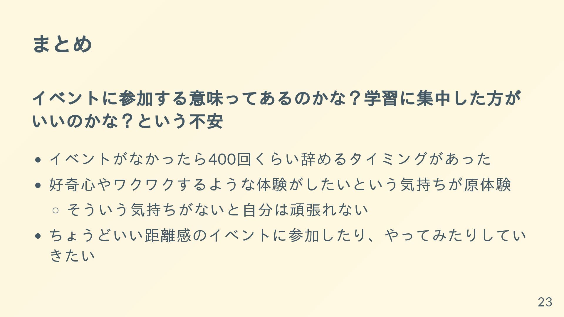 まとめ イベントに参加する意味ってあるのかな?学習に集中した方が いいのかな?という不安 イベントがなかったら400回くらい辞めるタイミングがあった 好奇心やワクワクするような体験がしたいという気持ちが原体験 そういう気持ちがないと自分は頑張れない ちょうどいい距離感のイベントに参加したり、やってみたりしてい きたい 23