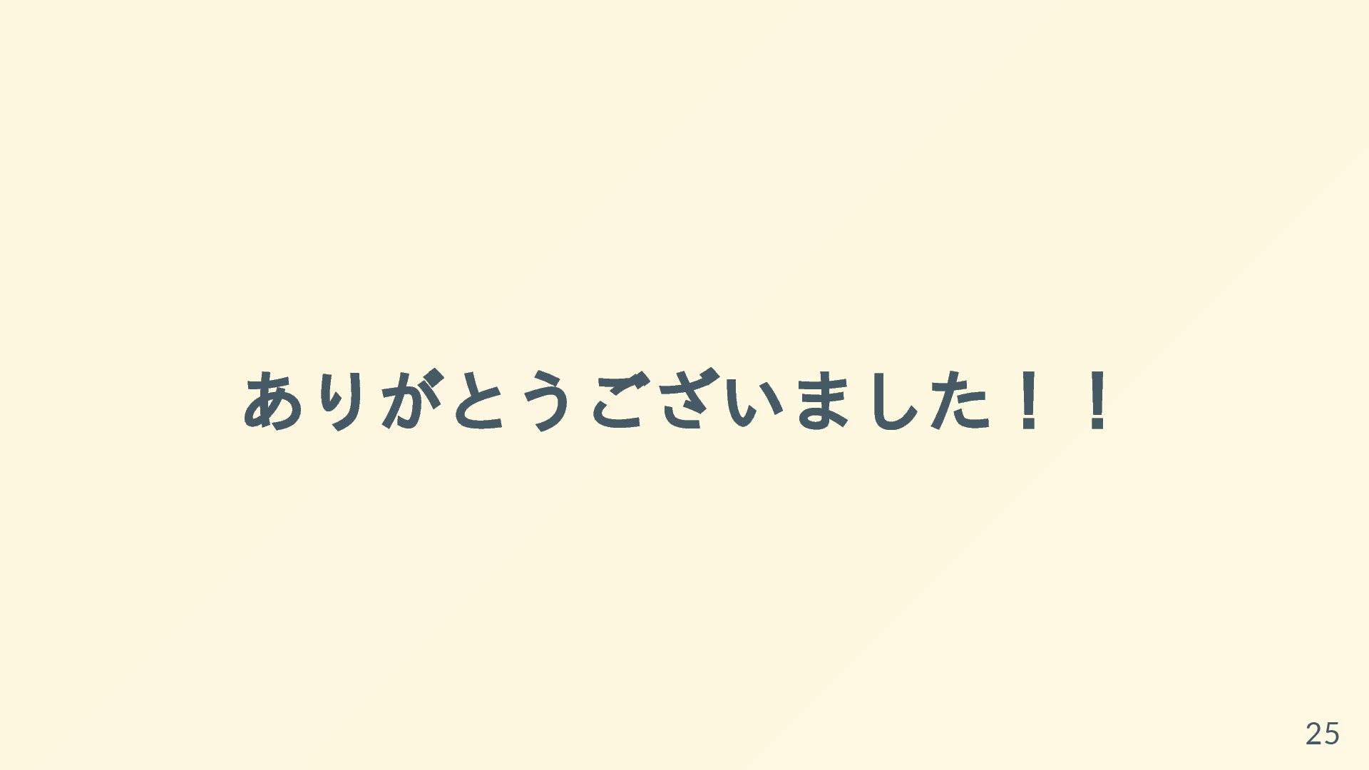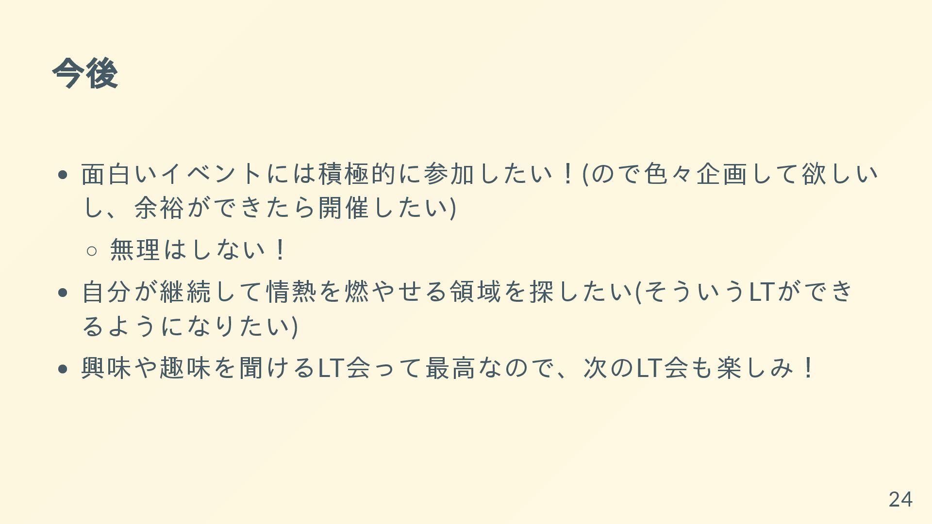 今後 面白いイベントには積極的に参加したい!(ので色々企画して欲しい し、余裕ができたら開催したい) 無理はしない! 自分が継続して情熱を燃やせる領域を探したい(そういうLTができ るようになりたい) 興味や趣味を聞けるLT会って最高なので、次のLT会も楽しみ! 24