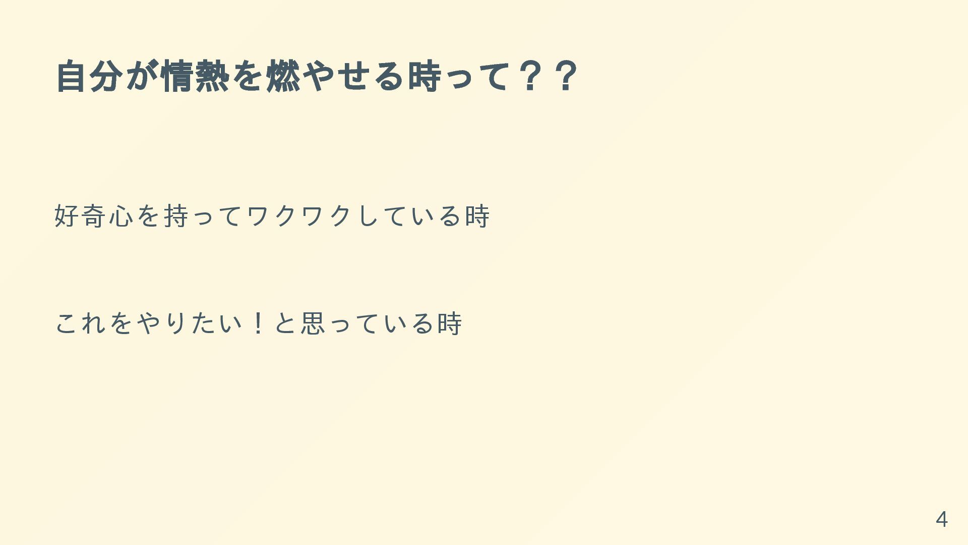 自分が情熱を燃やせる時って?? 好奇心を持ってワクワクしている時 これをやりたい!と思っている時 4