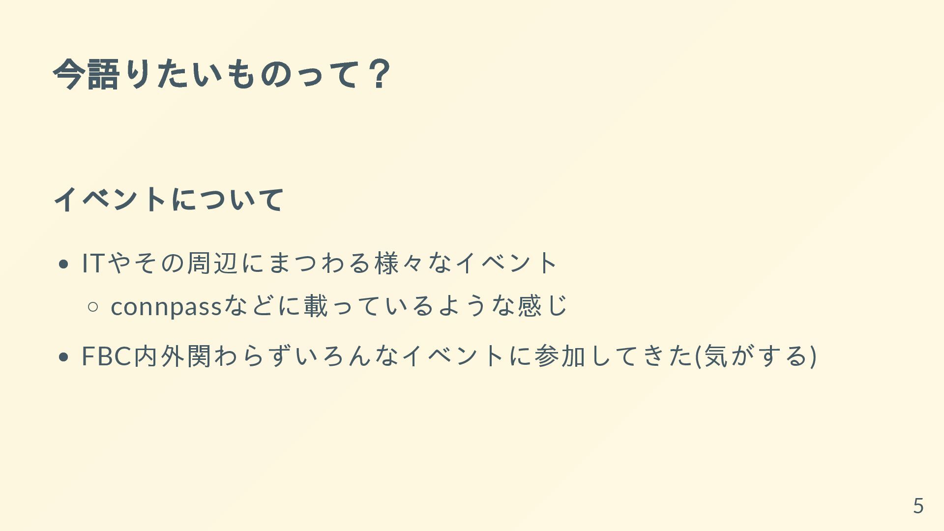 今語りたいものって? イベントについて ITやその周辺にまつわる様々なイベント connpassなどに載っているような感じ FBC内外関わらずいろんなイベントに参加してきた(気がする) 5