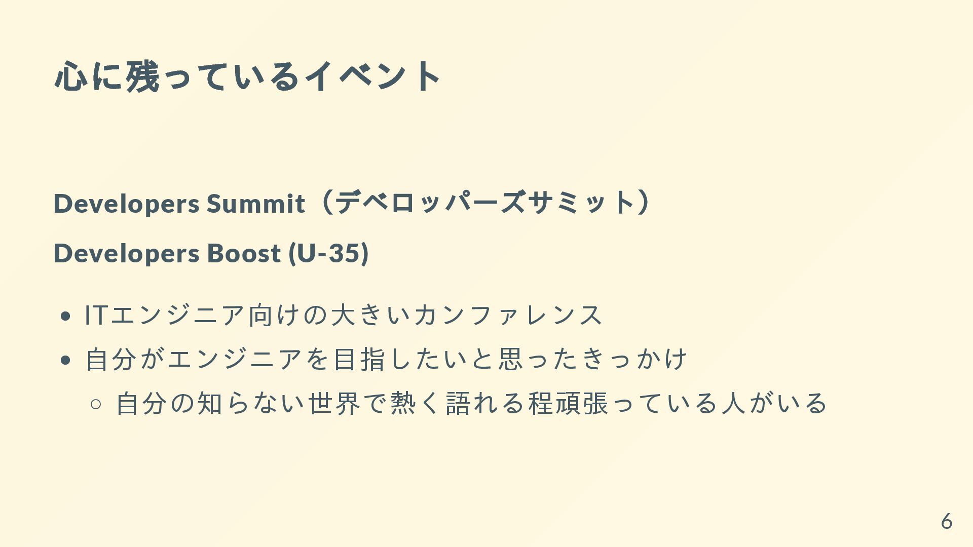 心に残っているイベント Developers Summit (デベロッパーズサミット) Developers Boost (U-35) ITエンジニア向けの大きいカンファレンス 自分がエンジニアを目指したいと思ったきっかけ 自分の知らない世界で熱く語れる程頑張っている人がいる