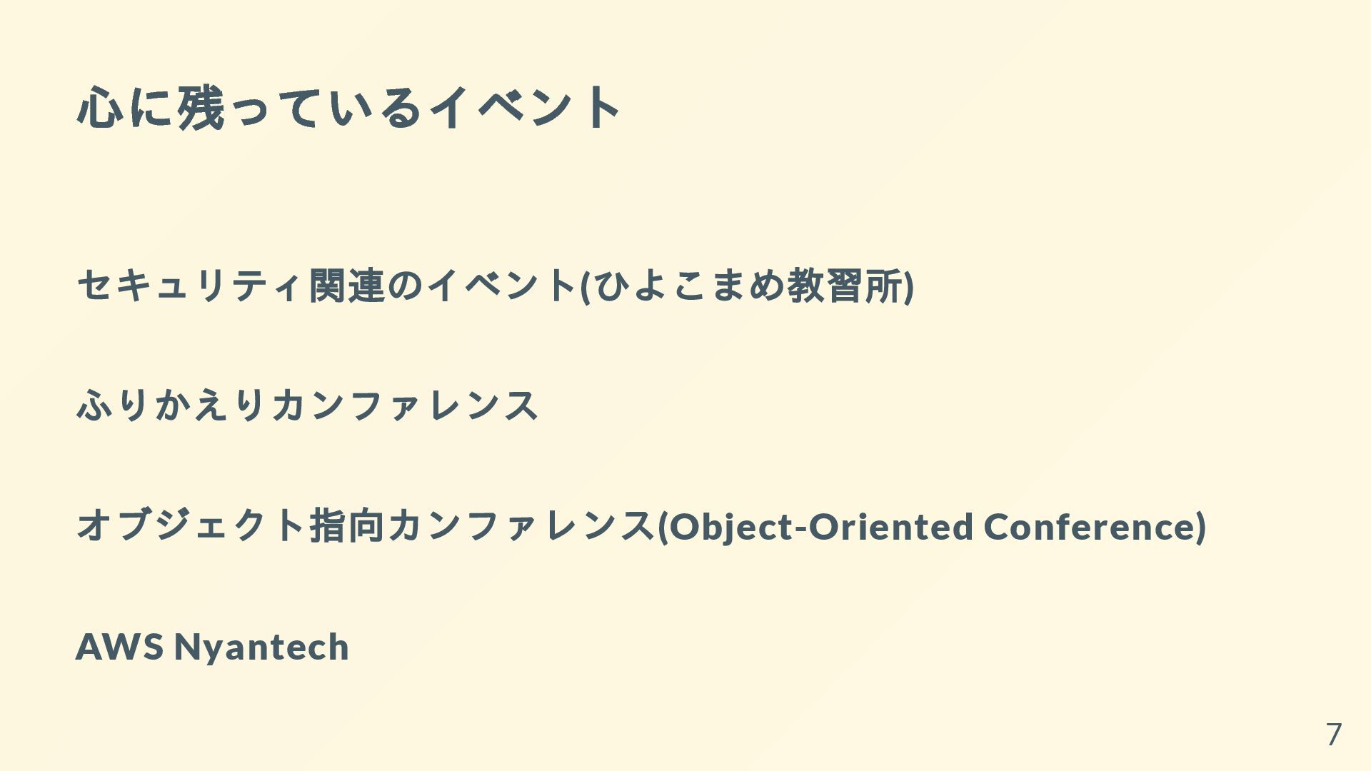 心に残っているイベント セキュリティ関連のイベント( ひよこまめ教習所) ふりかえりカンファレンス オブジェクト指向カンファレンス(Object-Oriented Conference) AWS Nyantech 7