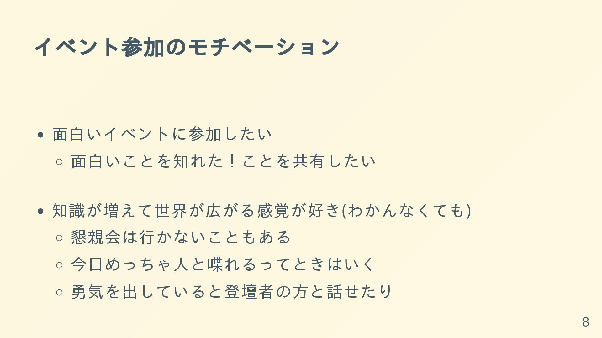 イベント参加のモチベーション 面白いイベントに参加したい 面白いことを知れた!ことを共有したい 知識が増えて世界が広がる感覚が好き(わかんなくても) 懇親会は行かないこともある 今日めっちゃ人と喋れるってときはいく 勇気を出していると登壇者の方と話せたり 8