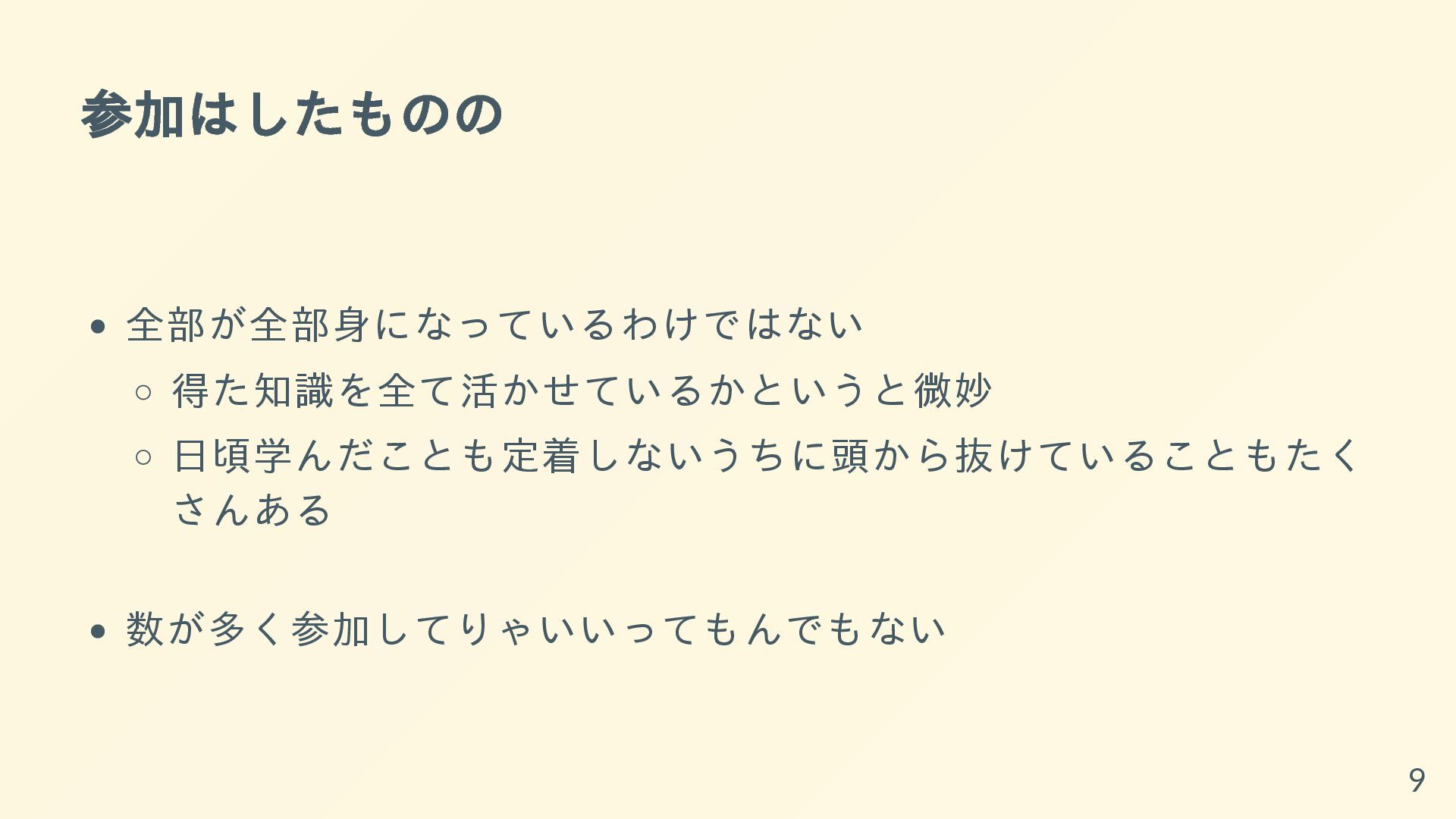 参加はしたものの 全部が全部身になっているわけではない 得た知識を全て活かせているかというと微妙 日頃学んだことも定着しないうちに頭から抜けていることもたく さんある 数が多く参加してりゃいいってもんでもない 9