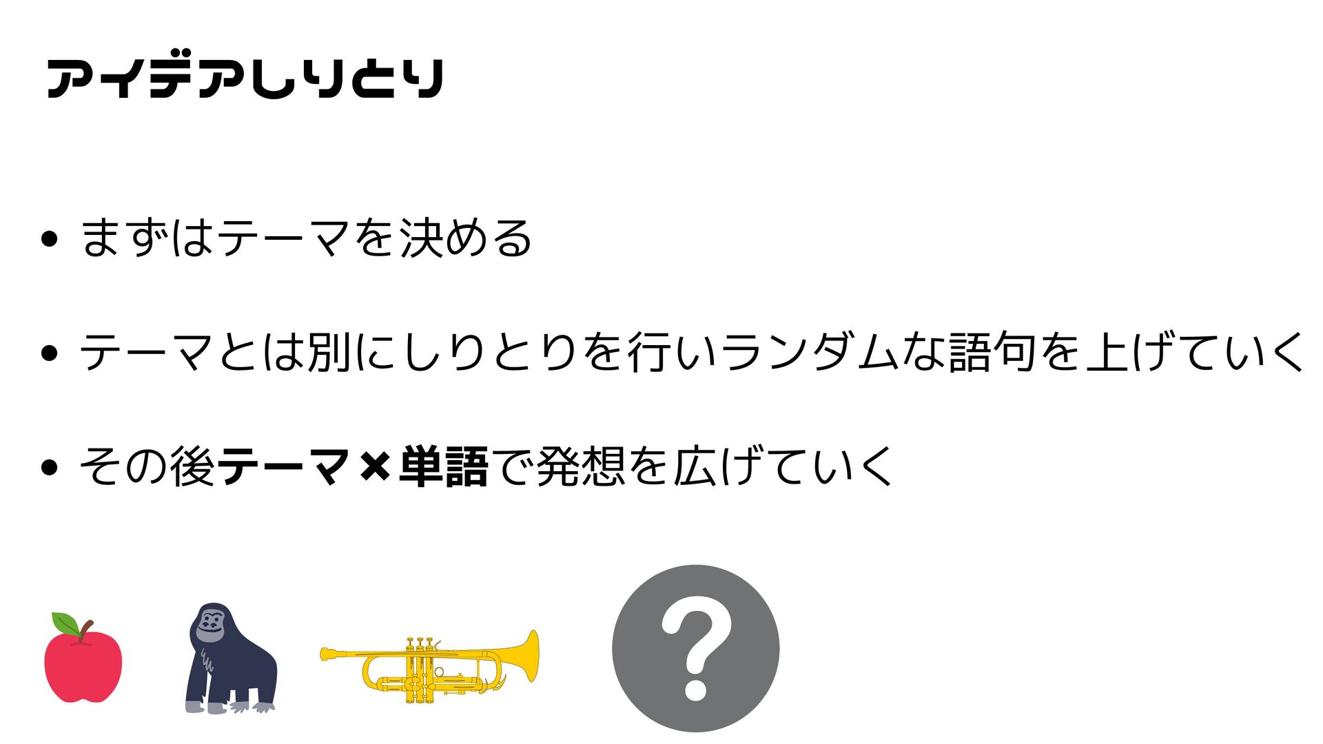 アイデアしりとり まずはテーマを決める テーマとは別にしりとりを行いランダムな語句を上げていく その後テーマ✖️ 単語で発想を広げていく