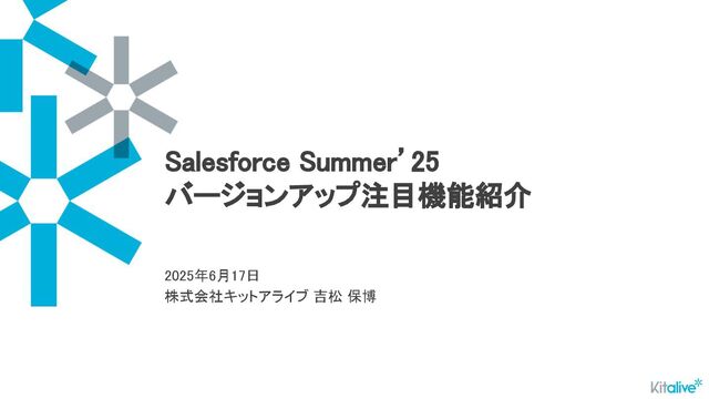 LightningElement } from 'lwc'; import '@salesforce/lightning-types'; import type LightningButton from 'lightning/button'; export default class ComponentExample extends LightningElement { submitLabel: string = 'Submit'; } Copyright © Kitalive Inc. All Rights Reserved. 概要 • TypeScriptは、JavaScriptの型付きスーパーセットであり、より堅牢なプログ ラミングを可能にする。 • 開発者はこれらの型定義を Lightning Webコンポーネント( LWC)にインポー トすることで利用できる。 • 例えば、JavaScriptファイルの上部に import { LightningElement } from 'lwc'; import '@salesforce/lightning-types'; import type LightningButton from 'lightning/button';といった形式で型をインポート • この機能はデベロッパープレビュー版として提供中 メリット • より堅牢な型チェックとハンドリングを提供し、コードの品質を向上させる。 • エラーを早期に発見し、コードをより安定させるのに役立つ。 • Visual Studio Codeにおけるオートコンプリートや型チェックを通じて開発 者の生産性を向上させる。 • 開発プロセスをよりスムーズで信頼性の高いものにし、 エンタープライズ規模 のアプリケーション開発に対応可能にする。 • 開発者がより良いコードを記述し、パフォーマンスを改善し、エンタープライズ 規模のSalesforceプロジェクトに対応する準備を整えるのに役立つ。 Lightning ベースコンポーネントで TypeScript を使用する