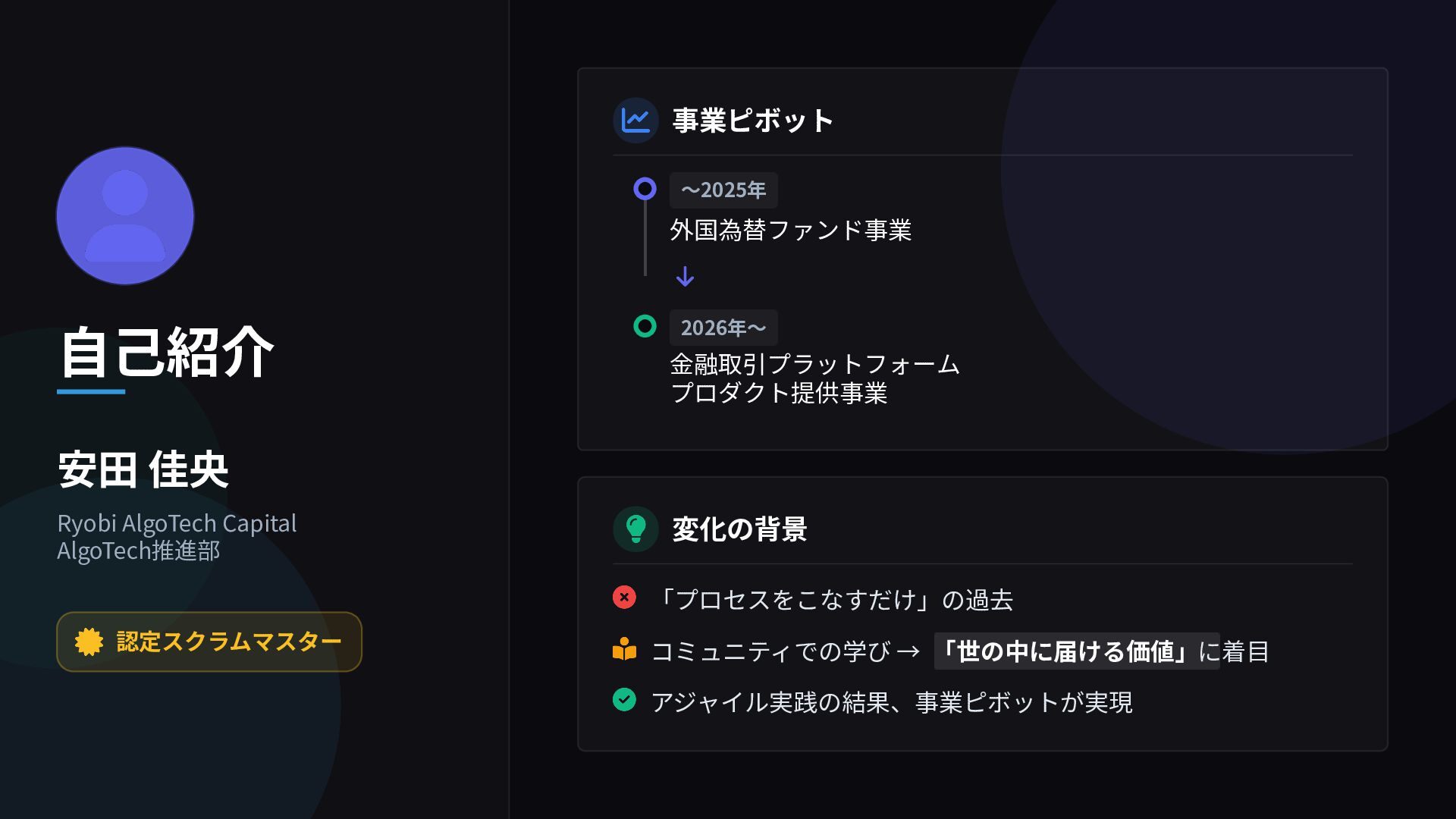 安⽥ 佳央 Ryobi AlgoTech Capital AlgoTech推進部 認定スクラムマスター ⾃⼰紹介 事業ピボット 変化の背景