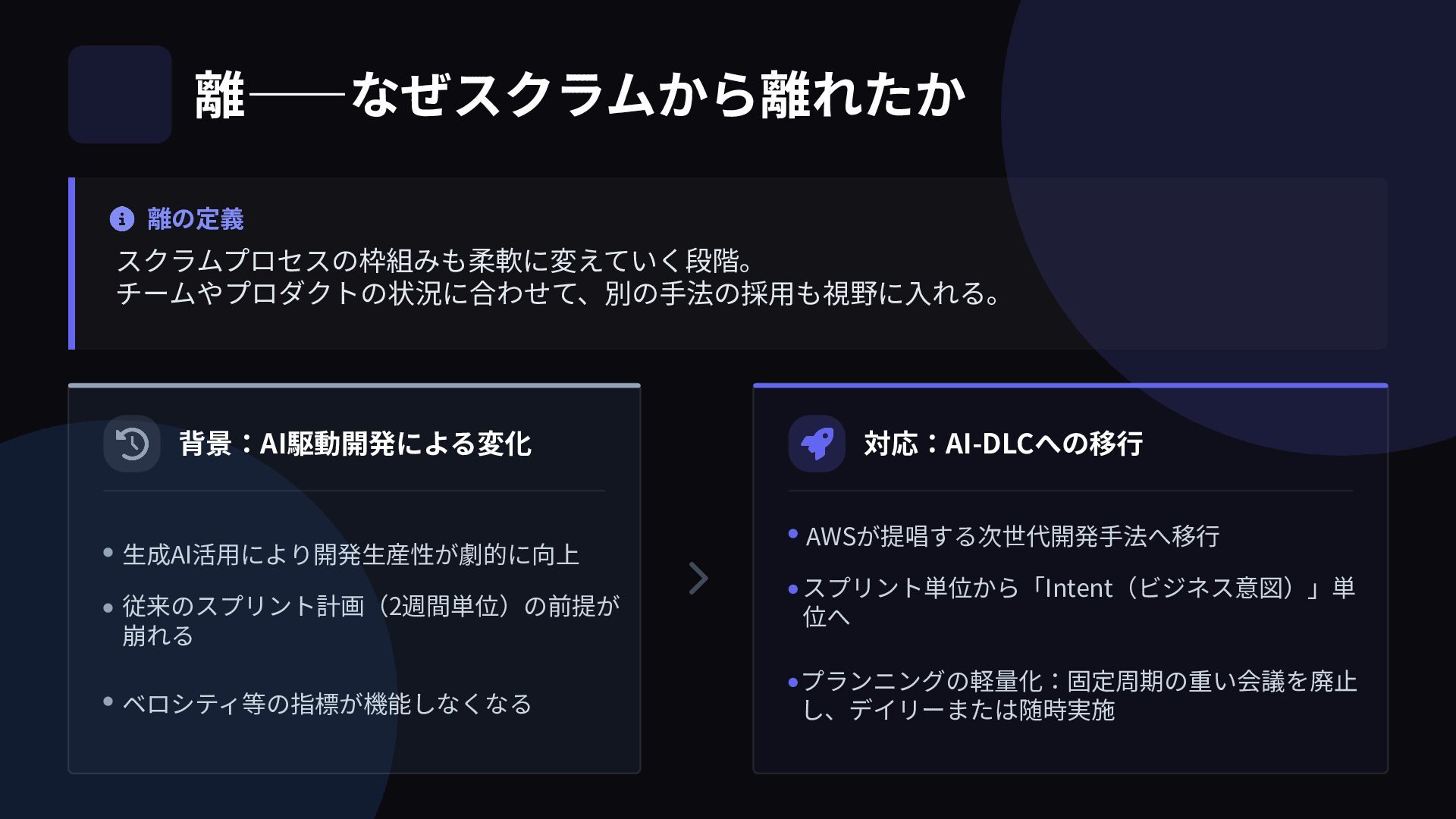 離――なぜスクラムから離れたか 離の定義 スクラムプロセスの枠組みも柔軟に変えていく段階。 チームやプロダクトの状況に合わせて、別の⼿法の採⽤も視野に⼊れる。 背景:AI駆動開発による変化 対応:AI-DLCへの移⾏ ⽣成AI活⽤により開発⽣産性が劇的に向上 従来のスプリント計画(2週間単位)の前提が 崩れる ベロシティ等の指標が機能しなくなる